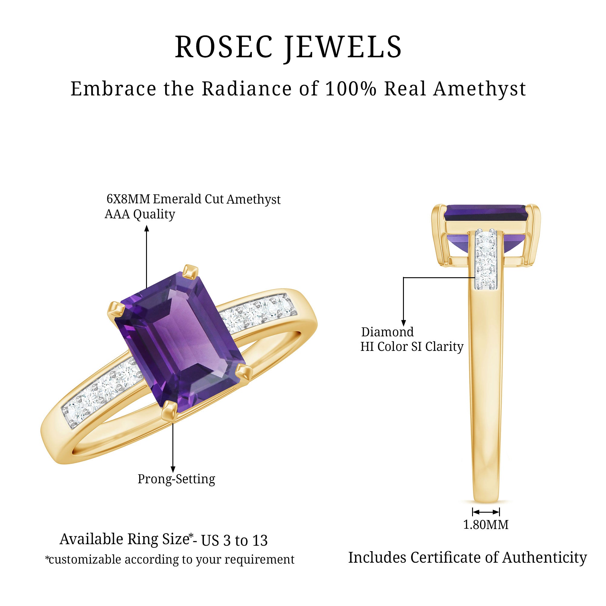 Make a statement with this stunning Amethyst Ring! Featuring a 6X8 MM Octagon Cut Amethyst in a Prong Setting and Diamond Side Stones on a Solitaire Ring, this piece is sure to turn heads. This Ring can also be the perfect Engagement Ring for your loved one. With a total weight of 1.75 Carats and AAA Clarity, you can trust that all our certified gemstones undergo rigorous quality checks to ensure their exceptional quality.