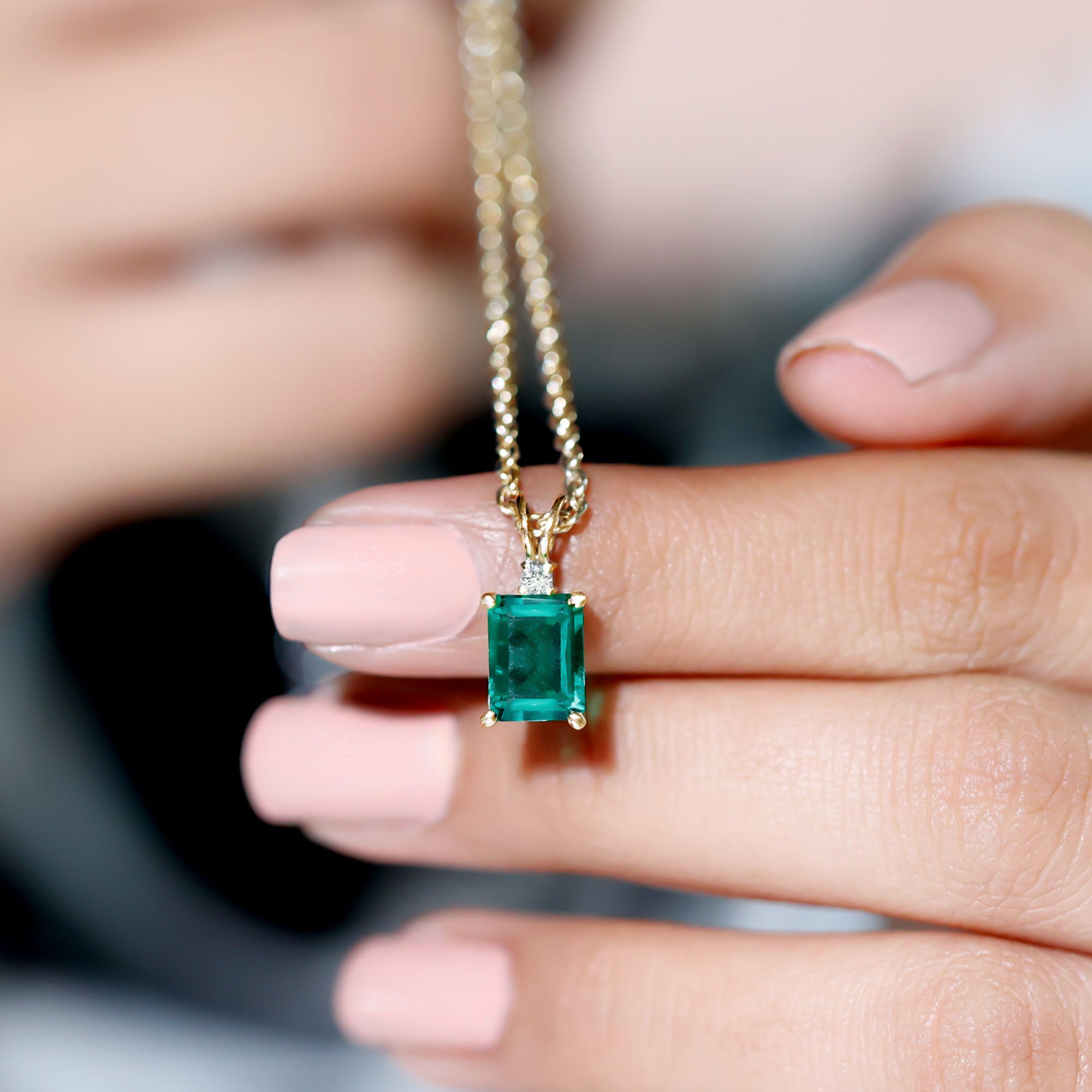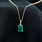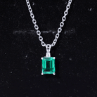 Bright green beauty shines through this Lab Grown Emerald Pendant, designed to add charm and elegance to any moment. At the center sits a vibrant 6X8 MM emerald cut lab created emerald, glowing with rich color and classic style. Just above it rests a small round moissanite, giving the Solitaire Pendant a gentle sparkle that perfectly highlights the emerald. The cute rabbit ear bail adds a touch of personality, making this piece stand out in a sweet and stylish way. Crafted with AAAA quality lab grown emerald and D-VS1 quality moissanite, this Emerald Cut Necklace offers both brilliance and durability. It hangs gracefully from a chain, making it easy to pair with your favorite outfits, whether you are dressing up for a special occasion or adding a hint of elegance to your everyday look. Thoughtful and eye-catching, this Green Emerald Necklace makes a wonderful gift for birthdays, anniversaries, or any meaningful celebration. Its bright color and unique design make it a memorable piece that brings joy to anyone who wears it.