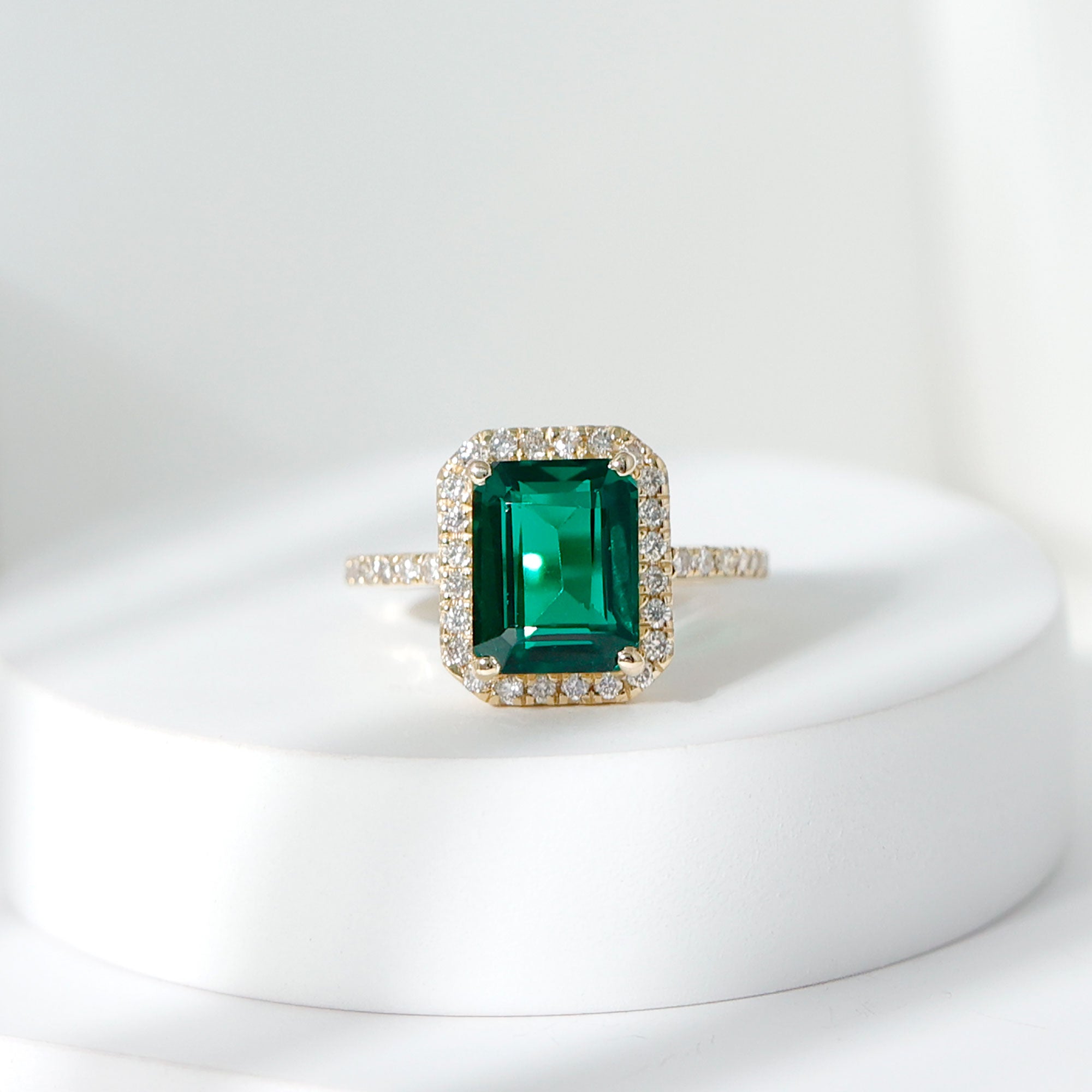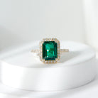 Add a touch of elegance and beauty to your look with this exquisite Lab Created Emerald Engagement Ring. This simple yet stunning ring features a 7X9 MM Emerald Cut Lab Grown Emerald that is sure to brighten up even the dullest of days. The Created Emerald is further enhanced by a delicate Diamond halo and side stones, adding a touch of sparkle and glamour to the Green Stone Ring. Every detail of this peace is carefully made to bring comfort, beauty, and meaning together. This Emerald Cut Engagement Ring is designed to symbolize love, promise, and new beginnings. It is elegant, heartfelt, and created to be treasured not just as jewelry, but as a reminder of the special story it represents. Crafted with care and precision, this Emerald and Diamond Engagement Ring is made to be beautiful yet comfortable for everyday wear. The smooth design and fine workmanship make it easy to wear all day long. Available in US sizes 3 to 13, this Halo Ring comes in a beautifully packaged jewelry box, making it perfect for gifting. Whether for a proposal or a special moment, it is a lovely choice.