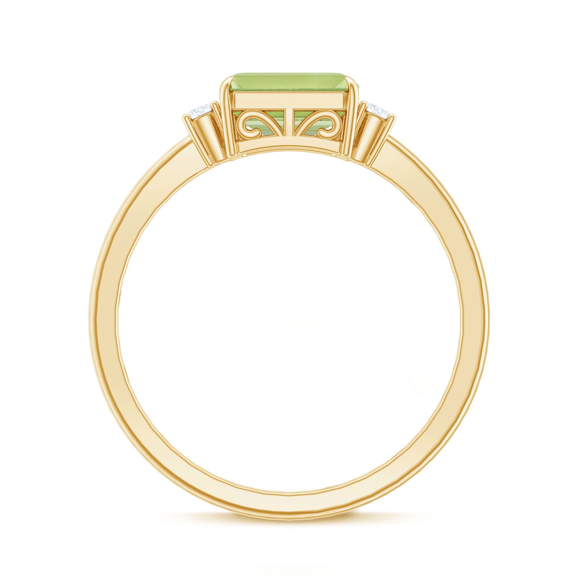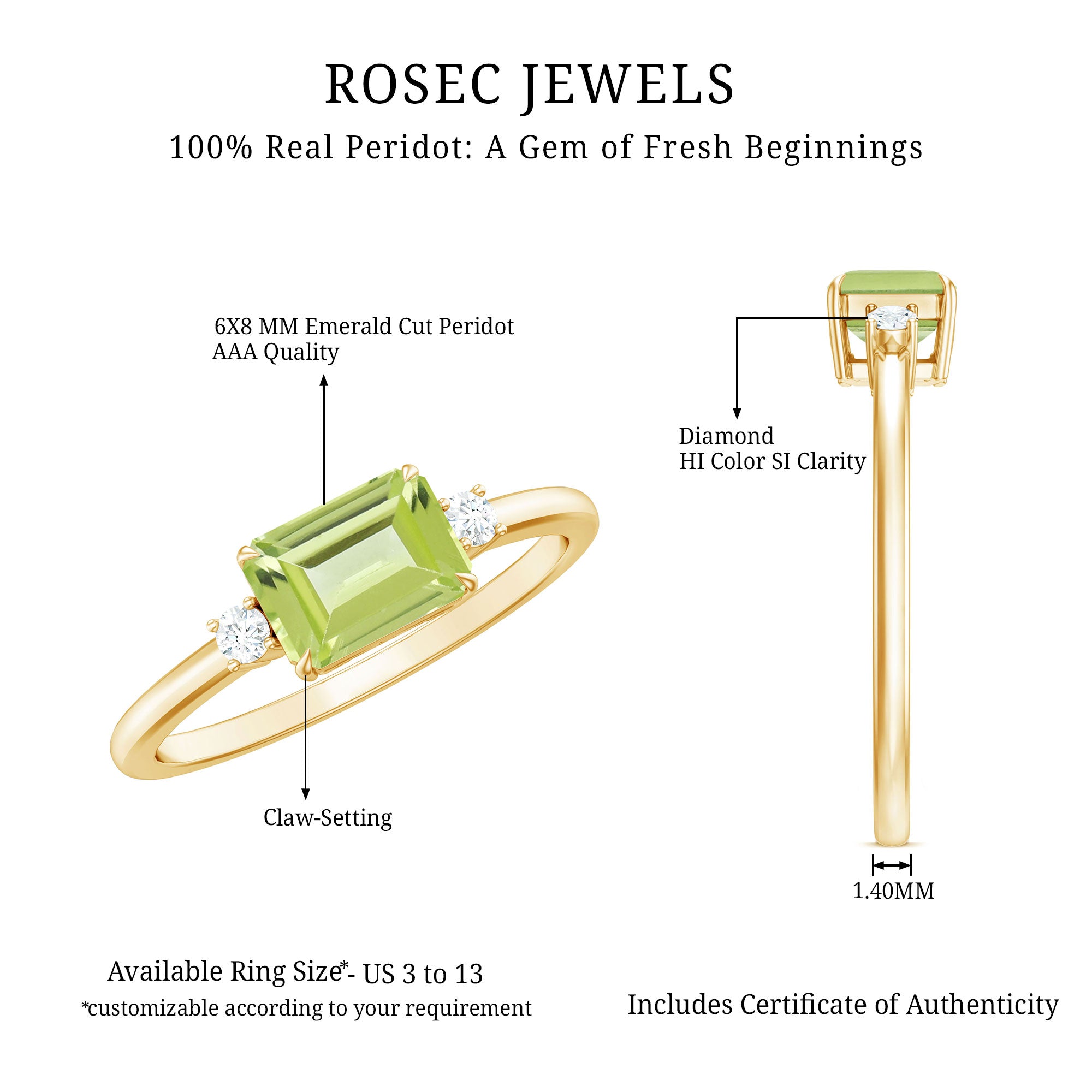 Elevate your style with this exquisite Solitaire Engagement Ring, featuring an alluring Emerald Cut Peridot that is set in an East West pattern, further enhancing its unique and captivating appeal. The stunning Peridot is beautifully showcased in a claw setting, accentuated by sparkling Round Diamond side stones, adding to its sophisticated and refined allure. The Peridot ring is expertly crafted with the highest quality gold, ensuring a luxurious and opulent feel. Give your special someone a gift that they will cherish forever, and symbolize your commitment to a lifelong promise of love and devotion with this exceptional and enchanting Solitaire Engagement Ring.