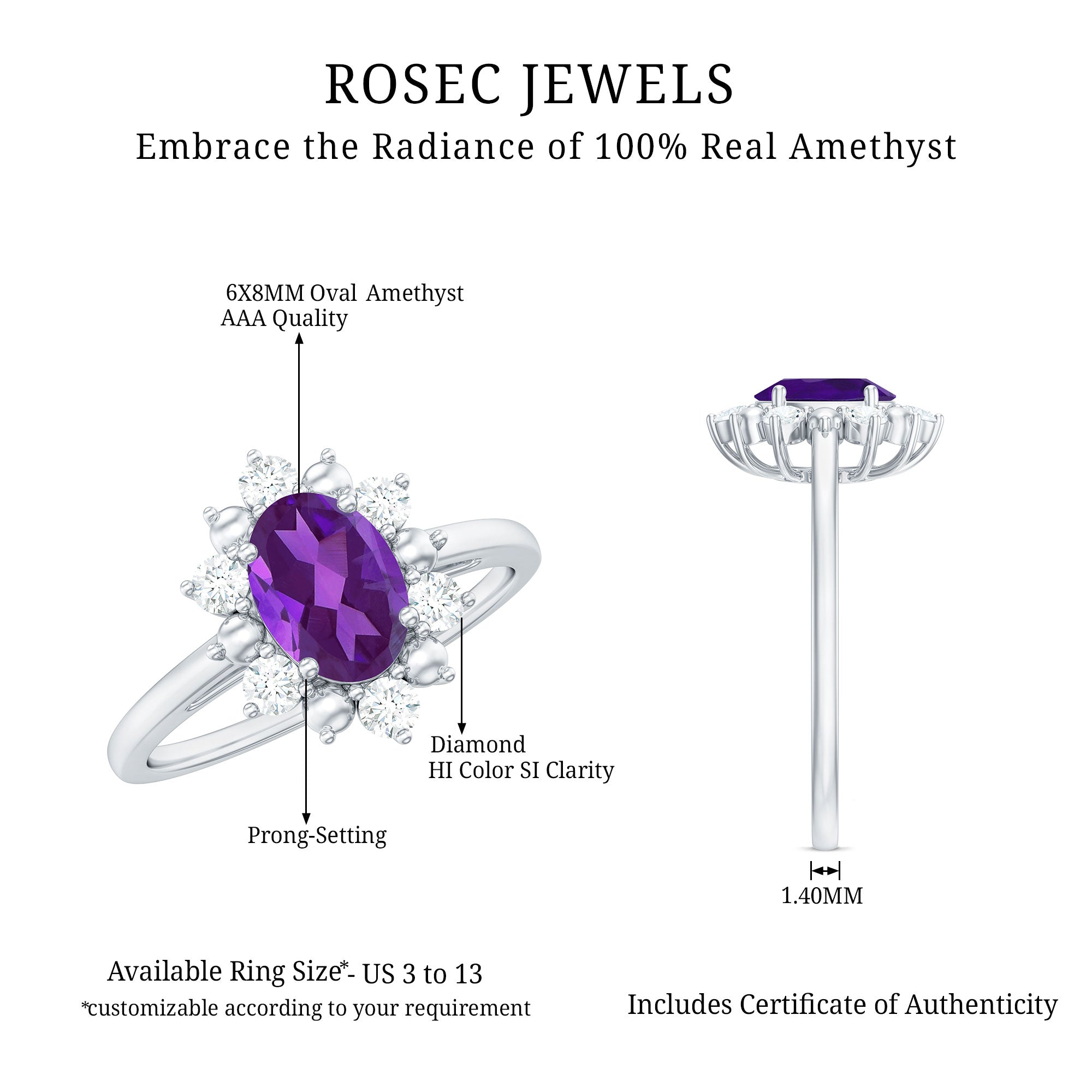Together, the amethyst center stone and diamond accents create a balanced engagement ring that blends vibrant color with refined brilliance.