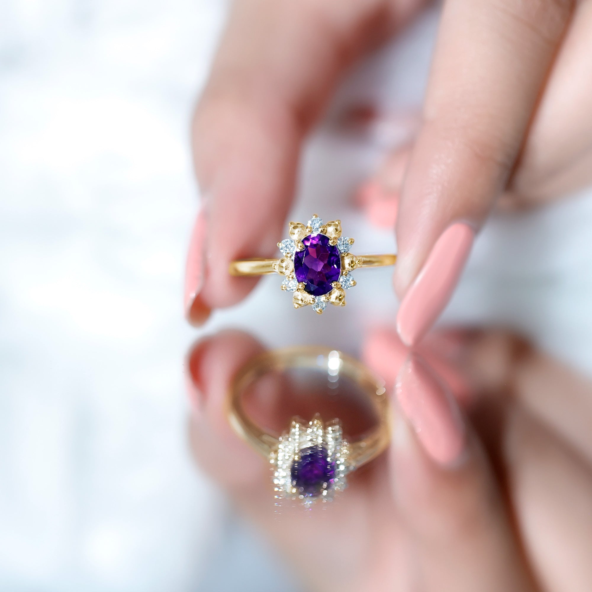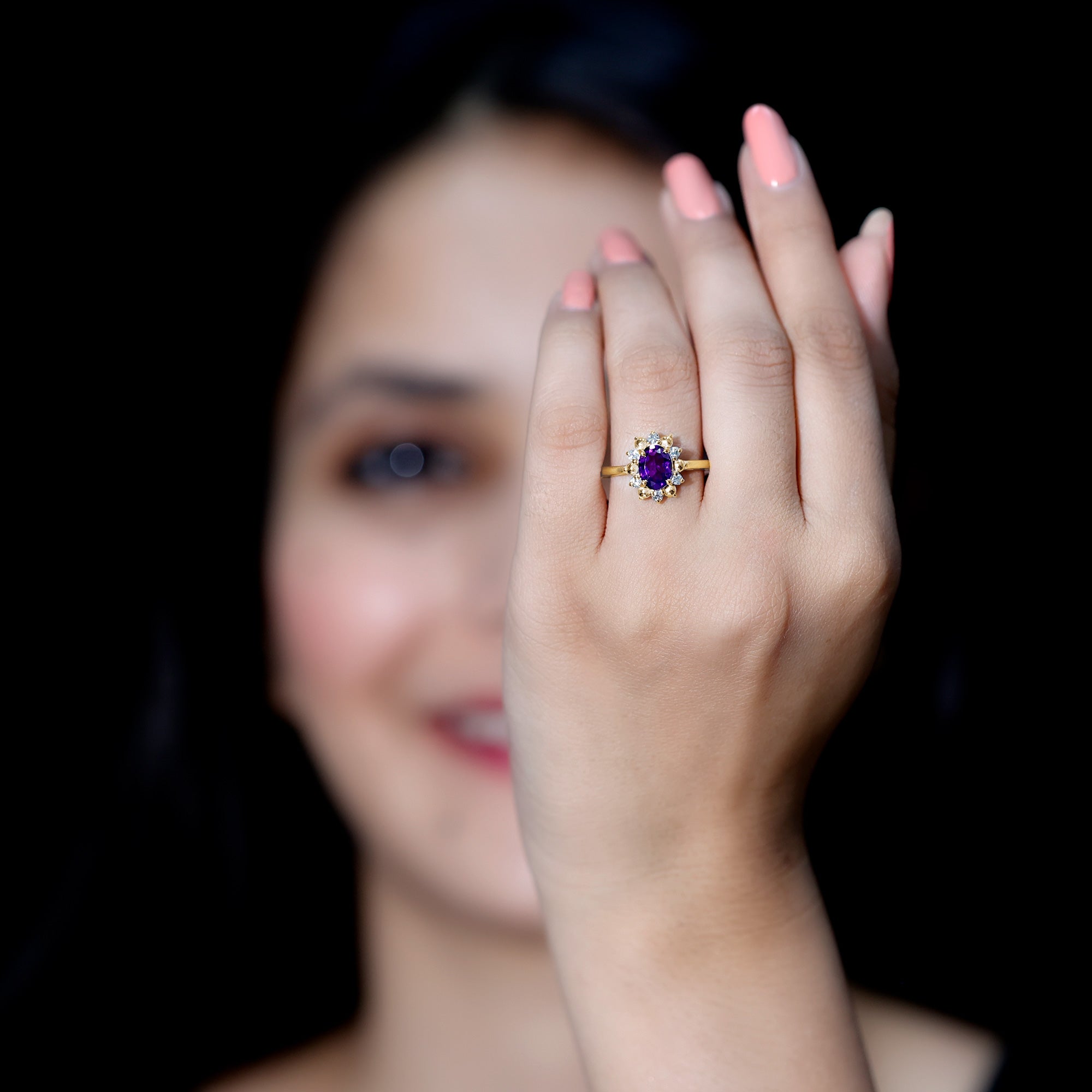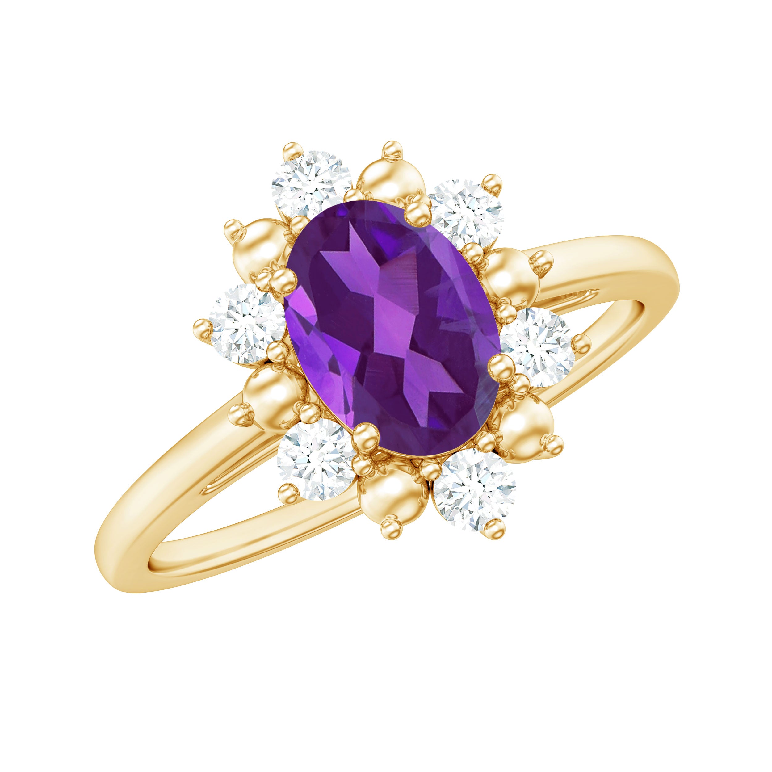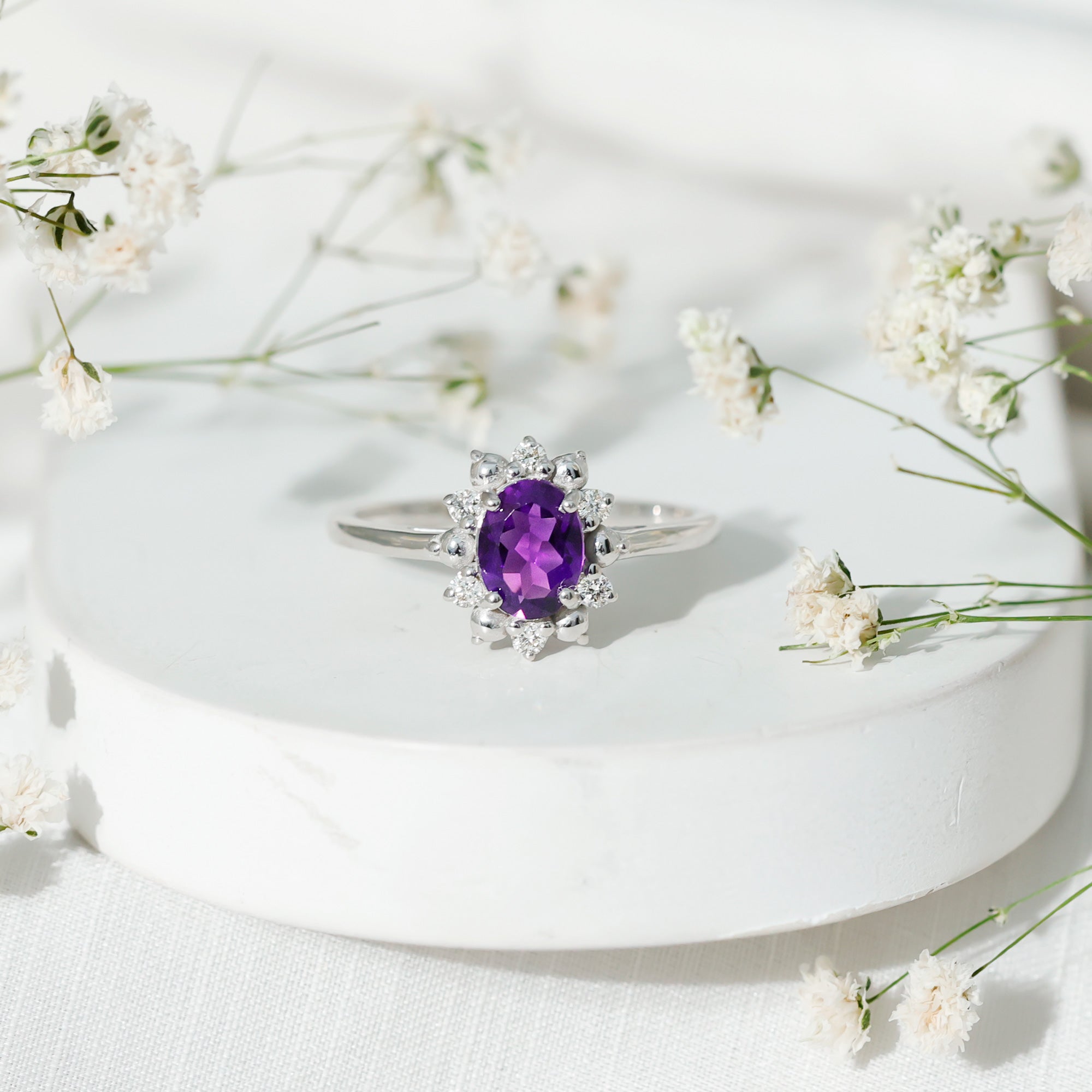 Diamond accents add brightness to the design and provide contrast against the deep tone of the amethyst. Their reflective sparkle enhances the floral halo while maintaining the focus on the central gemstone.