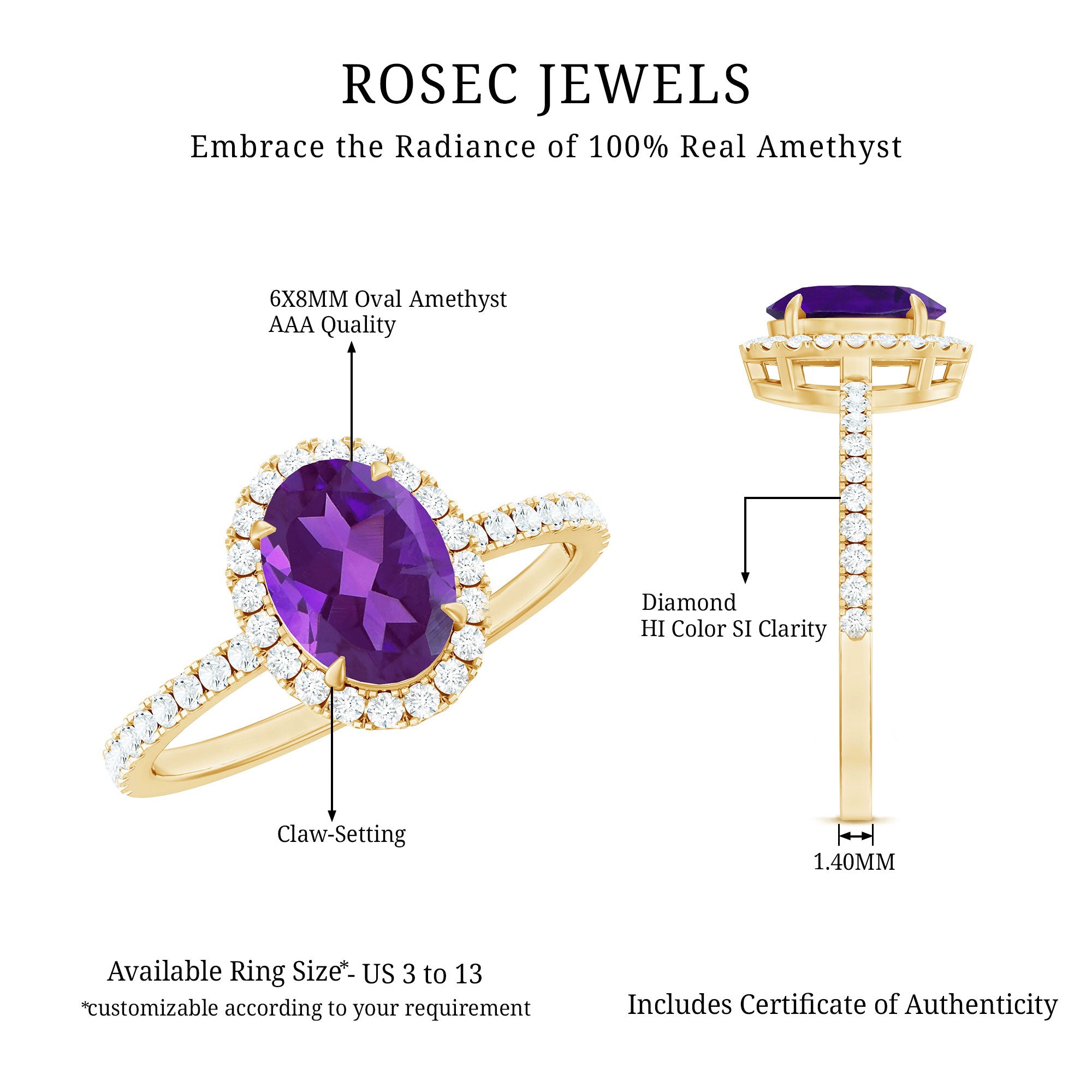 Capture the heart of your beloved with an exquisite Amethyst Engagement Ring that boasts a stunning Oval Cut Amethyst securely nestled in a Claw Setting, accompanied by shimmering Round Shape Diamond stones on the sides. Crafted with Gold for a luxurious and glamorous appearance that will leave a lasting impression. This refined and sophisticated February Birthstone Ring will shine brilliantly for all eternity, symbolizing your unending love. Dont hesitate present this captivating piece to your significant other and make her feel like royalty.