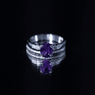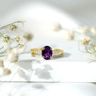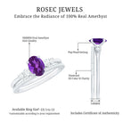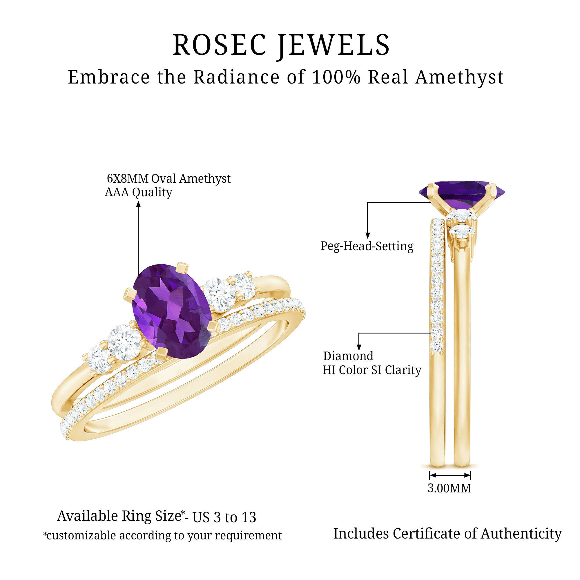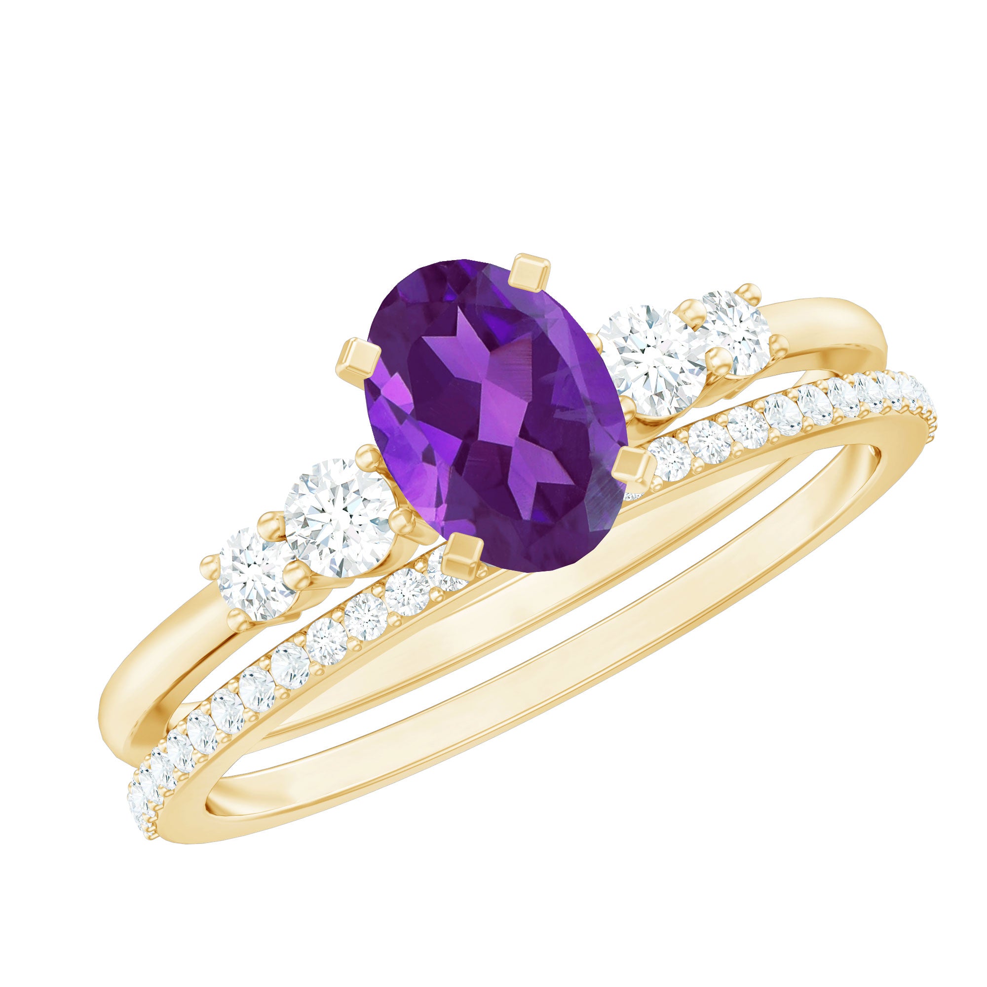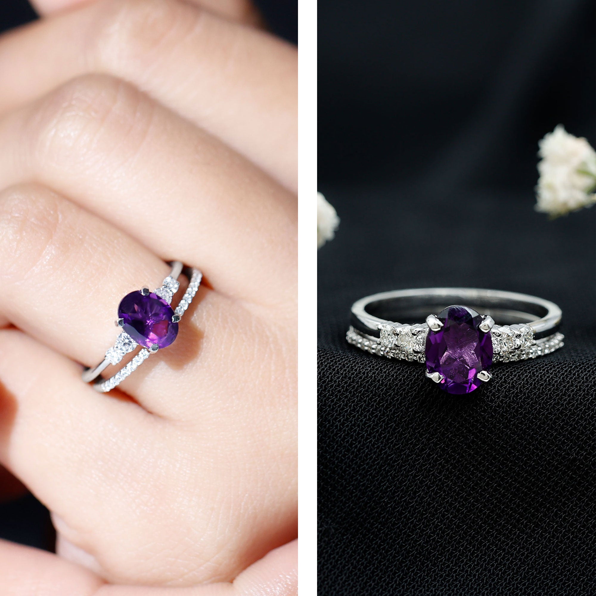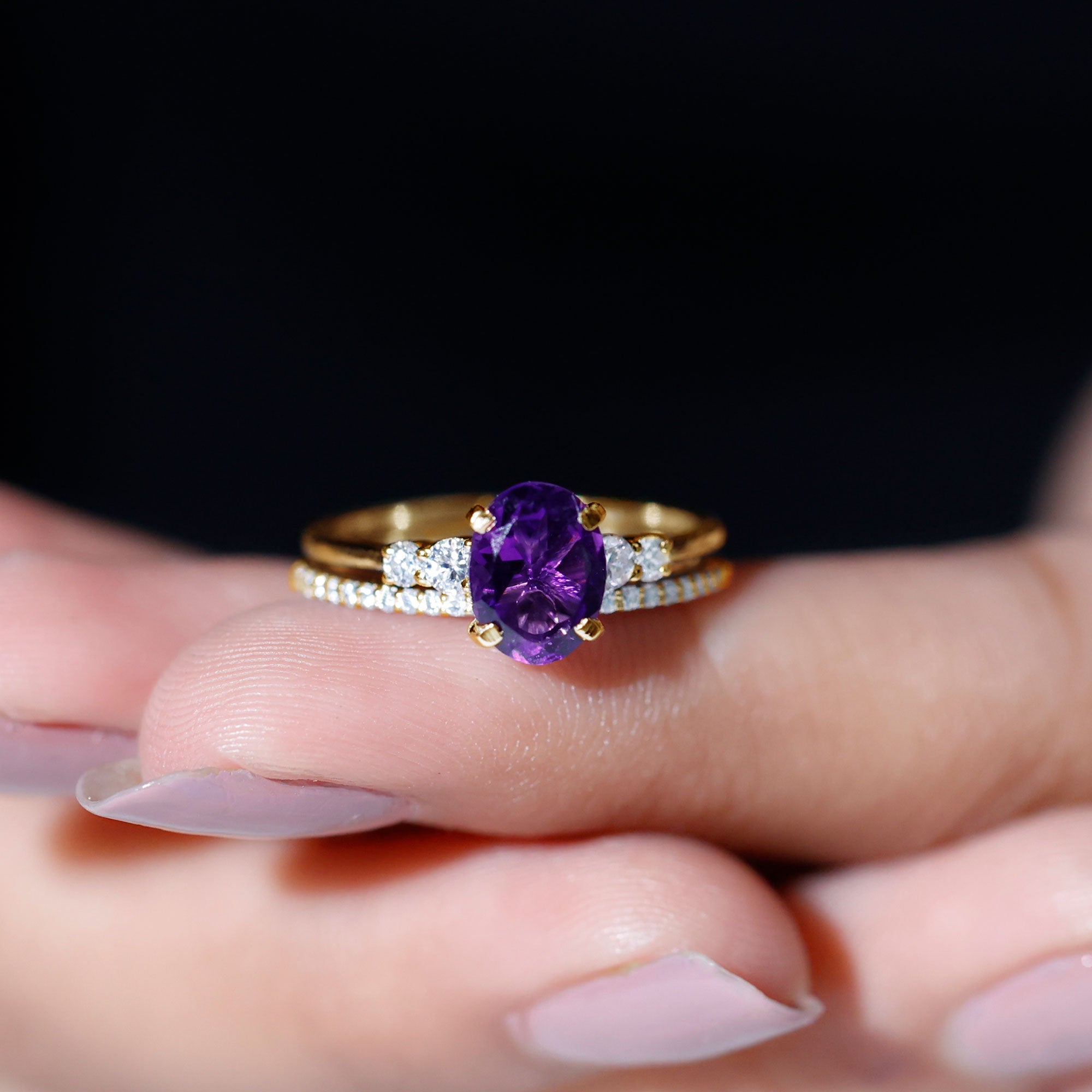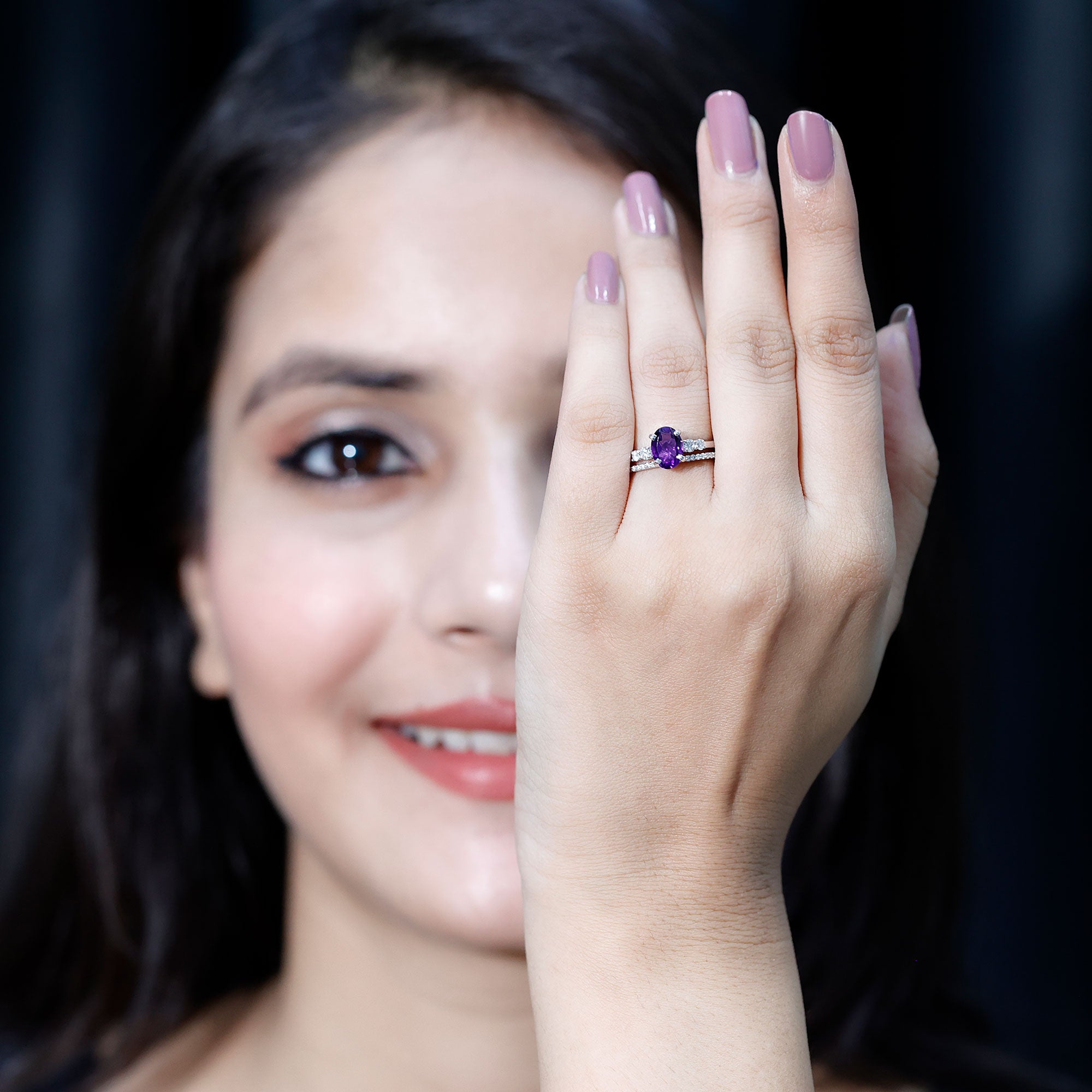 If youre a modern minimalist who loves to go all vibrant with her choice of accessories, this Amethyst Solitaire Ring Set is the one for you. It compromises of an Alluring Amethyst Ring, complemented by a matching Diamond Band. Sure to turn heads, the Solitaire Ring features a Single Centerpiece of 6X8 MM Oval Shape Amethyst held by Peg Head Setting, exuding glamour. It is further beautified by the glitz of Round Shape Diamond on either side. The matching Diamond Band brings together the look, making a fuller statement.