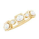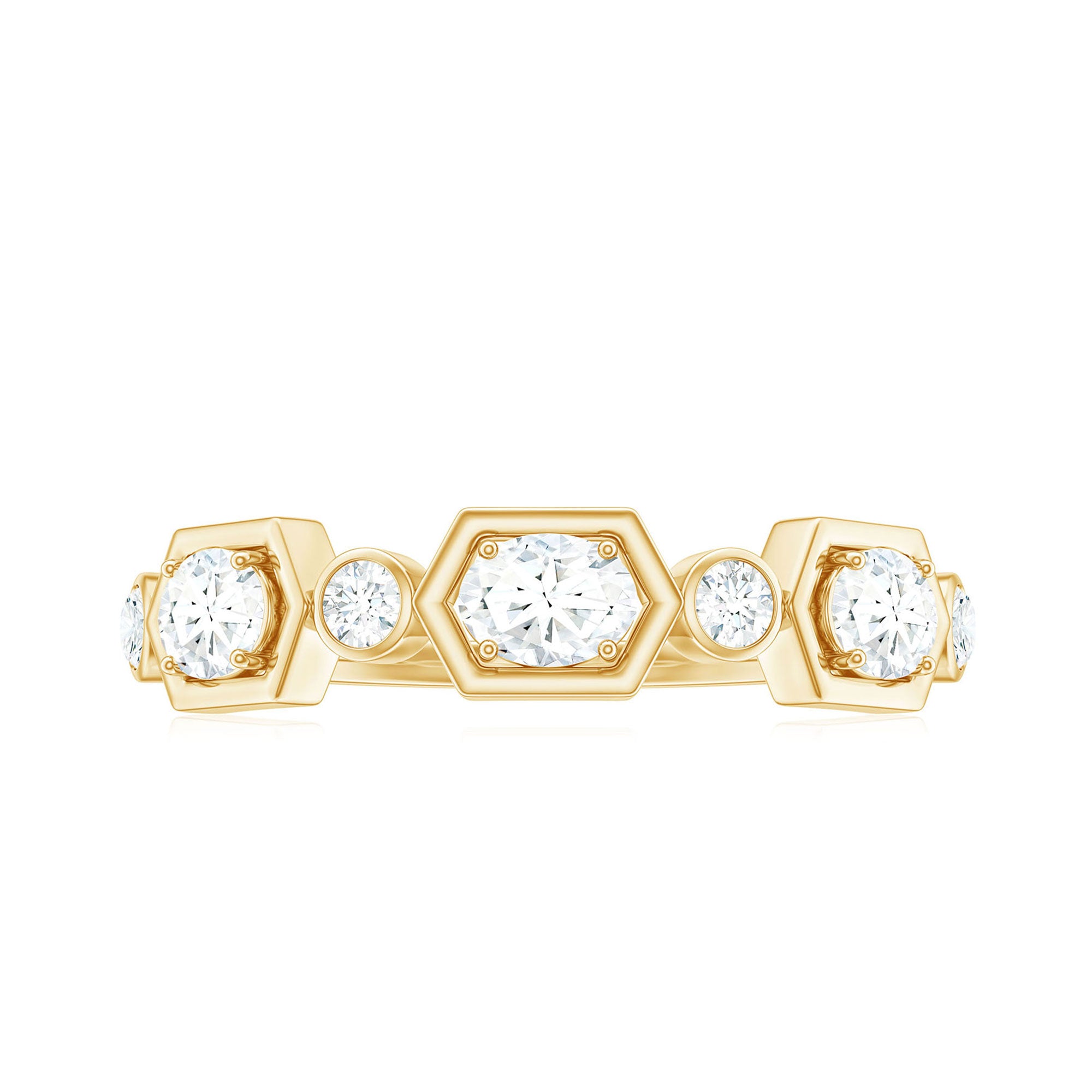 Bold symmetry combines with timeless sparkle in this Moissanite Half Eternity Band, a breathtaking piece that reimagines elegance with a contemporary twist. Tailored for the modern bride or fashion-forward woman, this Stackable Ring showcases a striking design of alternating oval and round moissanite stones. Each oval cut moissanite is nestled in a hexagon metal frame and secured with prong setting, while the round stones are set in bezel setting. All the moissanites are D color and VS1 clarity, offering brilliant shine and a beautiful, ethical alternative to traditional diamonds. This Moissanite Wedding Band beautifully embodies the concept of everlasting love while ensuring comfort and flexibility. Its stackable design makes it a versatile addition to your jewelry collection, whether worn alone for a minimalist aesthetic, paired with an engagement ring, or stacked with other bands for a bold, layered look. Meticulously crafted with attention to detail and designed for both visual appeal and everyday wear, this Wedding Anniversary Ring is a tribute to individuality and lasting connection.