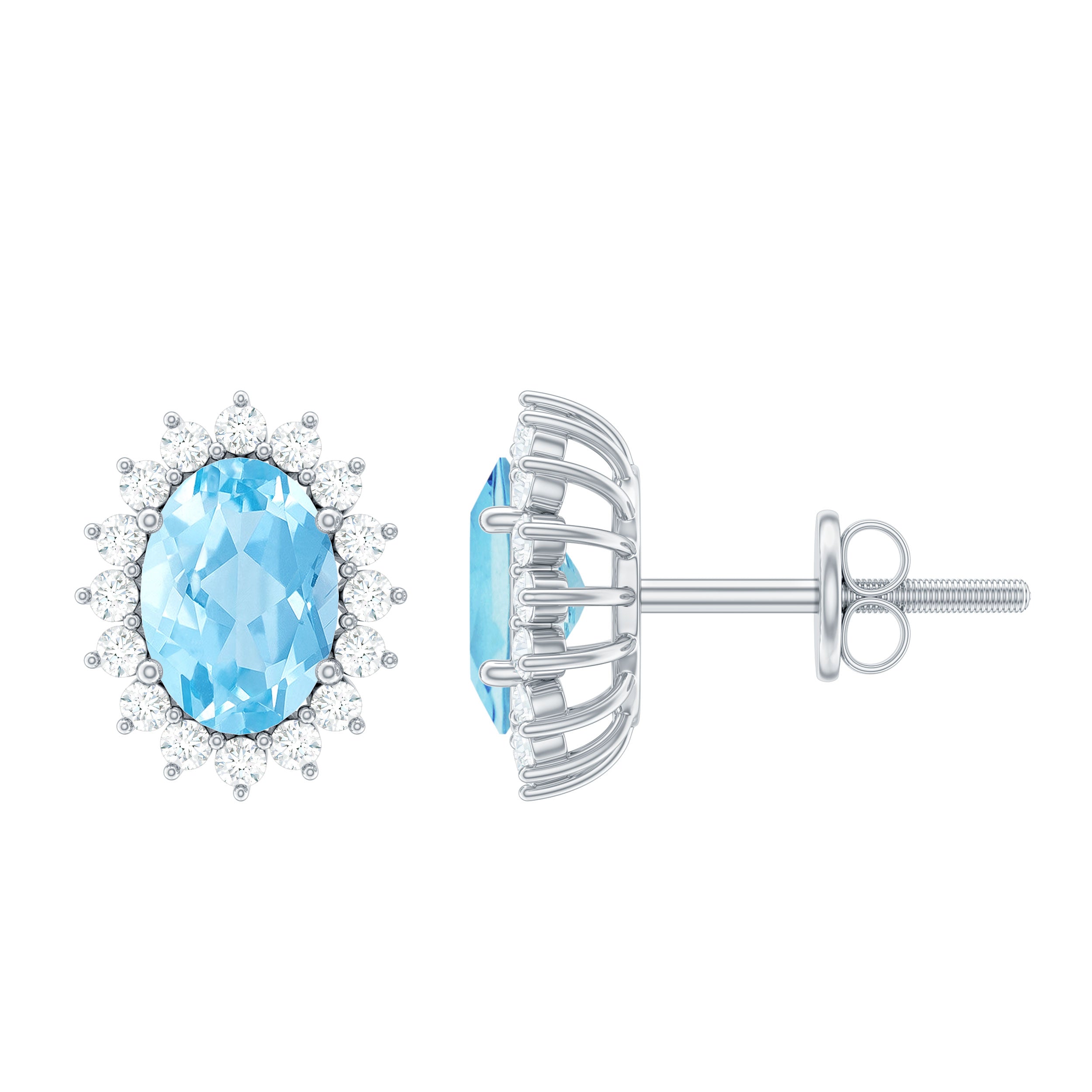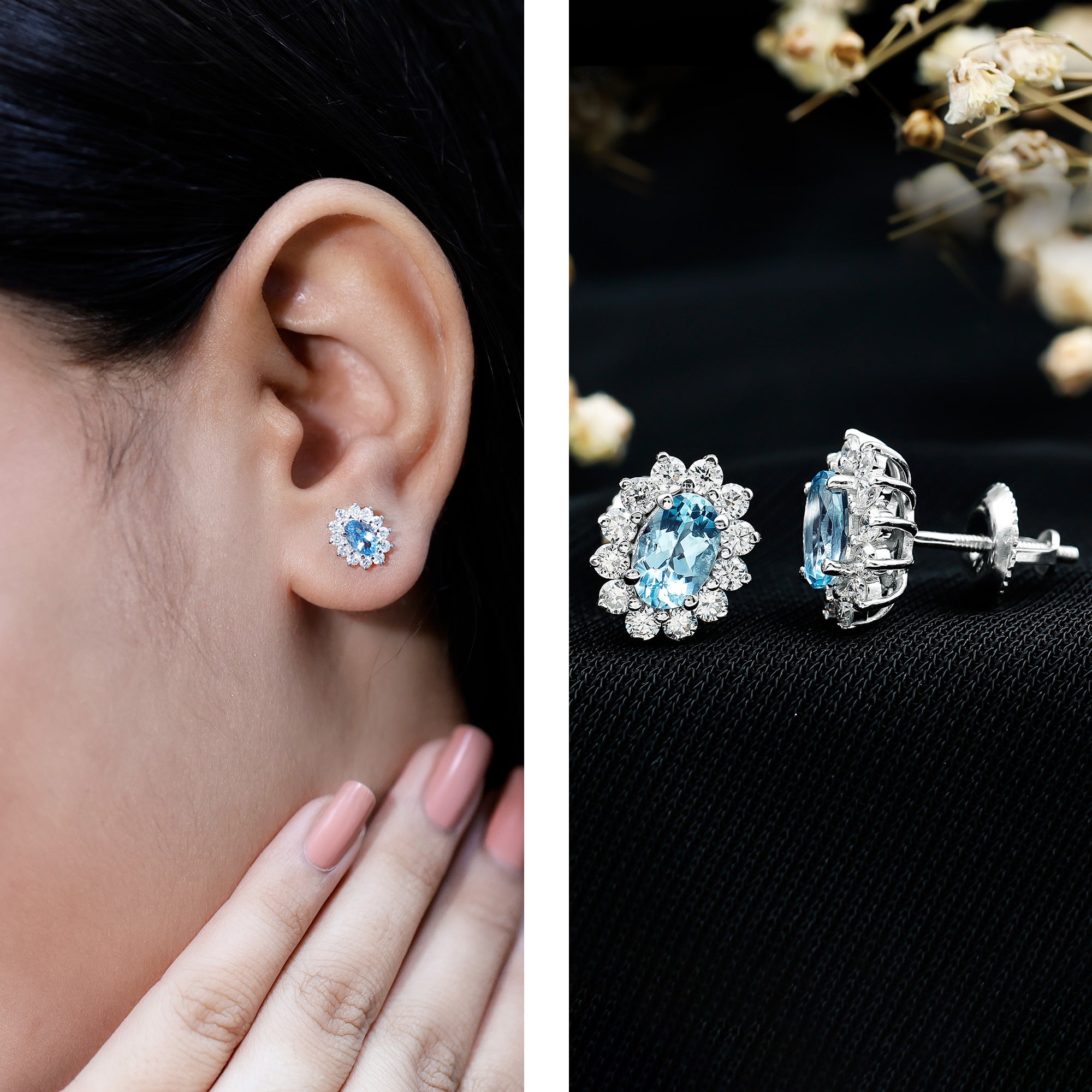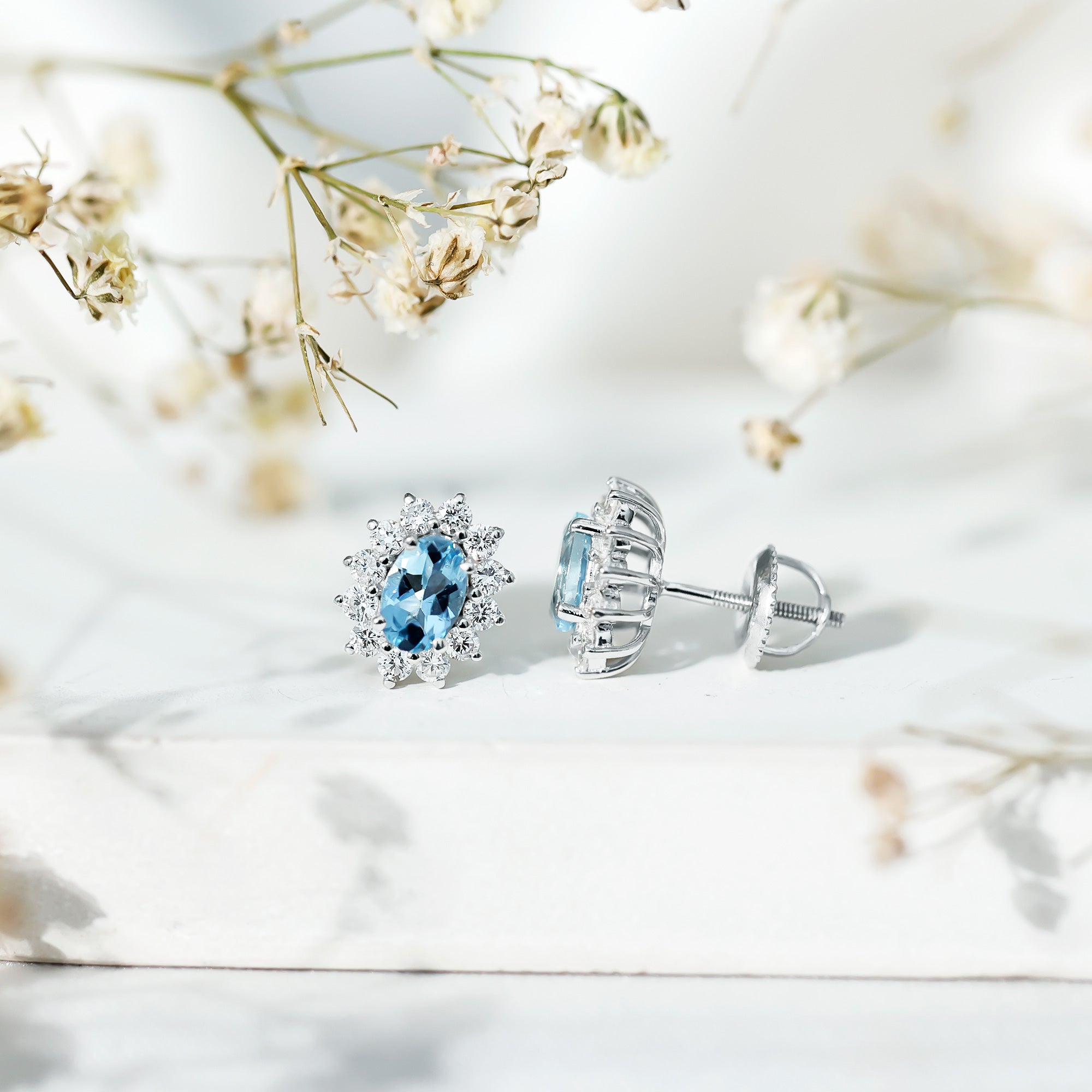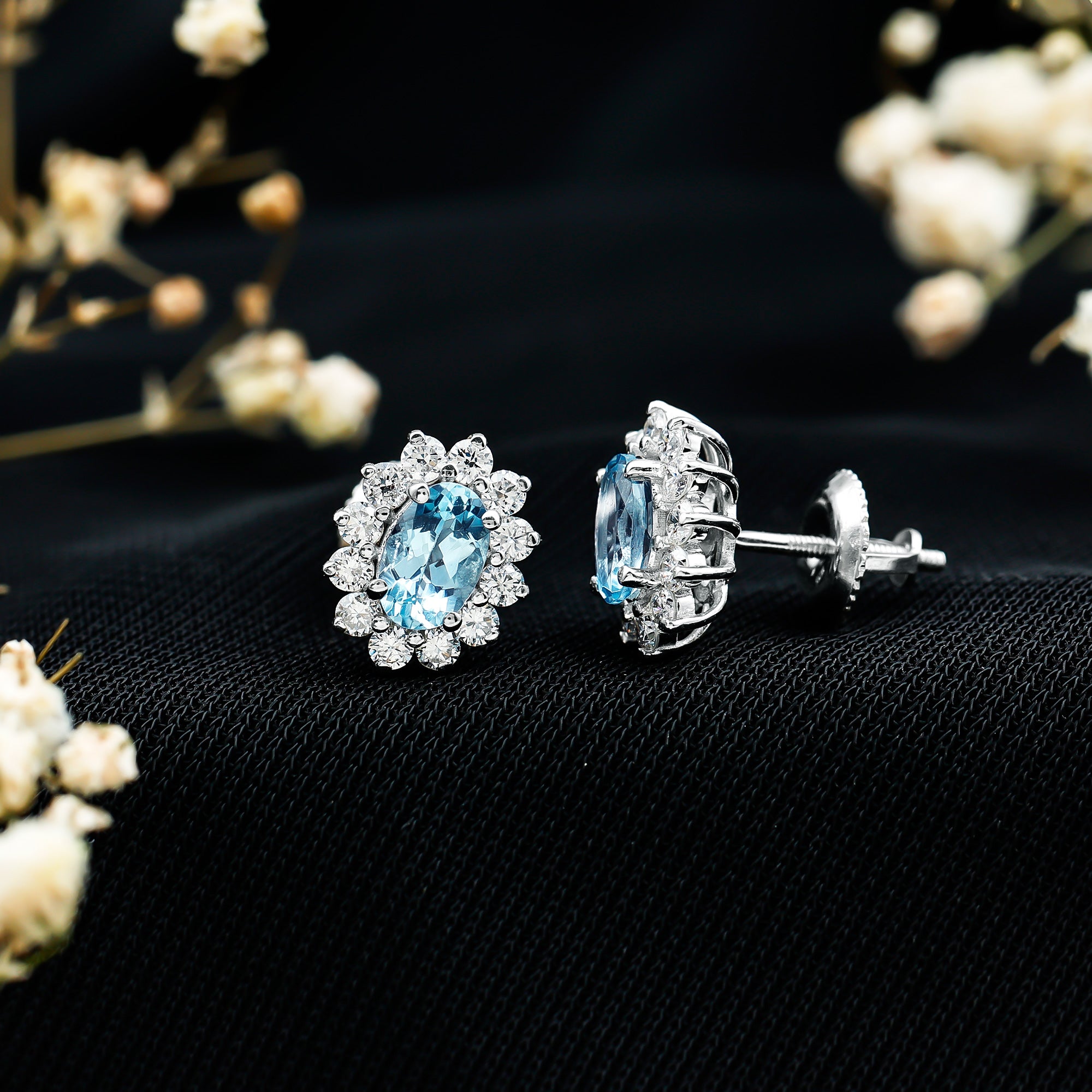 Add a fresh wave of elegance to your jewelry collection with these beautifully handcrafted Aquamarine Stud Earrings. Designed in 14K white gold plated silver, these earrings feature soft, calming tones that reflect the soothing energy of the sea. At the center of each stud sits a 4X6 MM oval shaped Aquamarine, securely held in prong setting. Surrounding the center stone is a sparkling halo of round EF-VS quality lab grown diamonds that add a gentle brilliance and elevate the overall charm of the Oval Stud Earrings. These Halo Stud Earrings make a thoughtful gift for someone born in March or for anyone who appreciates the calming beauty of ocean-inspired tones. The AAA quality Aquamarine used in these studs is subtle yet eye-catching, blending seamlessly with the halo to create a refined, timeless piece. These Screw Back Earrings are designed for comfort and security, making them ideal for everyday wear or special occasions. Whether you are heading to work, attending a wedding, or celebrating a birthday, these Aquamarine and Diamond Earrings are the perfect finishing touch. Comes in a signature jewelry box and includes a gemstone certificate for authenticity. These earrings are a quiet reminder of strength, serenity, and timeless style. Perfect as a gift or a treat for yourself, these Aquamarine Halo Studs offer classic beauty with a modern twist.
