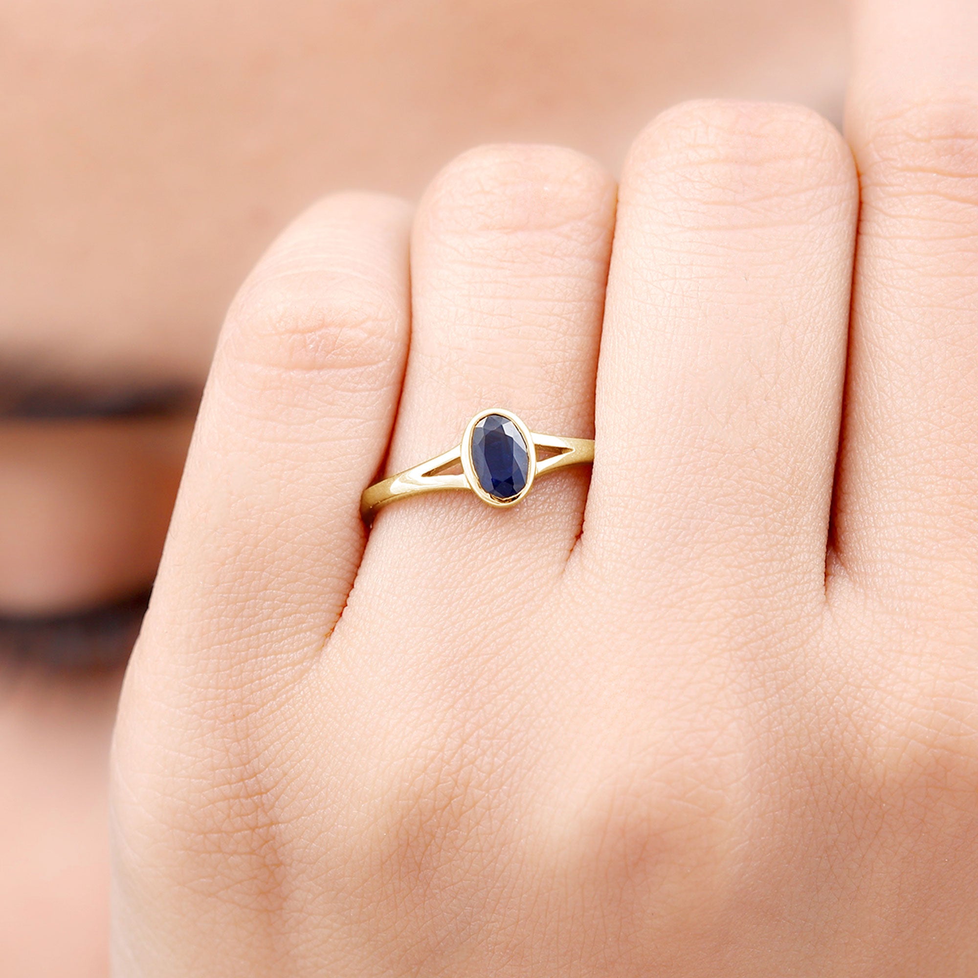 Grace your finger with the understated elegance of this Classic Blue Sapphire Ring. Adorned with an Oval Shape Blue Sapphire gemstone set delicately in a Bezel Setting in Split Shank, this Solitaire Engagement Ring is meticulously crafted in various metal options.