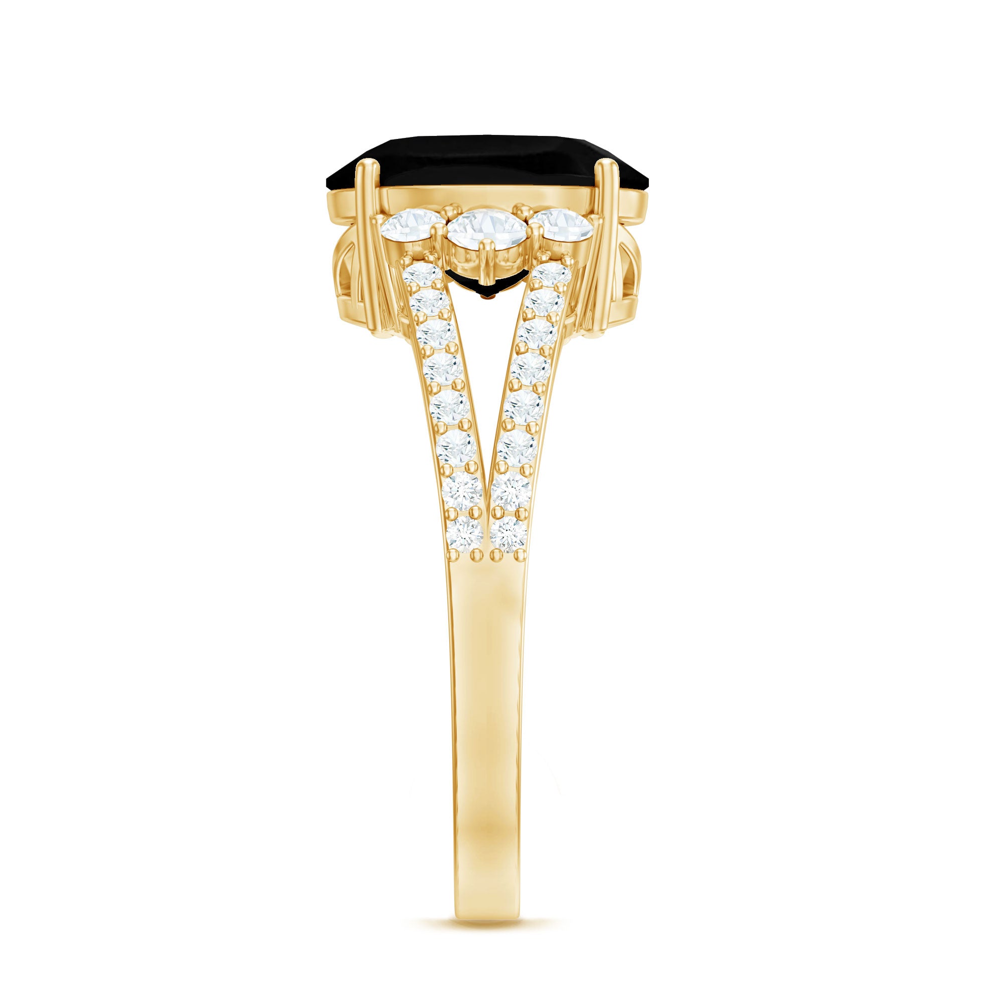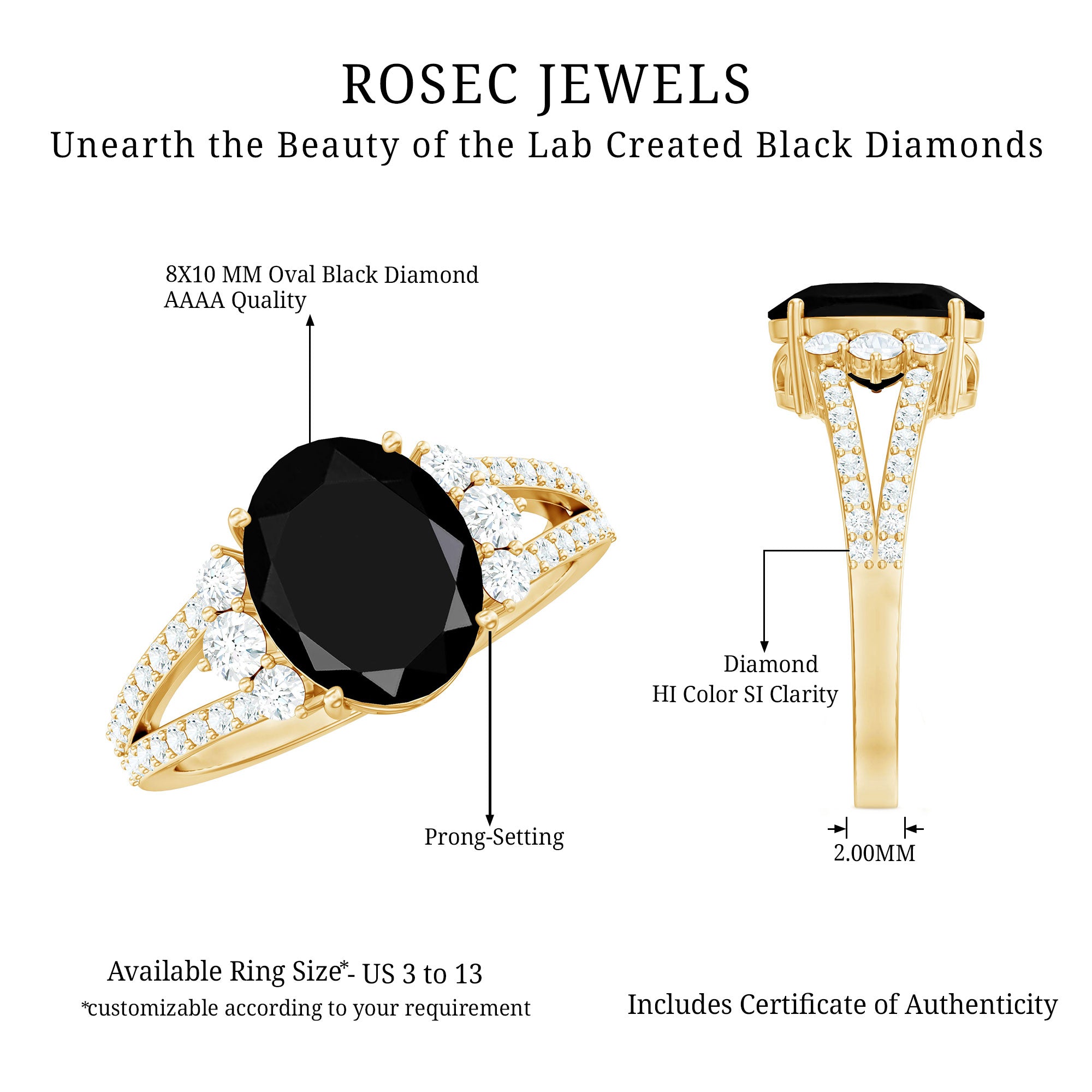 Make your ladylove feel like a star with this breathtaking Split Shank Engagement Ring. The centerpiece of this ring showcases a dazzling Oval Shape Created Black Diamond, surrounded by radiant Diamond stones on each side. The captivating Split Shank design is adorned with shimmering Diamond Gemstones, enhancing brilliance and allure. This ring is a true masterpiece, designed to make a statement and capture attention. Let the mesmerizing beauty of the Created Black Diamond and the sparkling Diamond gems symbolize your eternal love and create a magical moment that she will cherish forever.