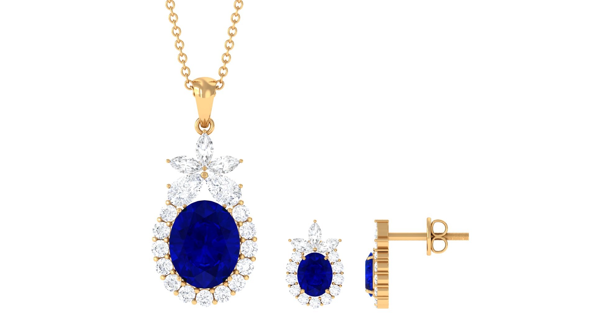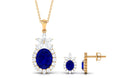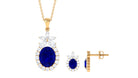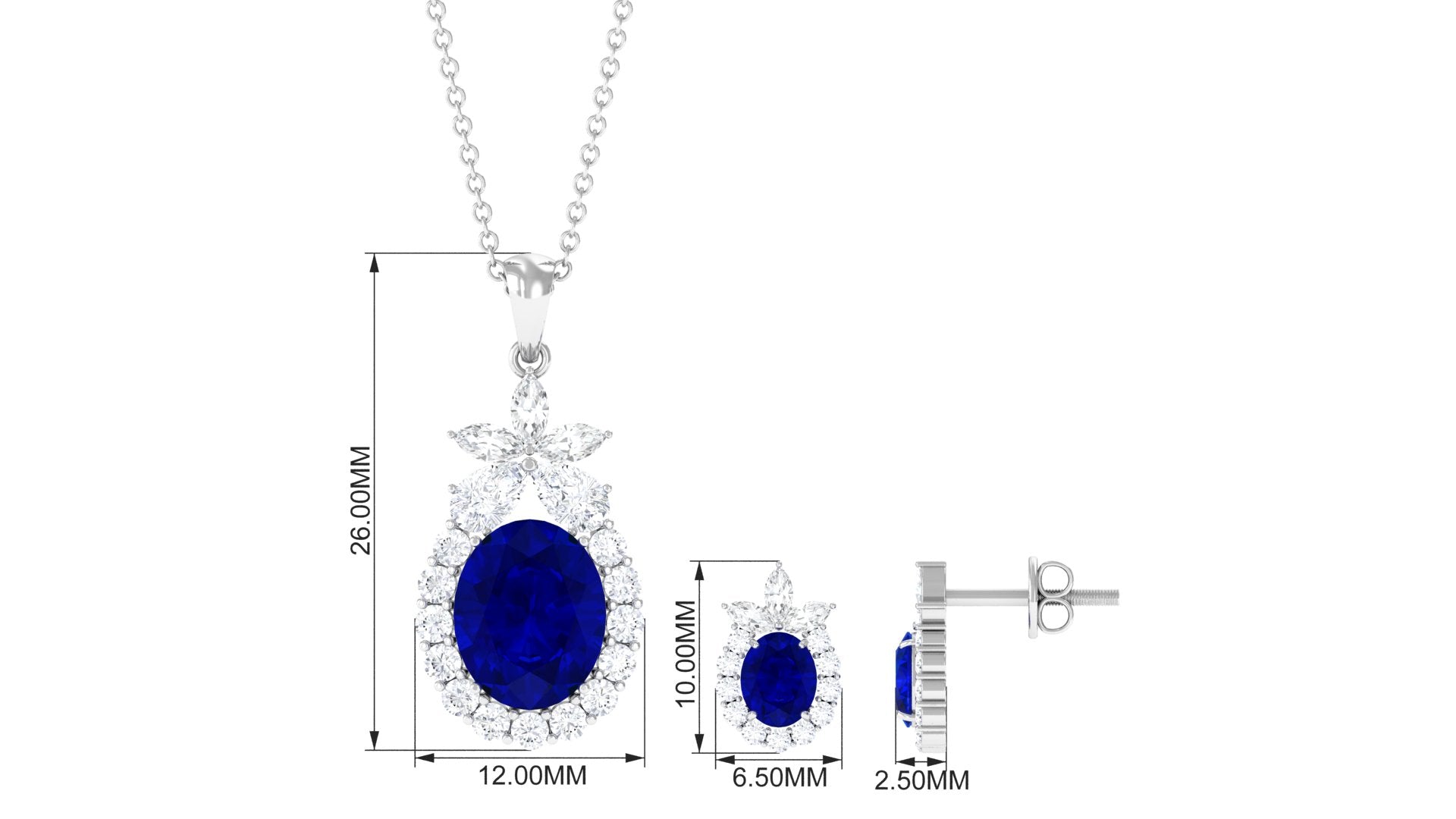 Experience the irresistible charm of our pendant earrings, featuring an oval created blue sapphire embraced by a dazzling round moissanite halo. The allure continues with additional pear-shaped and marquise-shaped moissanite accents, lending a touch of sparkle and elegance. This design effortlessly captures a perfect balance between timeless beauty and sophisticated allure. Indulge in the enchantment of this necklace and earrings and elevate your style with their exquisite craftsmanship and captivating presence.