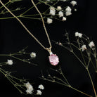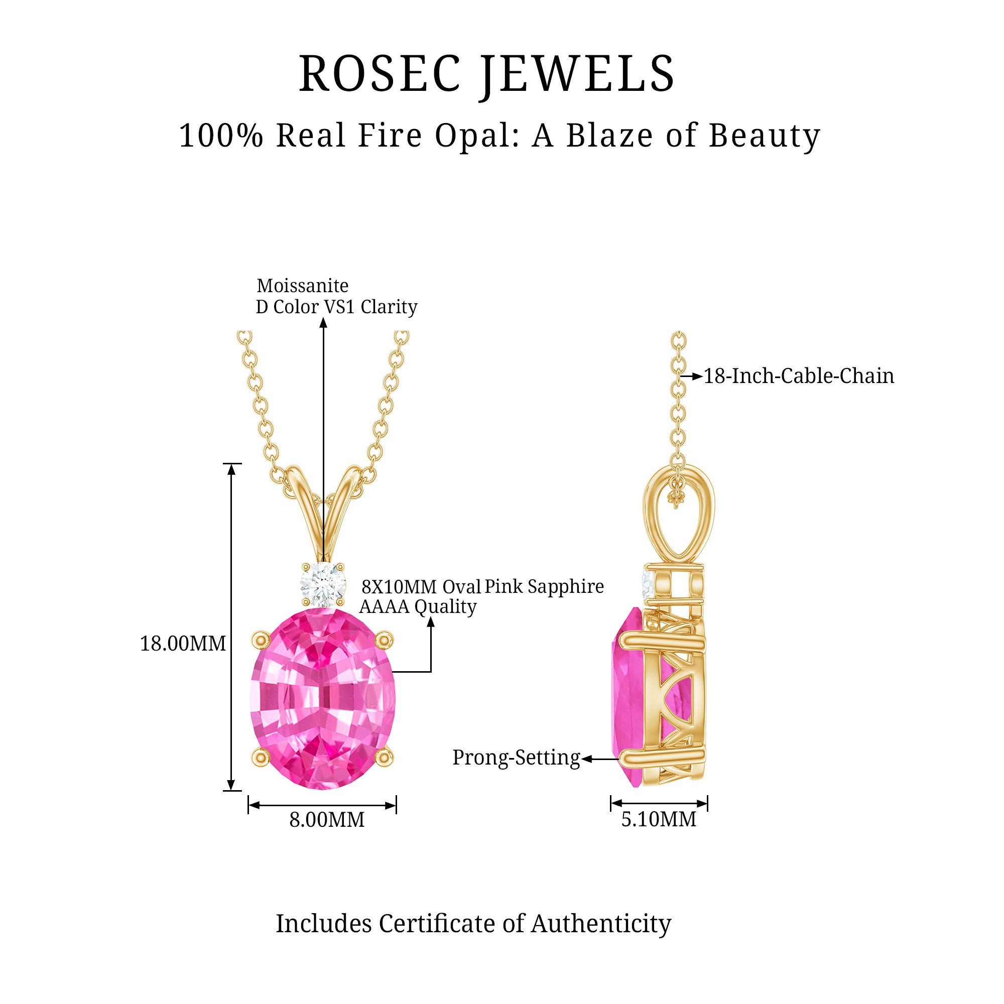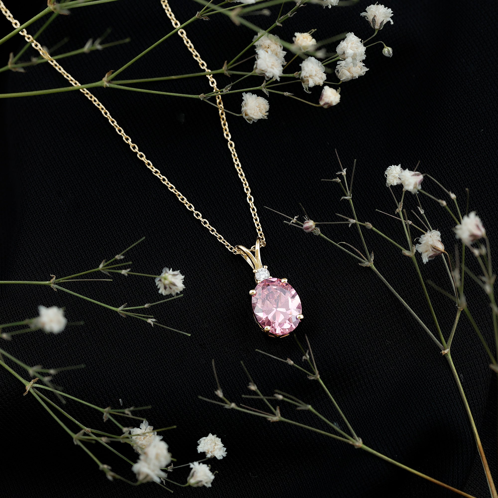 Upgrade your fashion game with this stunning Solitaire Pendant that commands admiration. The focal point is an oval-shaped created pink sapphire, exuding a rich and captivating pink shade while beautifully complementing a dazzling round moissanite gemstone. The pendant showcases an elegant rabbit ear bail, elevating the overall design with a touch of opulence.