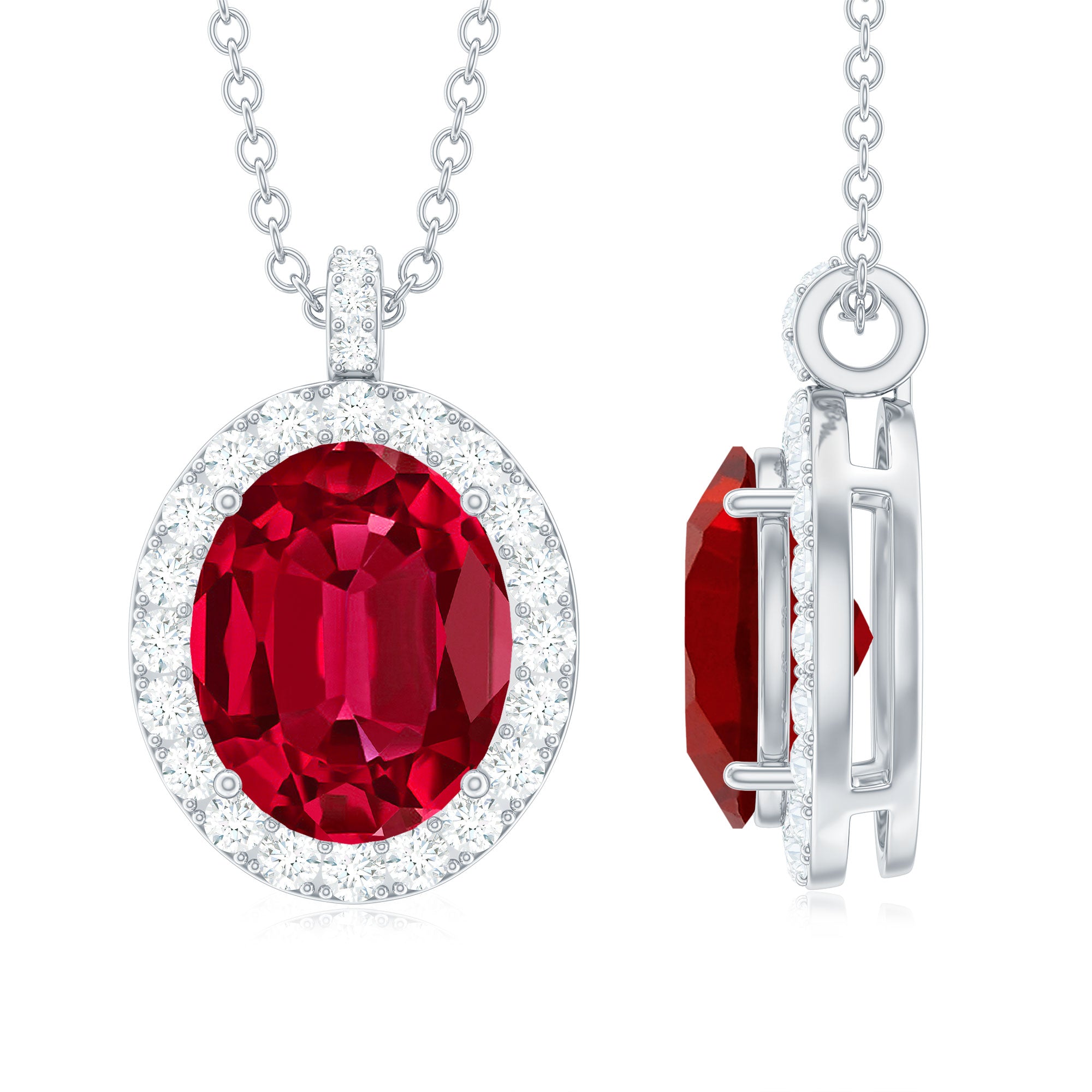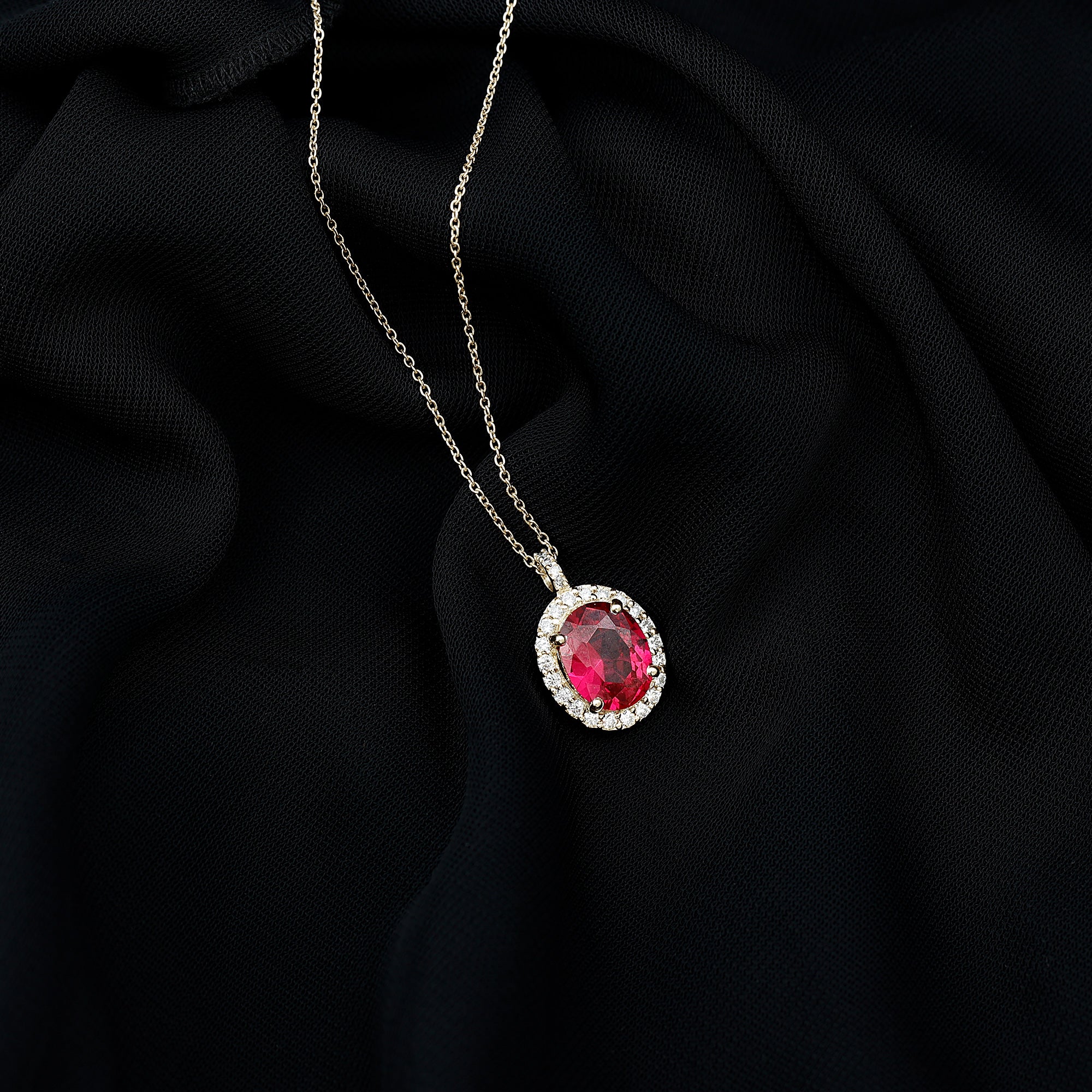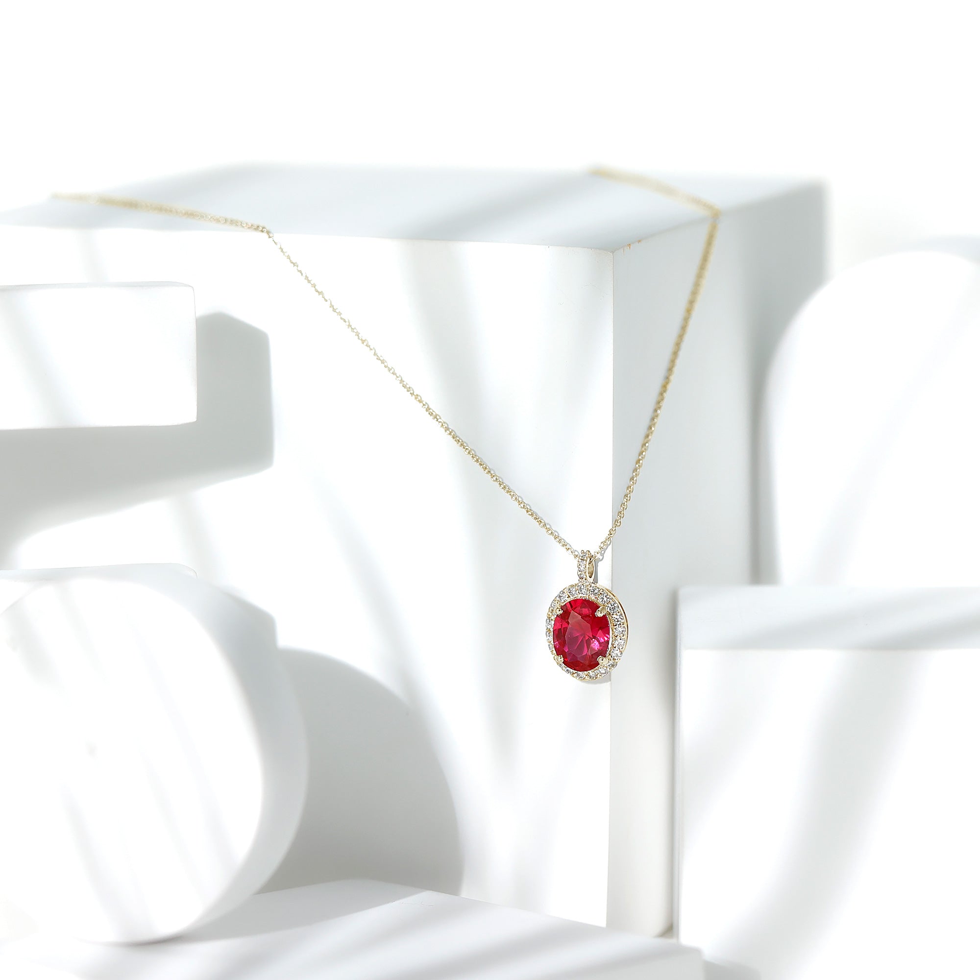 Enhance your fashion with the breathtaking Created Ruby Pendant, showcasing an Oval Cut Created Ruby delicately placed in a prong setting. The pendant is adorned with sparkling Diamond Halo, exuding a captivating aura.
