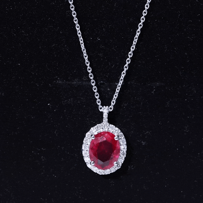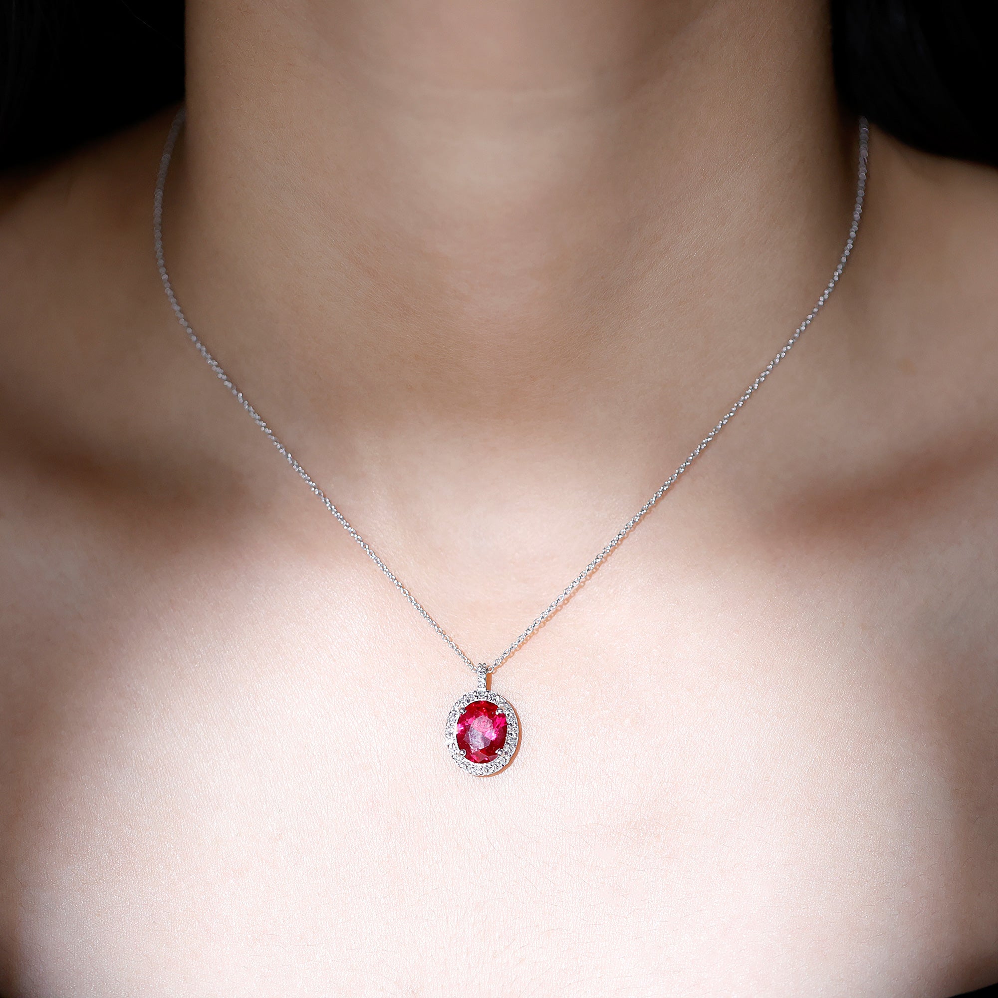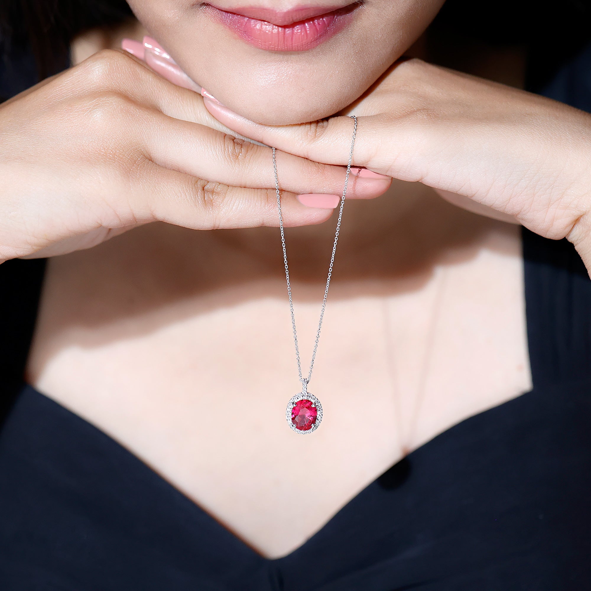 Enhance your fashion with the breathtaking Created Ruby Pendant, showcasing an Oval Cut Created Ruby delicately placed in a prong setting. The pendant is adorned with sparkling Diamond Halo, exuding a captivating aura.