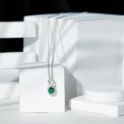 Immerse yourself in the elegance of our Lab Grown Emerald Pendant Necklace, where every detail exudes sophistication and charm. Our Emerald Infinity Necklace is more than just an accessory, it is a bold statement, a symbol of forever, and a radiant chapter in your personal love story. The design showcases a 6X8 MM oval cut lab grown emerald gently held in a prong setting at the base of an infinity symbol, surrounded with the sparkling halo of round Moissanite stones. Celebrate your inner brilliance and adorn yourself with the passion and luster of AAAA quality emerald and D-VS1 quality moissanite, allowing this Infinity Drop Pendant to narrate your romance through gemstones. Rosec Jewels is dedicated to creating exquisite jewelry pieces using Certified Lab Cultured Gemstones.