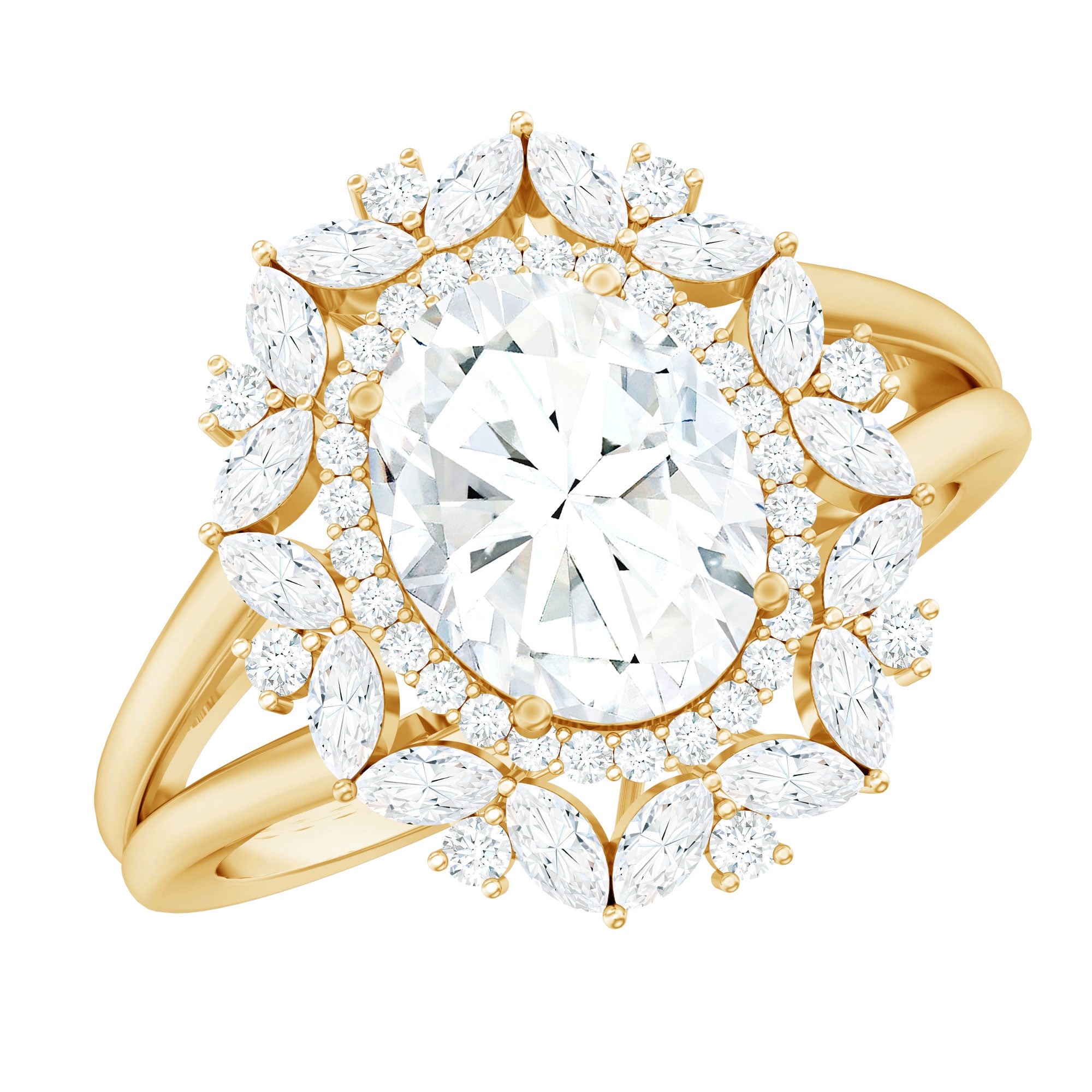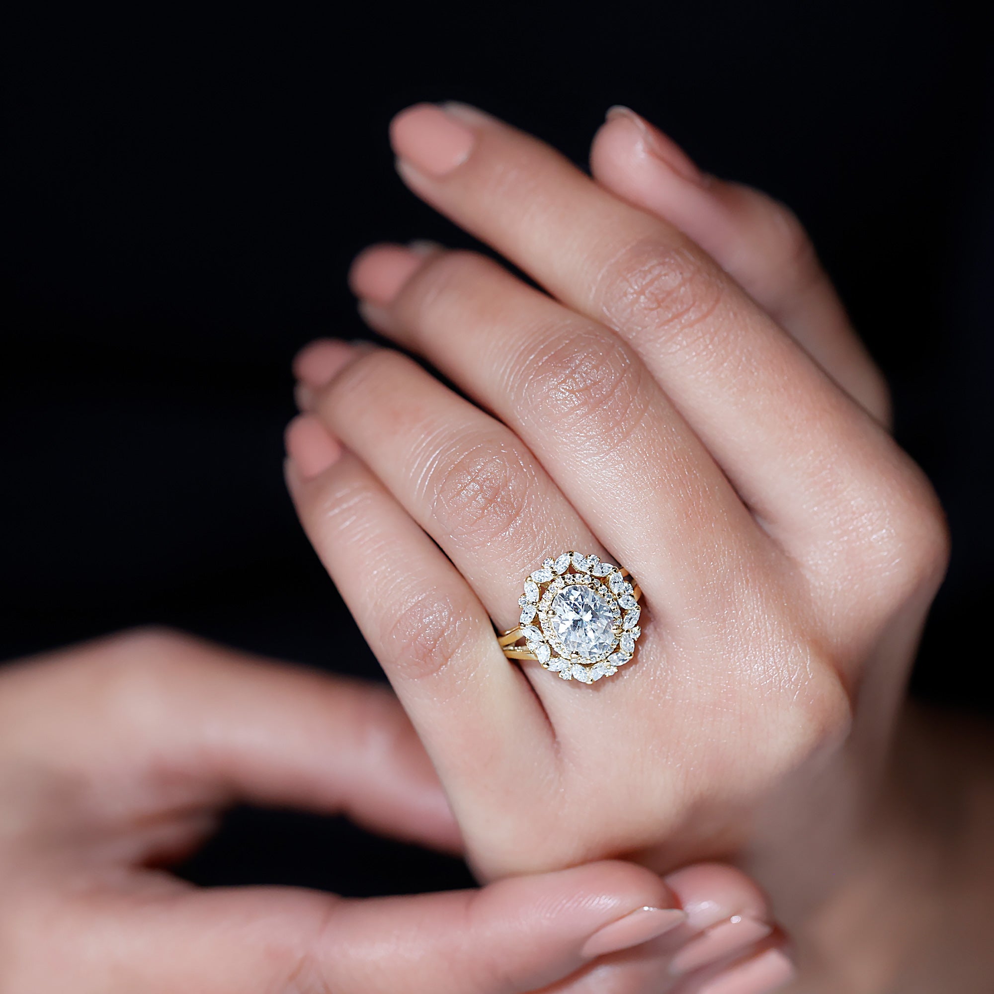 This Oval Moissanite Ring represents everlasting love with its stunning design, adding a hint of elegance and sparkle to your engagement day. It features a 7X9 MM Oval Shaped Moissanite set in a prong setting, surrounded by a double halo of petite round and marquise cut Moissanite stones. The eye-catching design includes a split shank that really enhances its overall look. With maximum brilliance and a unique mix of classic charm and modern flair, this Chunky Engagement Ring captures hearts with its timeless beauty. On your special day, adorn her finger with our classic 2 Carat Oval Moissanite Ring, which has a sophisticated touch that reflects its enduring charm and elegance. This Moissanite Engagement Ring for Women is a timeless piece that will draw attention to her, making her the star of the show. It enhances her beauty and serves as a constant reminder of cherished memories of love.