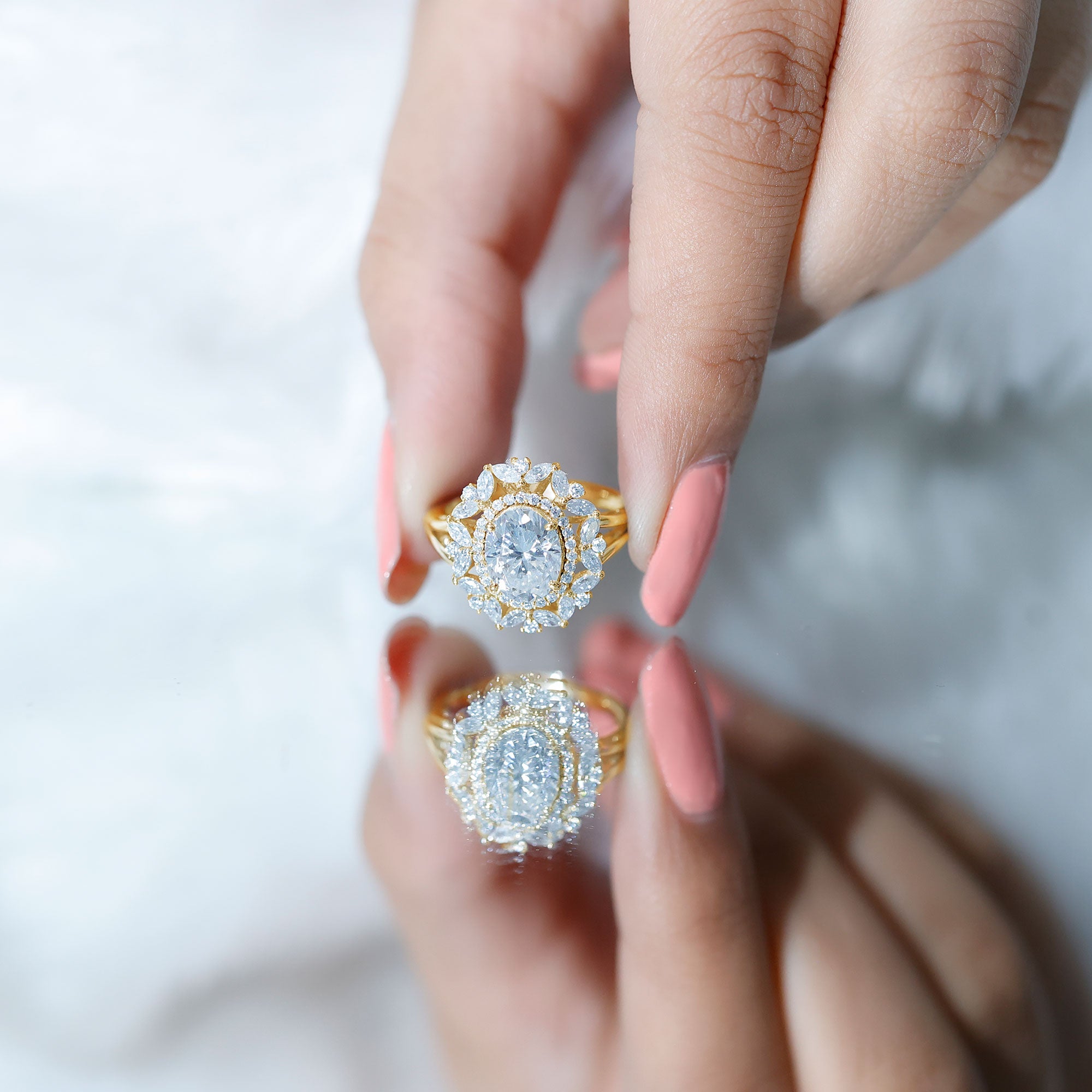 This Oval Moissanite Ring represents everlasting love with its stunning design, adding a hint of elegance and sparkle to your engagement day. It features a 7X9 MM Oval Shaped Moissanite set in a prong setting, surrounded by a double halo of petite round and marquise cut Moissanite stones. The eye-catching design includes a split shank that really enhances its overall look. With maximum brilliance and a unique mix of classic charm and modern flair, this Chunky Engagement Ring captures hearts with its timeless beauty. On your special day, adorn her finger with our classic 2 Carat Oval Moissanite Ring, which has a sophisticated touch that reflects its enduring charm and elegance. This Moissanite Engagement Ring for Women is a timeless piece that will draw attention to her, making her the star of the show. It enhances her beauty and serves as a constant reminder of cherished memories of love.