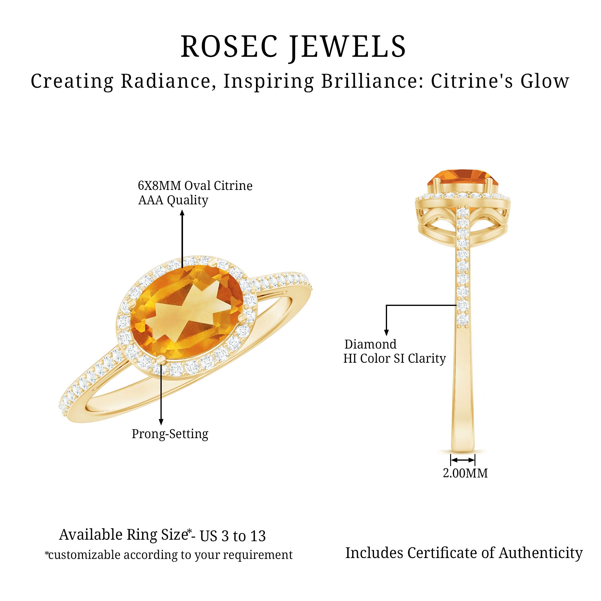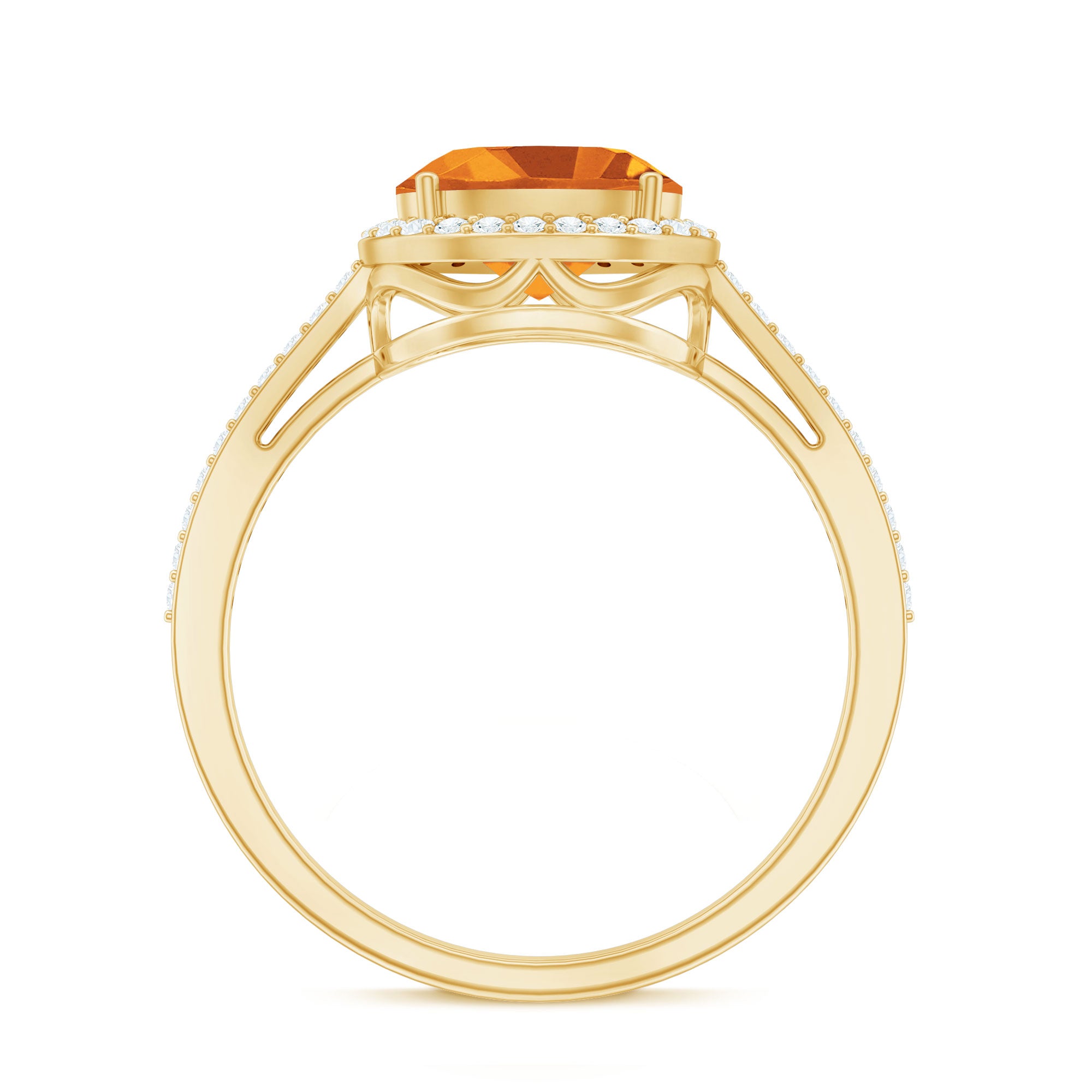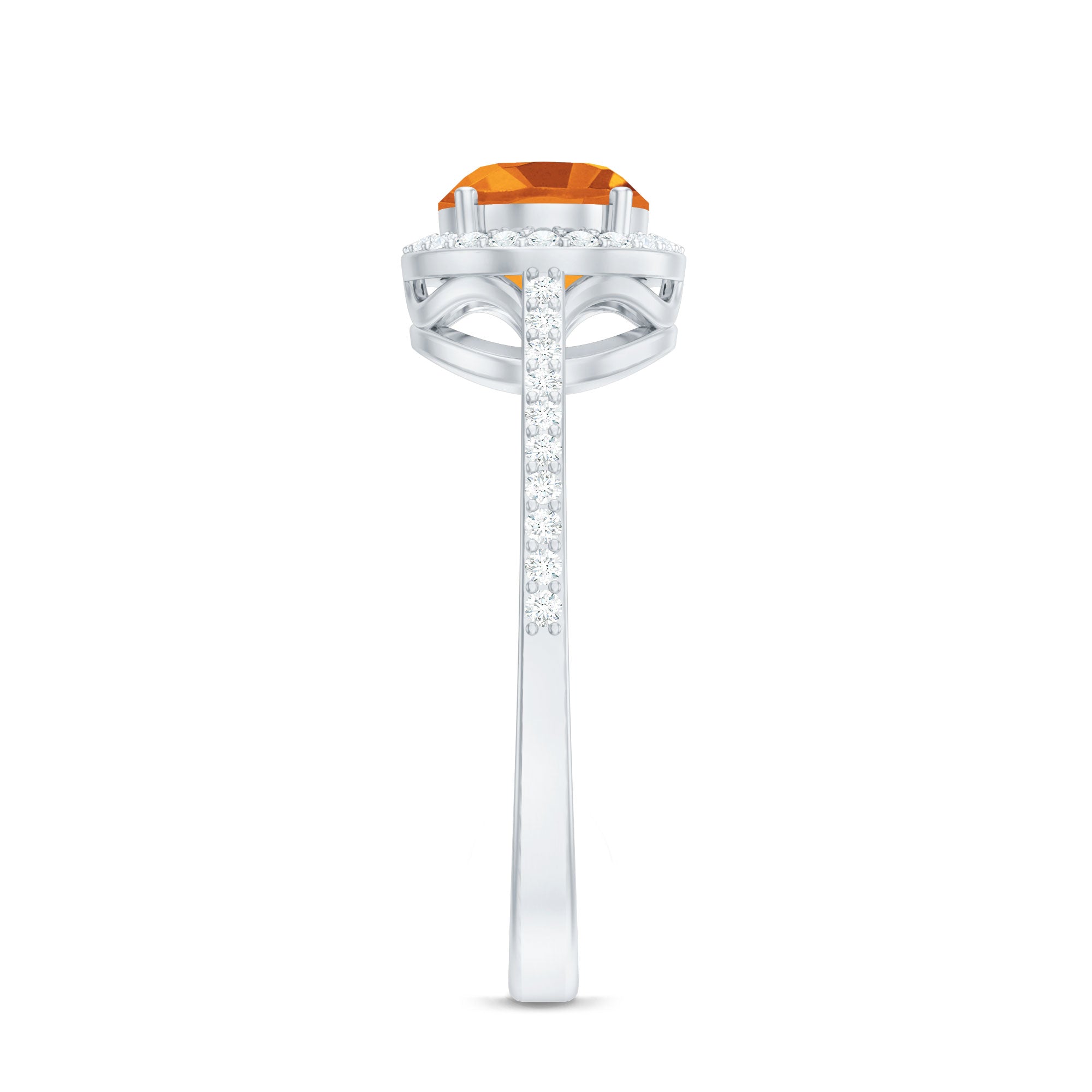 The oval citrine ring makes a classic choice for to-be brides. It is horizontally set on a gleaming shank for an unexpected twist. The center citrine stone is artfully framed by a halo of glistening Diamond. Additional Diamond bejewels the shank for a little extra sparkle. For those who want something timelessly trendy, this east west engagement ring is the fittest choice.