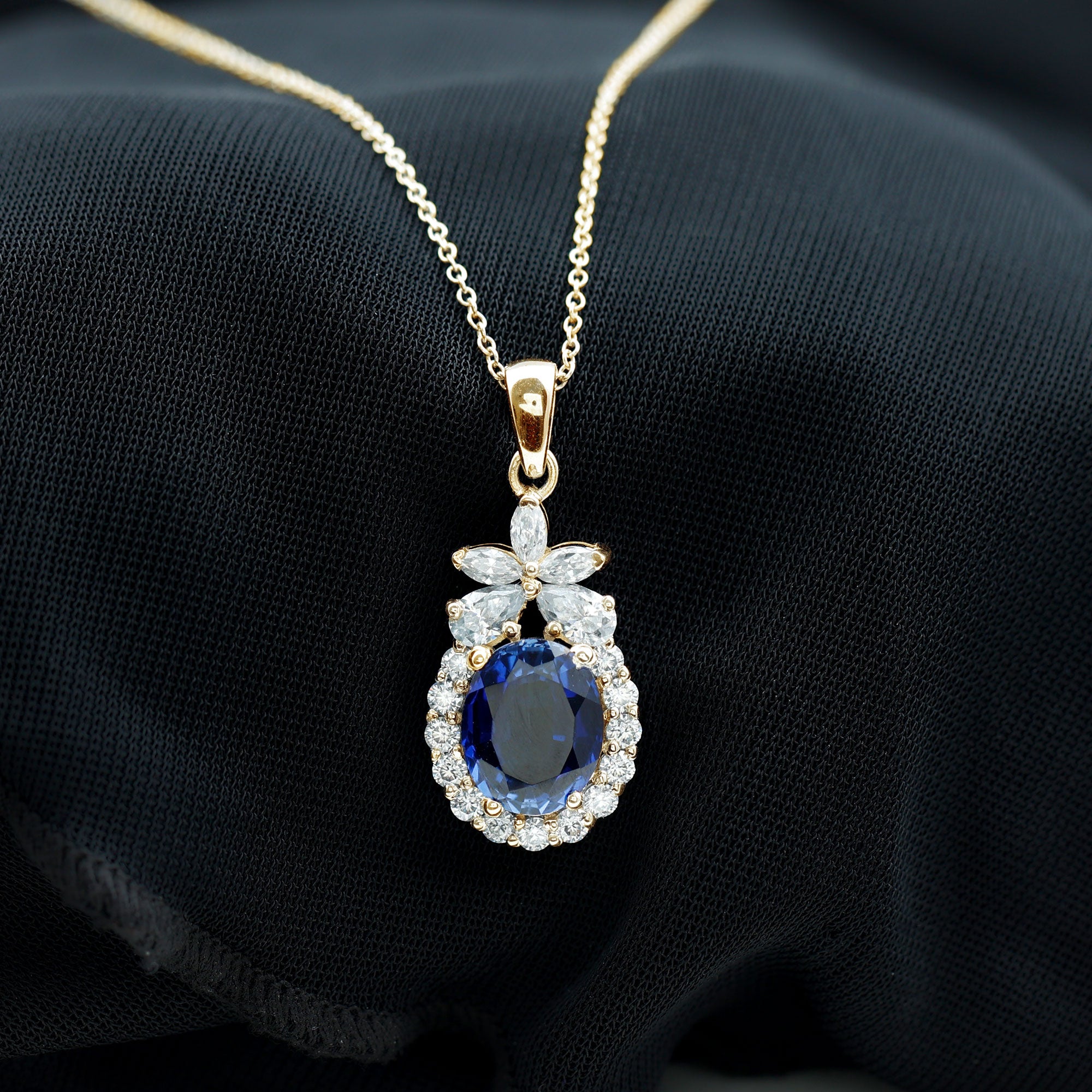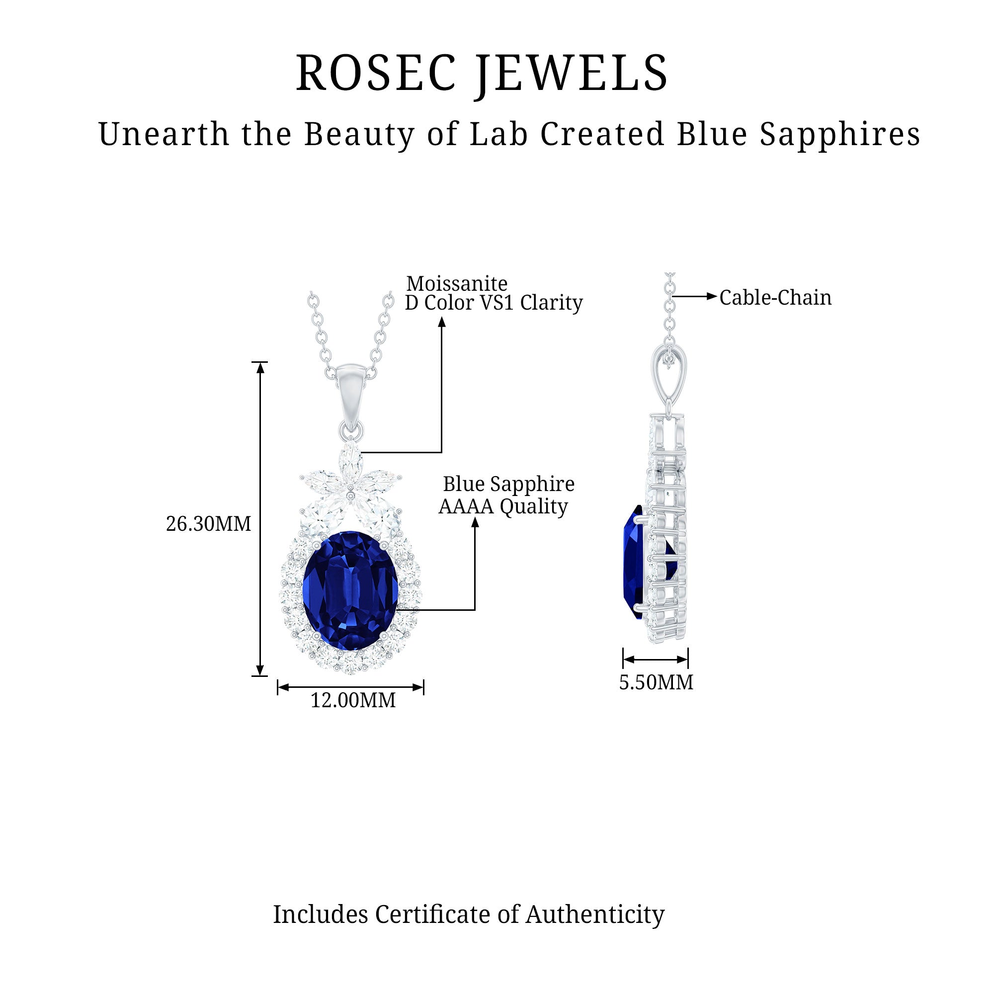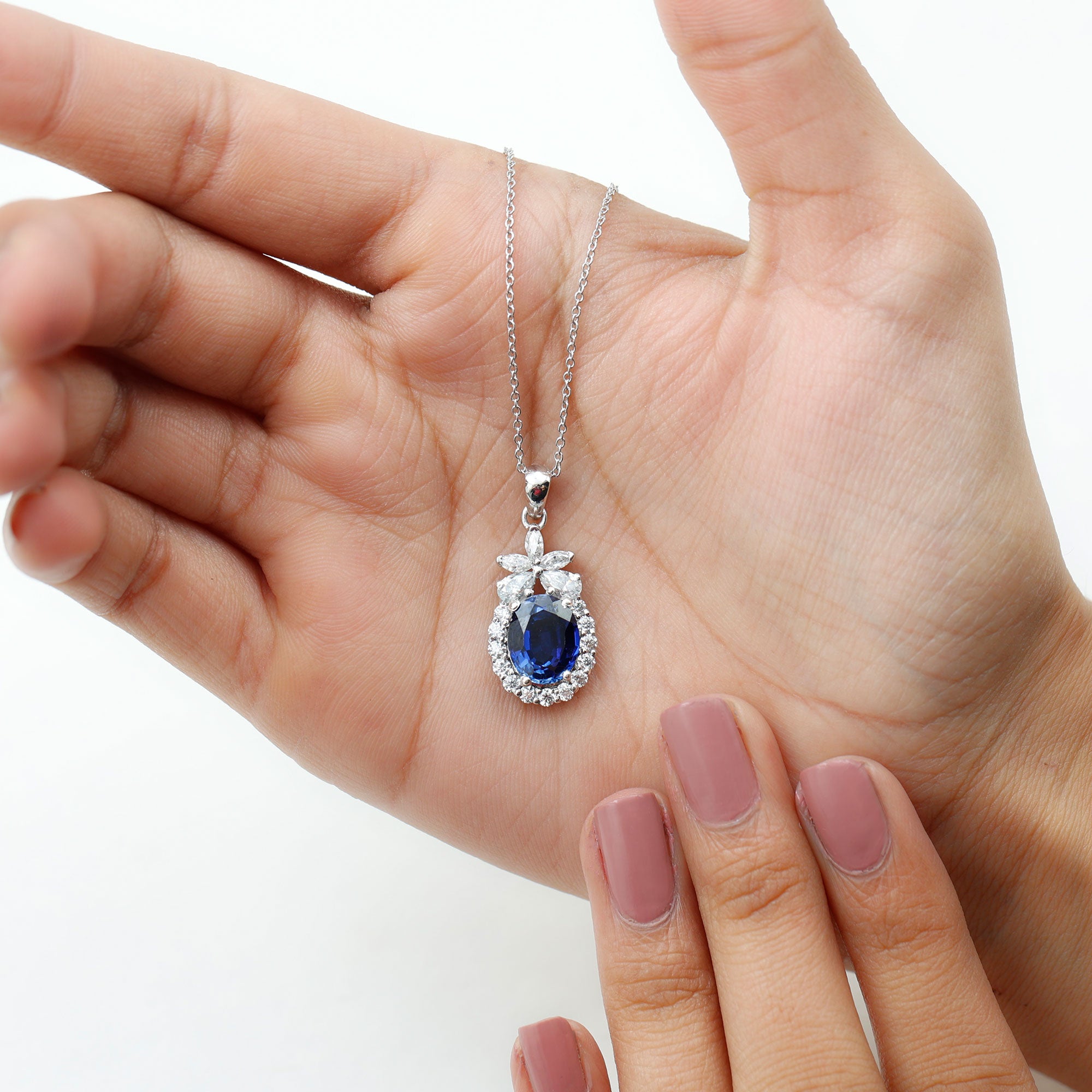 Discover the allure of our pendant necklace showcasing an oval created blue sapphire enveloped by a radiant round moissanite halo. The enchantment continues as pear-shaped and marquise-shaped moissanite accents add a touch of charm and glitter. Linked to a sleek and simple bale, this design achieves a perfect balance between timelessness and elegance.