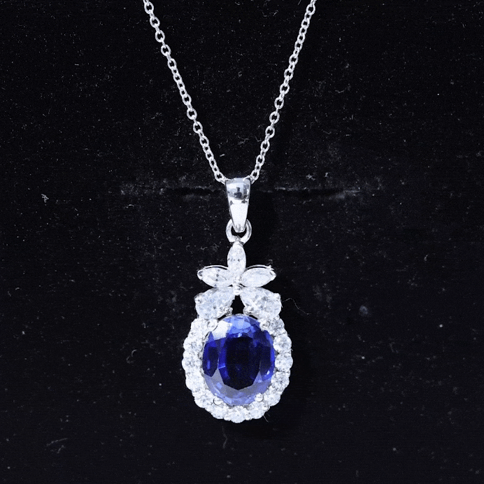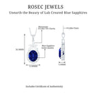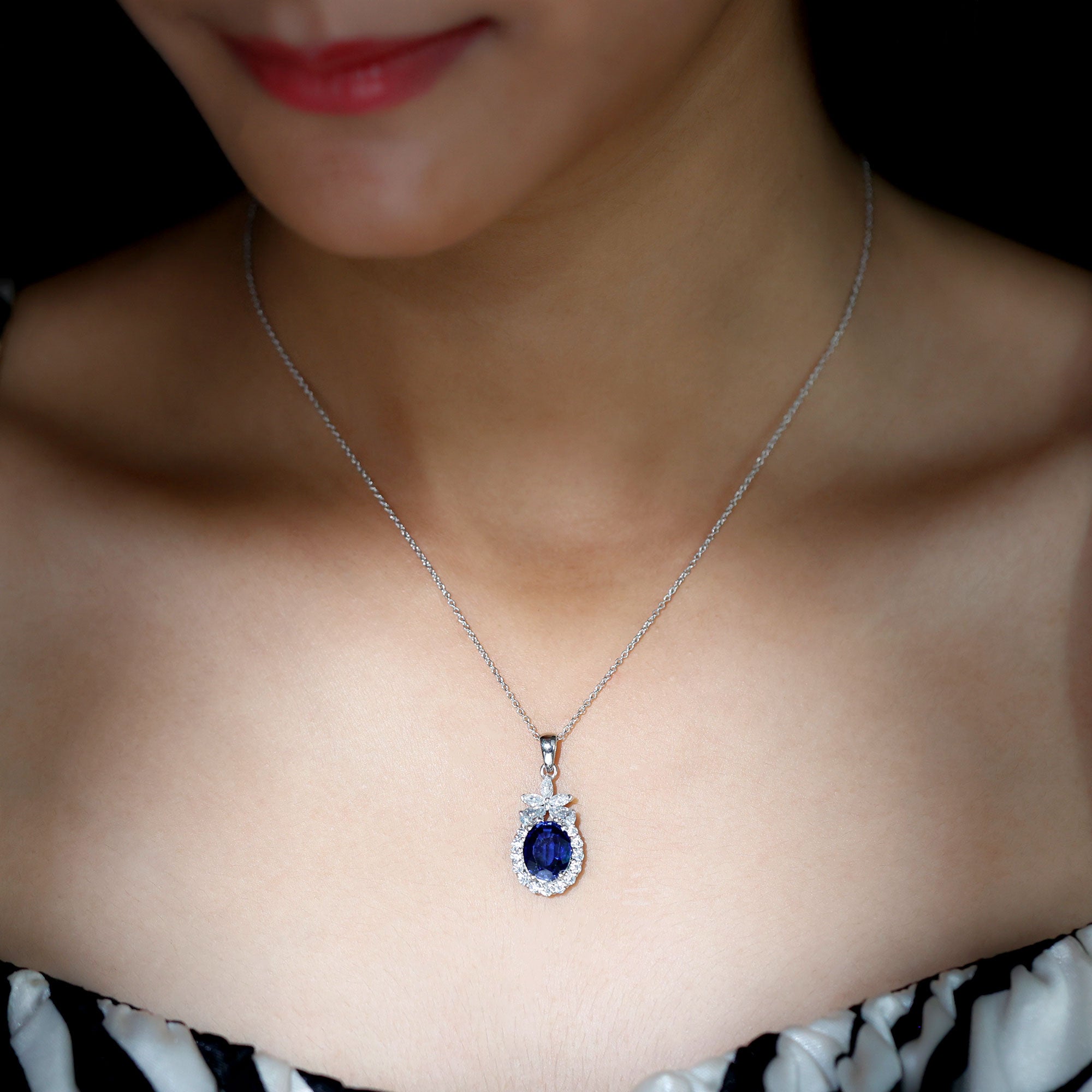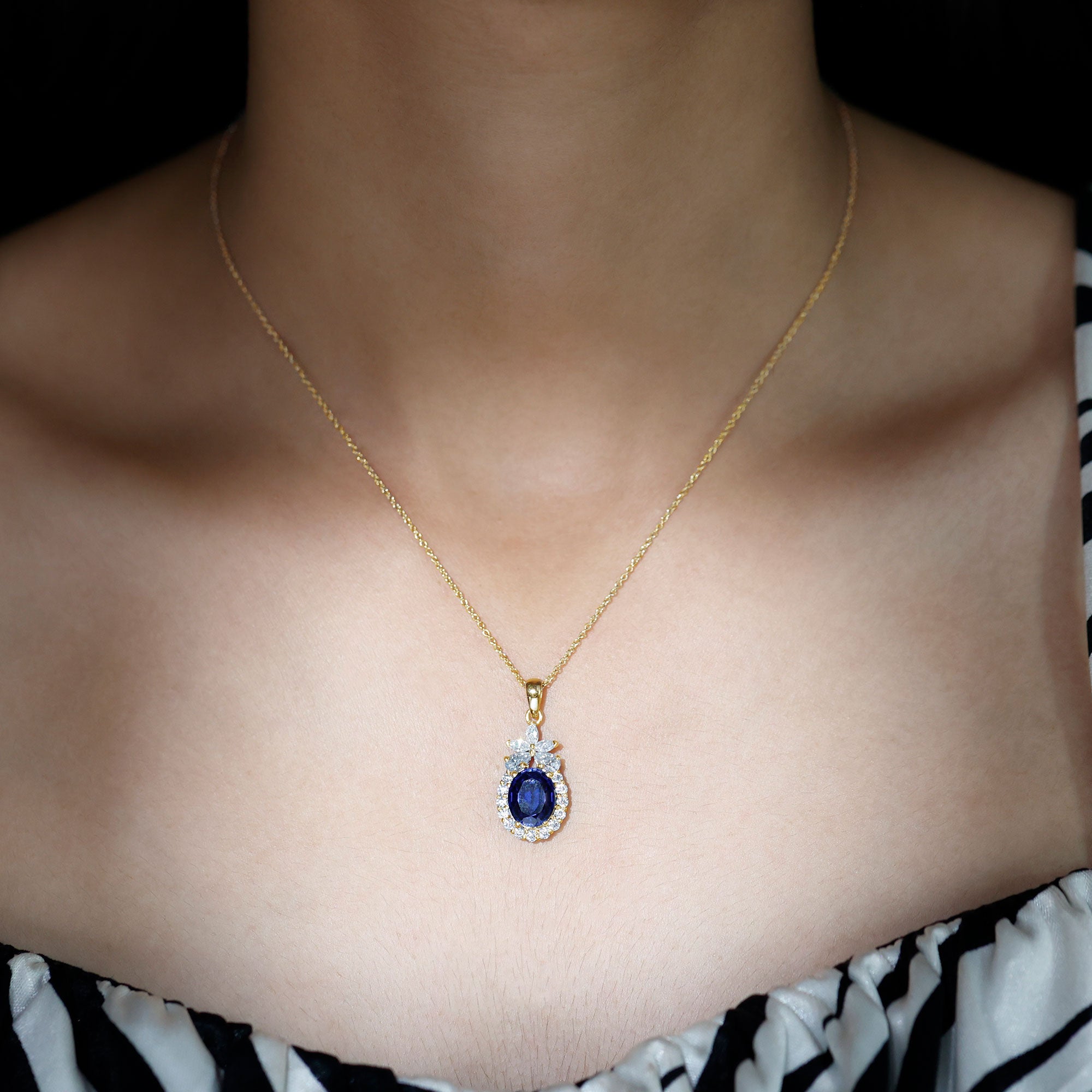 Discover the allure of our pendant necklace showcasing an oval created blue sapphire enveloped by a radiant round moissanite halo. The enchantment continues as pear-shaped and marquise-shaped moissanite accents add a touch of charm and glitter. Linked to a sleek and simple bale, this design achieves a perfect balance between timelessness and elegance.