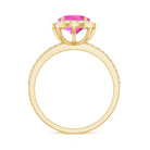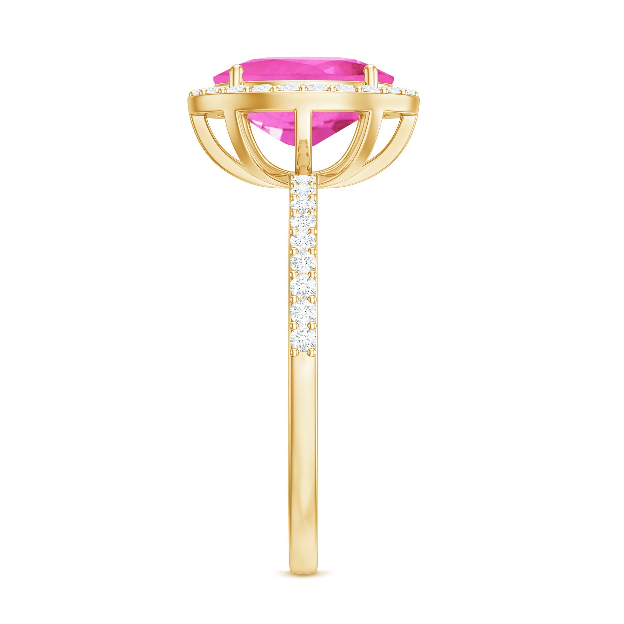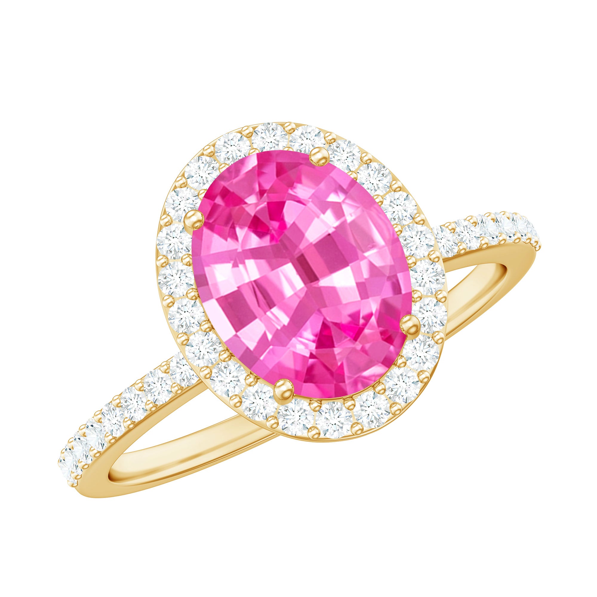 Immerse yourself in the irresistible charm of this halo engagement ring, designed to enthrall your heart. At its center lies a captivating oval lab-created Pink Sapphire, commanding attention and surrounded by a stunning Diamond halo that glistens from every perspective. This exquisite ring exudes beauty and grace, becoming a symbol of timeless sophistication and infinite love.