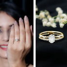 Win her heart with the stunning details of this Solitaire Engagement Ring, featuring a 5X7 MM Oval Cut Moissanite (D-VS1 quality) securely set in prongs. The unique double band shank brings an artistic touch, with one band embellished with a row of surface prong set round cut moissanites for a constant sparkle, while the other displays delicate marquise metal motifs and gemstones set alternately for a contemporary vibe. Together, these elements in this Moissanite Engagement Ring create the look of a stackable ring while ensuring the comfort of a single band. Designed to symbolize everlasting love, this Oval Moissanite Ring is perfect for the bride who values elegance, uniqueness, and timeless beauty. It comes beautifully packaged in a premium jewelry box, ready to be gifted and cherished for a lifetime. Made with precision and style, the Double Band Engagement Ring is offered in various metal types and colors, providing a luxurious and sustainable symbol of your connection.