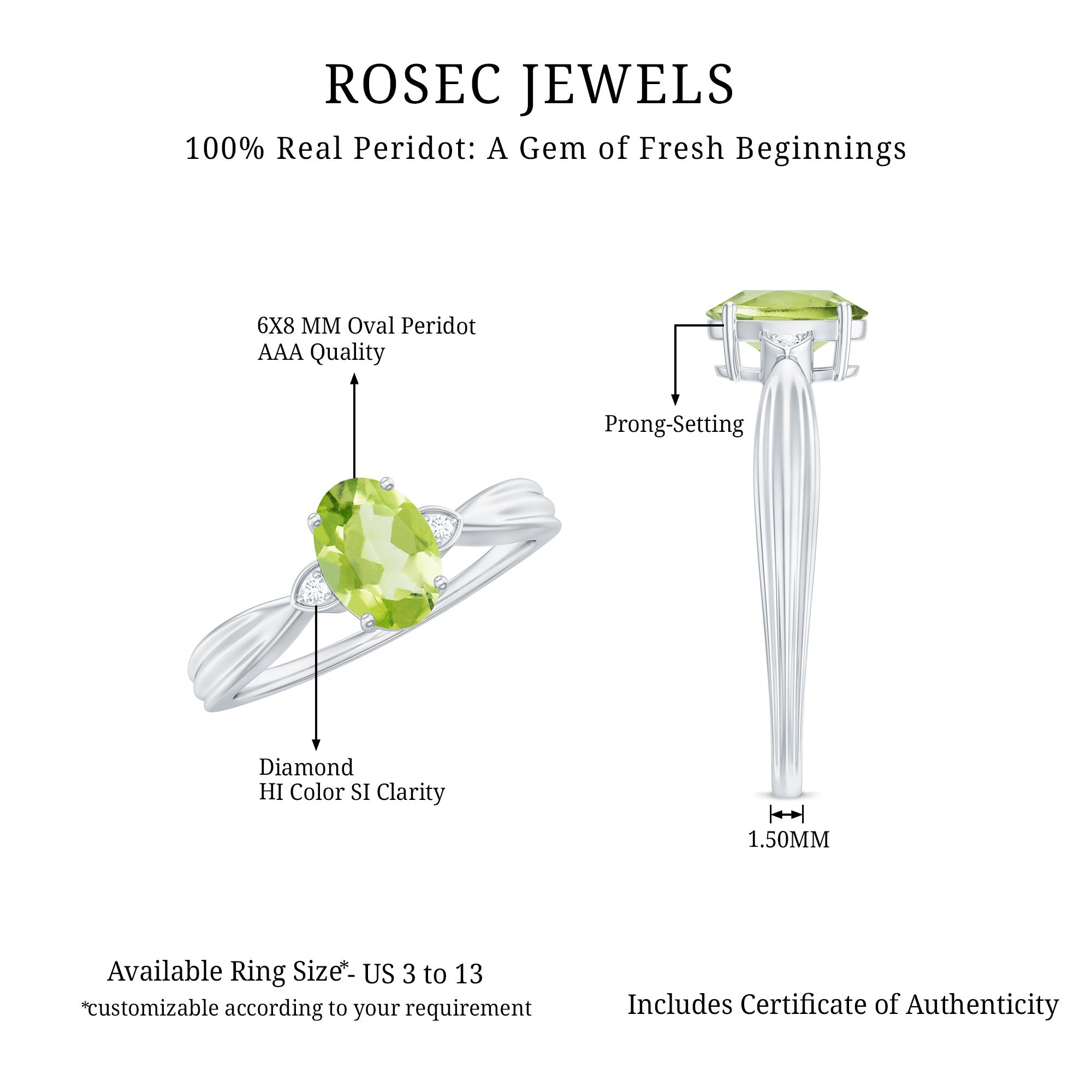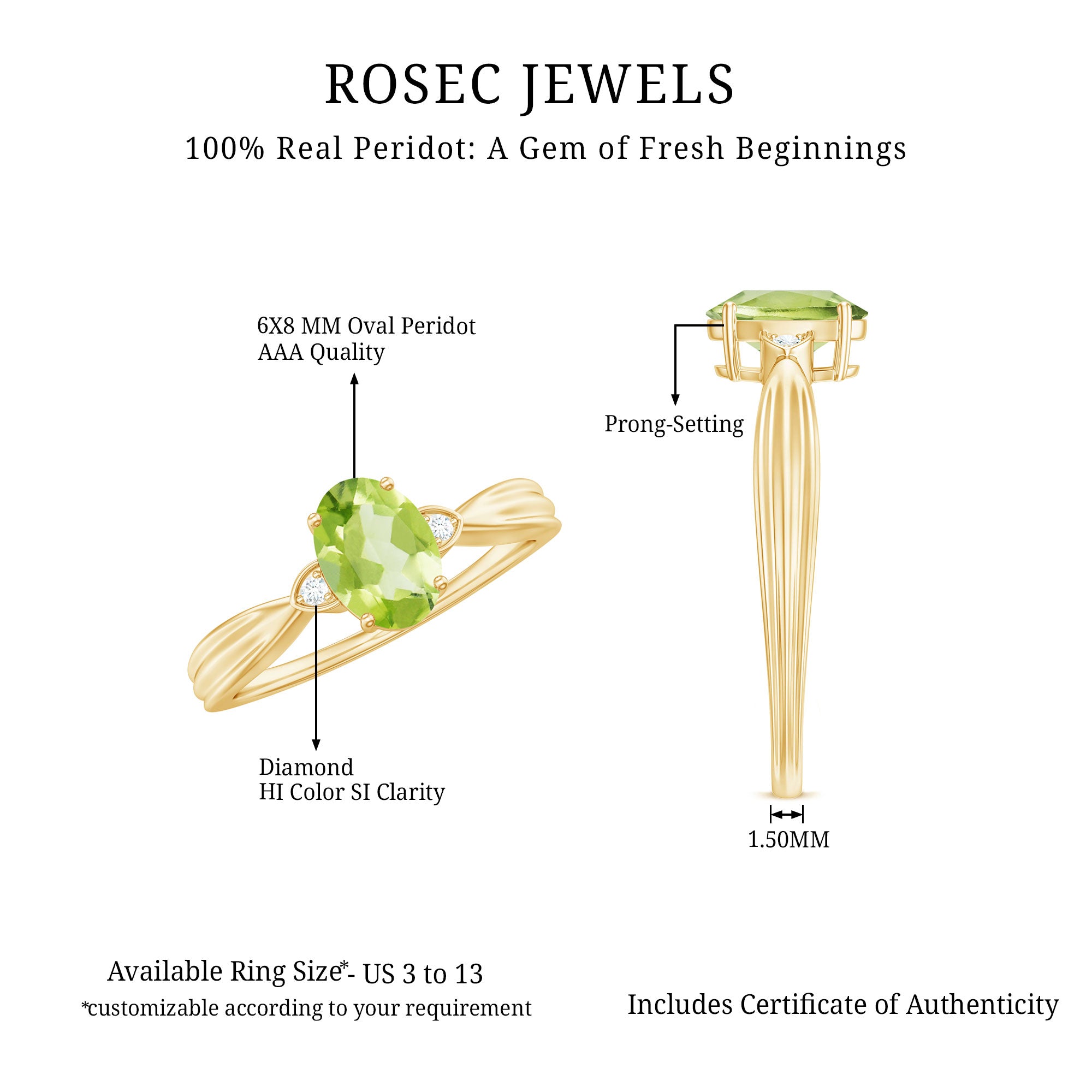 Elevate your style with this Oval Cut Peridot Solitaire Ring, adorned with a shimmering Diamond, a captivating symbol of grace and elegance.