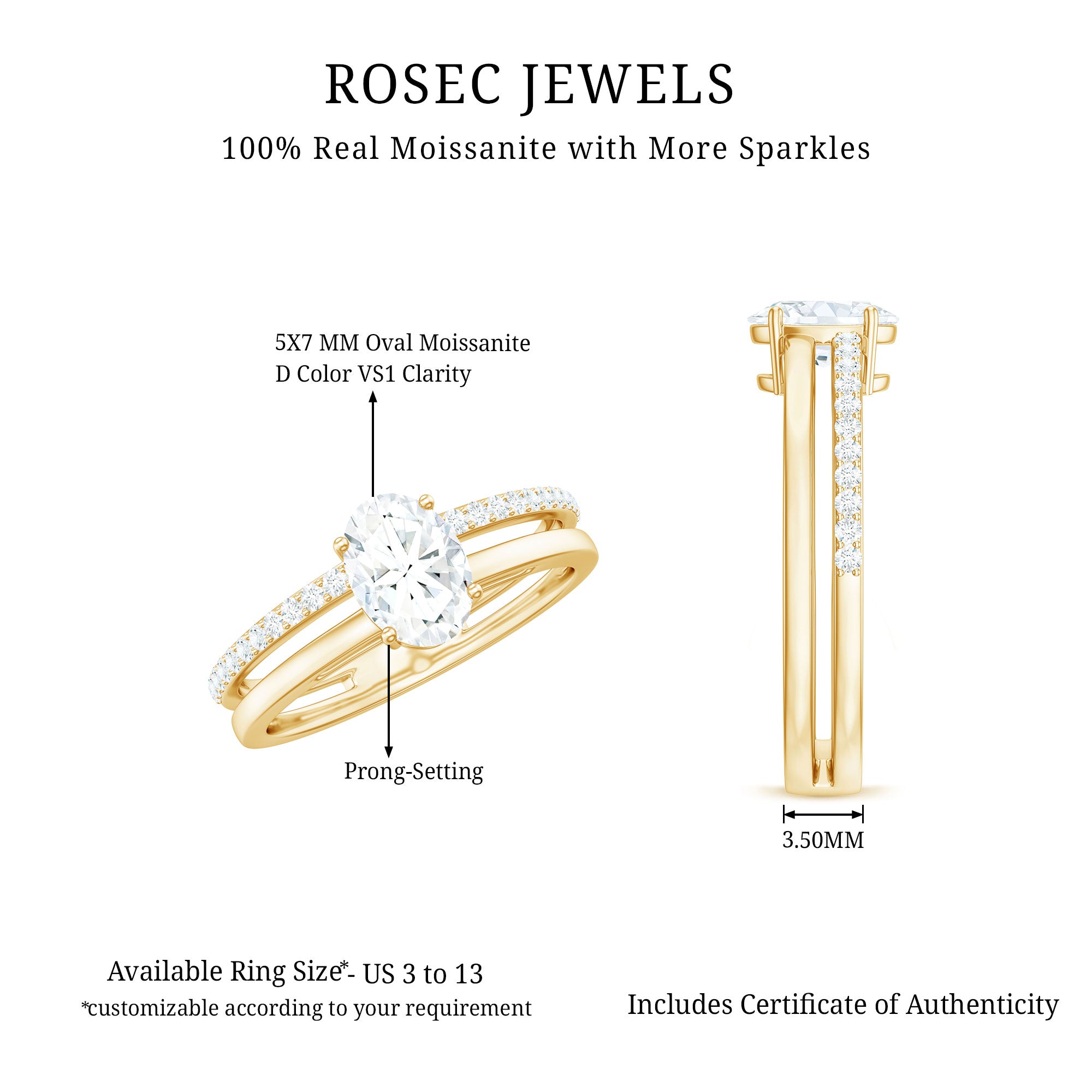 Capture her heart with the exquisite details of this Oblong Engagement Ring, which showcases a 5X7 MM Oval Cut Moissanite (D-VS1 quality) securely held in prongs. The distinctive double band shank adds an artistic flair, with one band adorned with a row of surface prong set round cut moissanites for a continuous sparkle, while the other features a sleek plain metal design. Together, these components in this Moissanite Engagement Ring give the appearance of a stackable ring while ensuring the comfort of a single band. Crafted to represent eternal love, this Oval Shaped Moissanite Ring is ideal for the bride who appreciates elegance, individuality, and timeless charm. It arrives beautifully packaged in a premium jewelry box, ready to be gifted and treasured for a lifetime. Made with precision and style, the Double Band Engagement Ring is available in a variety of metal types and colors, offering a luxurious and sustainable symbol of your bond.