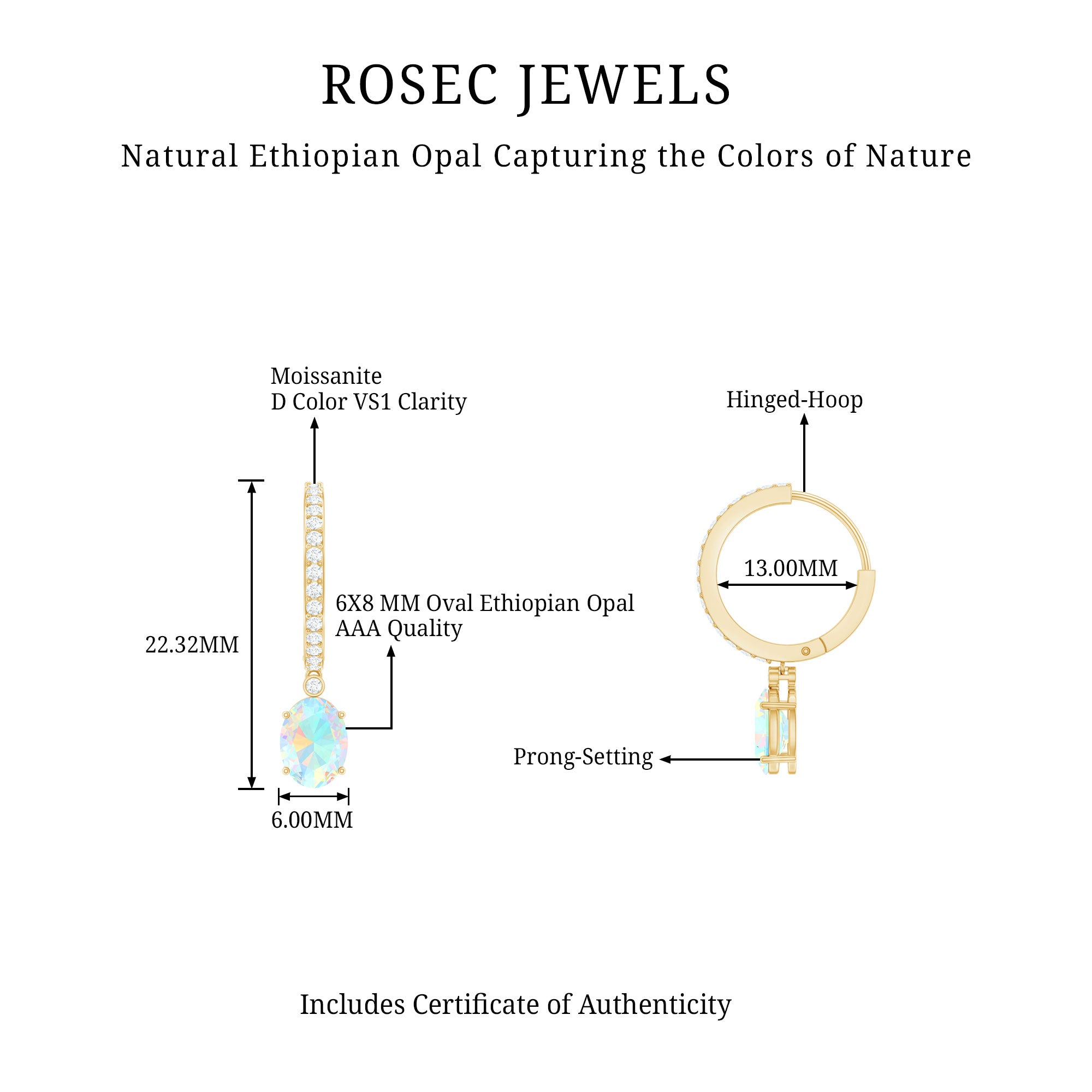 Elevate any outfit with these Hoop Drop Earrings, designed to make every moment feel special. Each earring showcases a 6X8 MM oval cut Ethiopian opal, held securely in prong setting to highlight its glowing colors. The opal’s vibrant hues catch the light beautifully, adding warmth and charm to the design. The hoops are accented with sparkling moissanites, forming a smooth trail of brilliance from top to bottom. This combination of AAA quality ethiopian opal and D-VS1 quality moissanite creates a luxurious look while maintaining a graceful style. Hinged hoop closures ensure the Ethiopian Opal Earrings stay safely in place, providing comfort whether worn during a busy day or a glamorous evening event. Ideal for anniversaries, birthdays, or other meaningful occasions, these Opal and Moissanite Earrings make a thoughtful and lasting gift. They pair effortlessly with formal attire or add a touch of sparkle to everyday outfits, making them a versatile and timeless addition to any jewelry collection. Carefully crafted with attention to detail, the Oval Hoop Earrings blend elegance, color, and brilliance in one stunning piece.