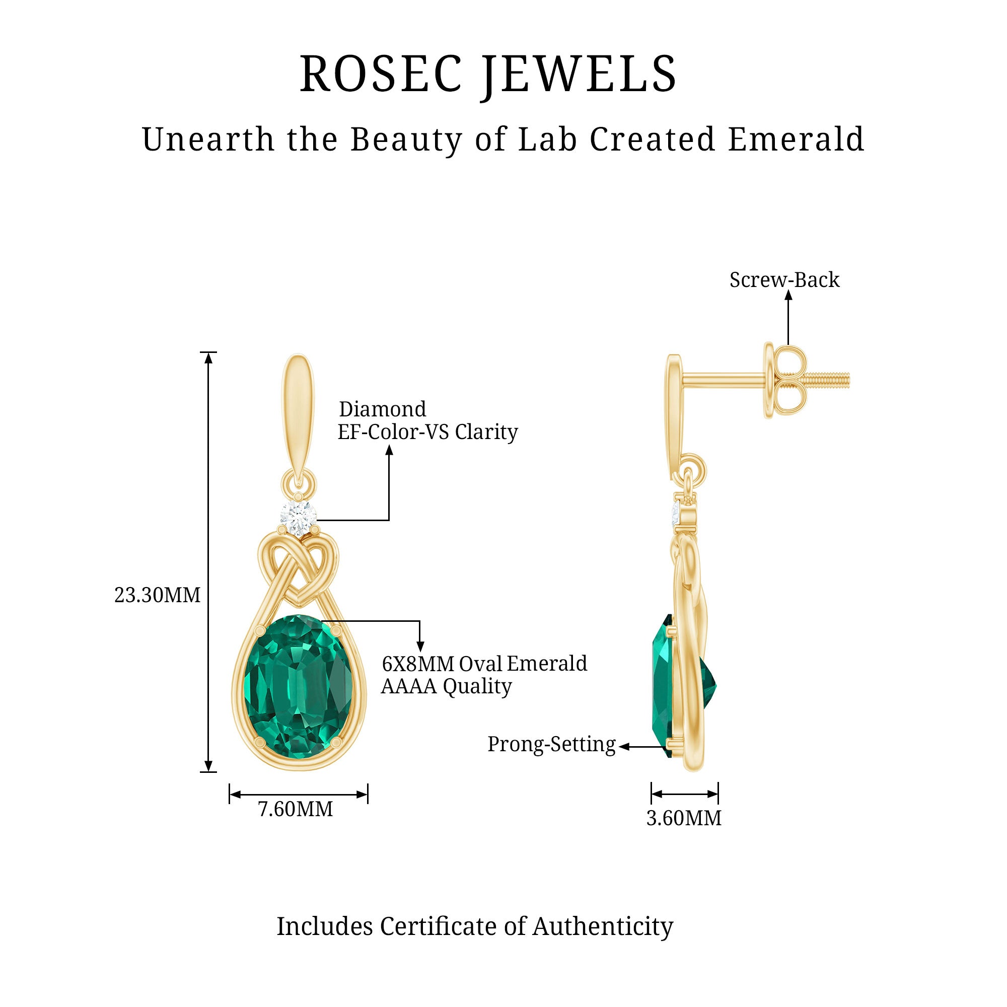 Seize every moment as a chance to shine with our Lab Created Emerald Drop Earrings. These artistically designed drop and Dangle Earrings feature an 6x8mm Oval Shaped Lab Created Emerald gracefully hanging down, with a Round Lab Grown Diamond placed at the top to complete the graceful design. Emerald drop not only radiates a green hue but also symbolizes abundance and success. Beautiful combination of Aaaa Quality Emerald and Ef-Vs Quality Diamond makes this Emerald Diamond Earrings exclusive, which everyone would love to have. Your style, your way and your presence will be a talk of the town.