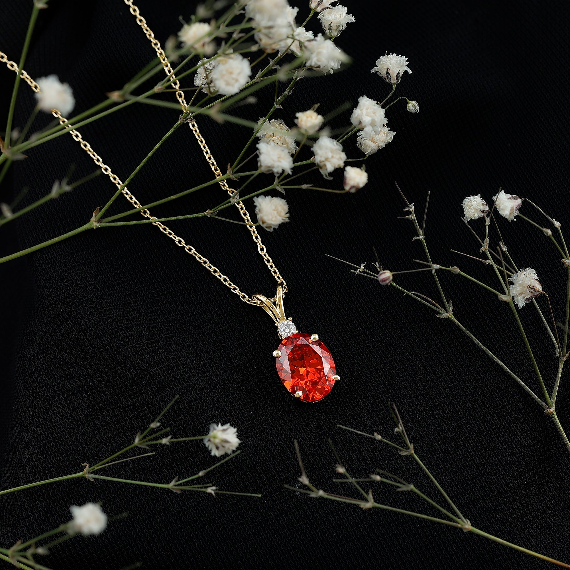 Take your fashion game to the next level with this mesmerizing Orange Sapphire Pendant Necklace that captures attention effortlessly. The centerpiece boasts an 8X10 MM oval shaped lab created orange sapphire, radiating a captivating and opulent orange hue that perfectly harmonizes with a dainty round moissanite gemstone. The Oval Sapphire Necklace showcases a sophisticated rabbit ear bail, adding a touch of elegance and luxury to the overall design. This Orange Stone Necklace is light, comfortable, and perfect for both daily wear and special occasions. Its simple yet graceful design gives it a timeless appeal that never goes out of style. The pendant’s craftsmanship and quality make it a piece to treasure for years to come. Get ready to shine and be admired with this stunning Solitaire Pendant that exudes unparalleled charm. Delivered in a luxurious jewelry box, this beauty is ready to create memories. Timeless, elegant, and ethically crafted, it provides a sparkle that endures for generations.