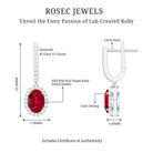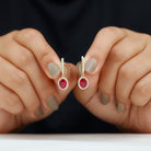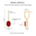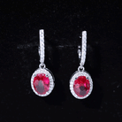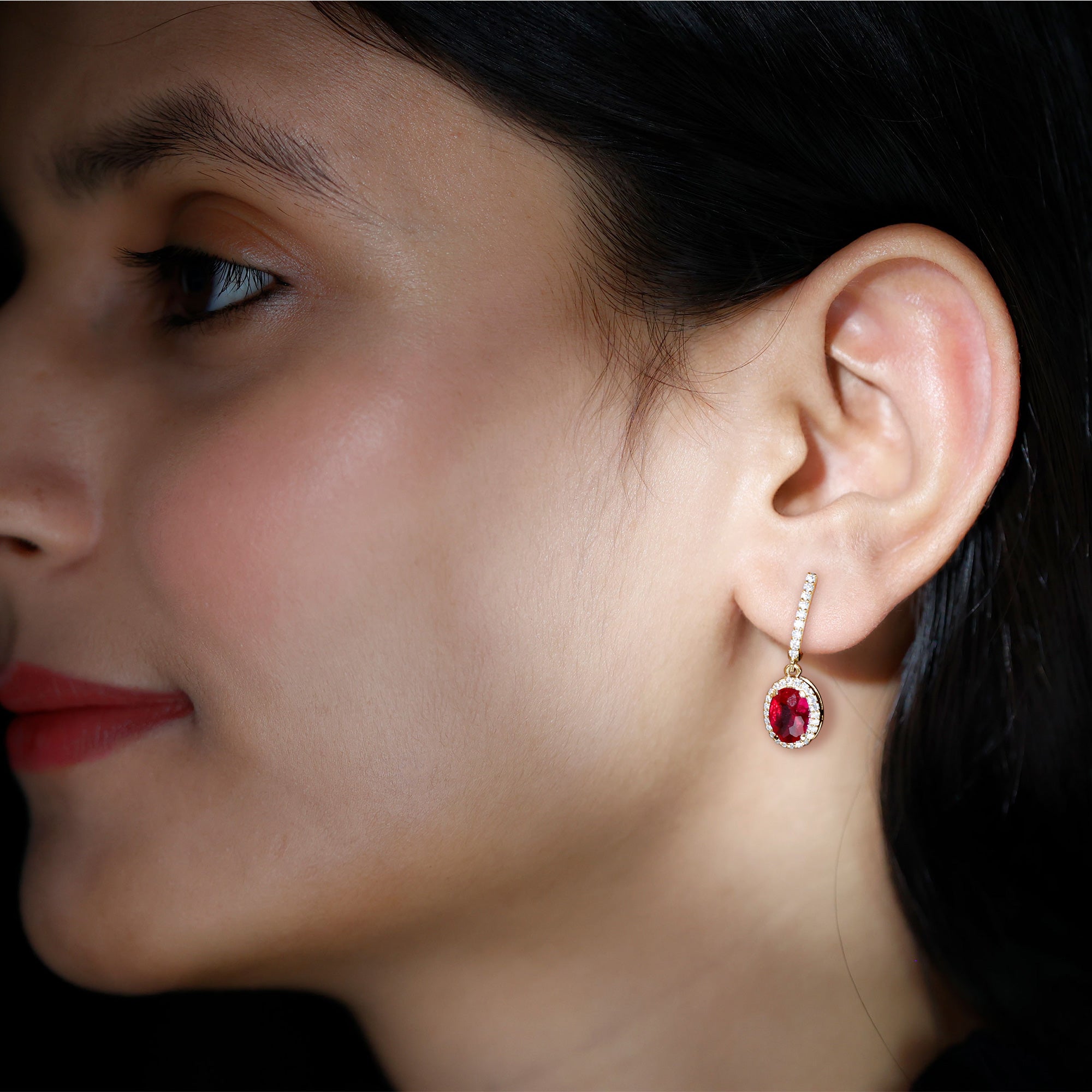 Upgrade your style with these elegant hoop drop earrings. They feature an oval-shaped Created Ruby solitaire set in a claw setting, surrounded by a halo of round-shaped Diamond stones. The Created Ruby center stone and the Diamond stones together create a beautiful harmony of color and sparkle, making them perfect for any occasion.