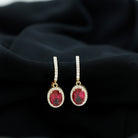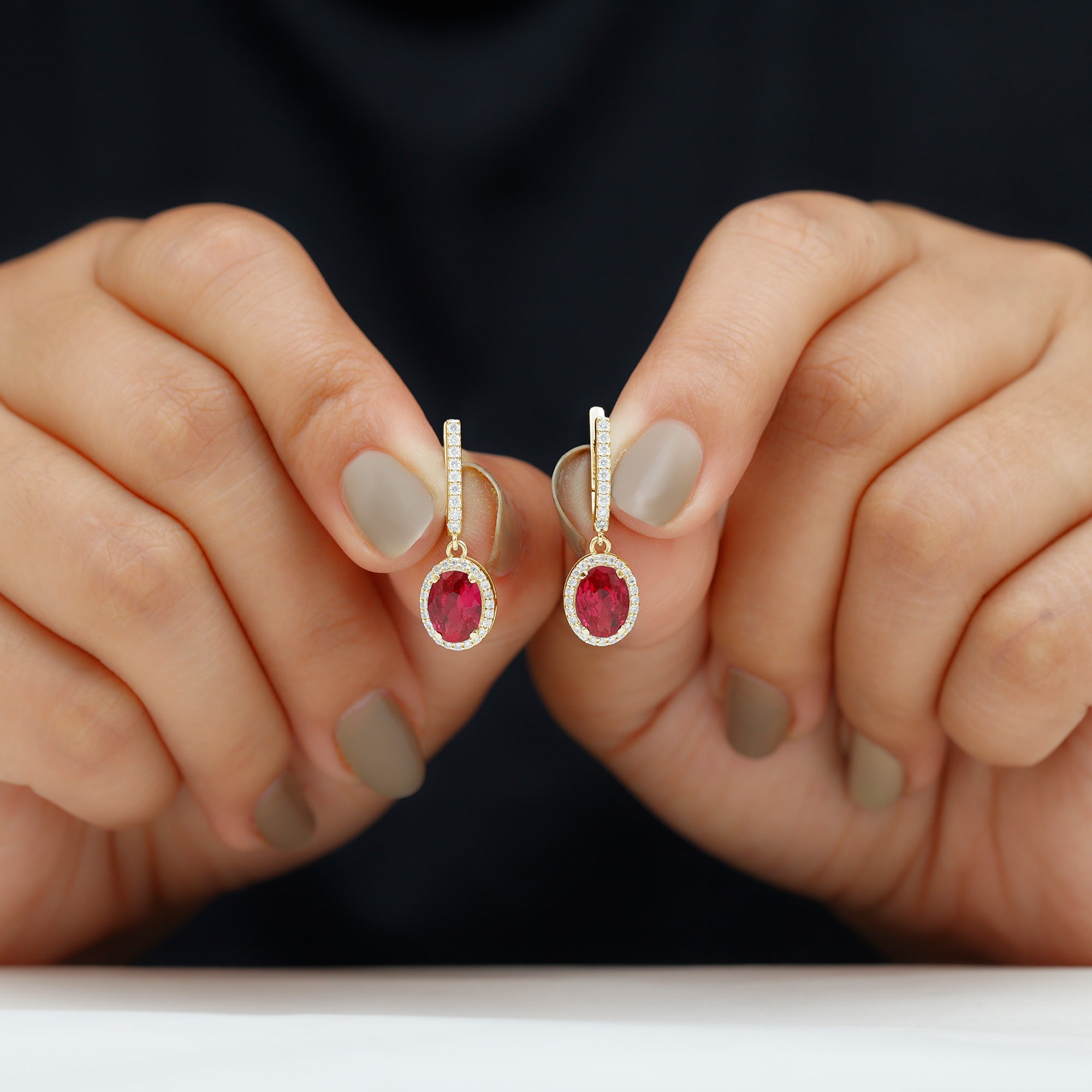 Oval Lab-Created Ruby Hoop Drop Earrings with Diamond Halo