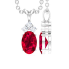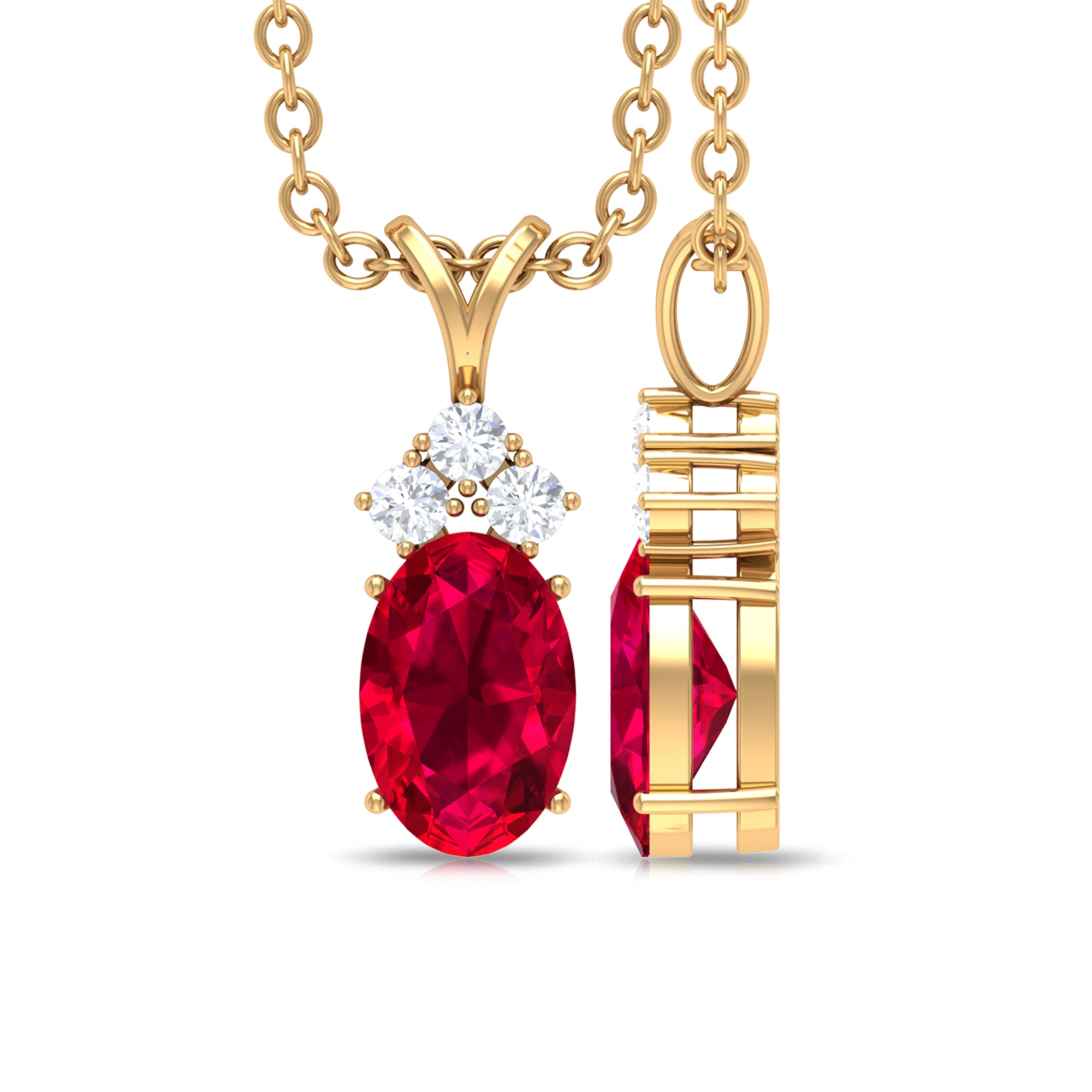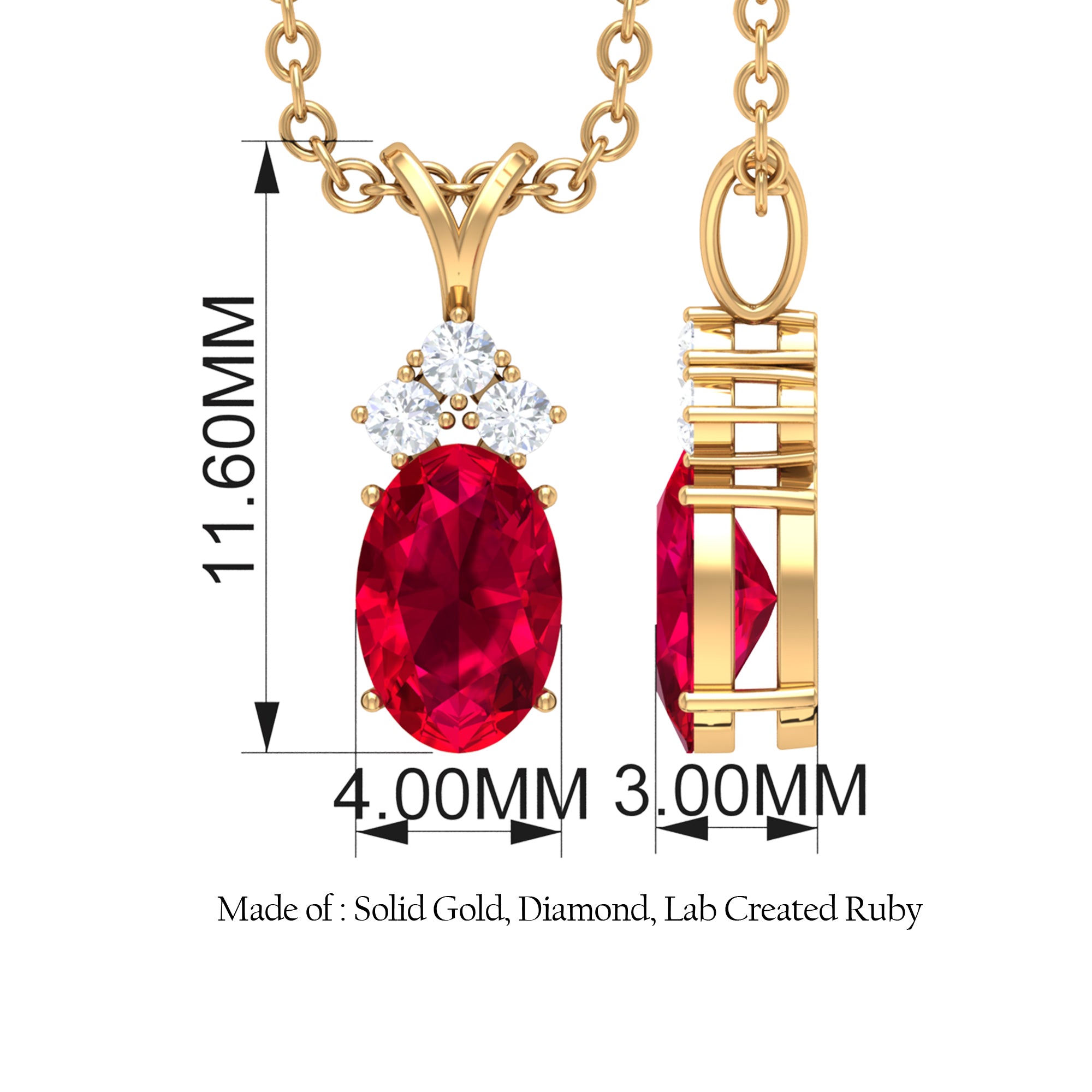 This Lab Grown Ruby Minimal Pendant exhibits a bright hue which can add a bold touch to your basic look. A 4X6 MM Oval Shape Lab Created Ruby is securely placed in prong set and with a glistening trio of diamonds, that adds an extra dose of sparkle to this minimalistic design. The unadorned sides of this Oval Shape Pendant keep up with its simple design, that allows you to go classic without going too over the top. This Solitaire Pendant will be delivered in a signature jewelry box to keep it safe and secure when not in use.