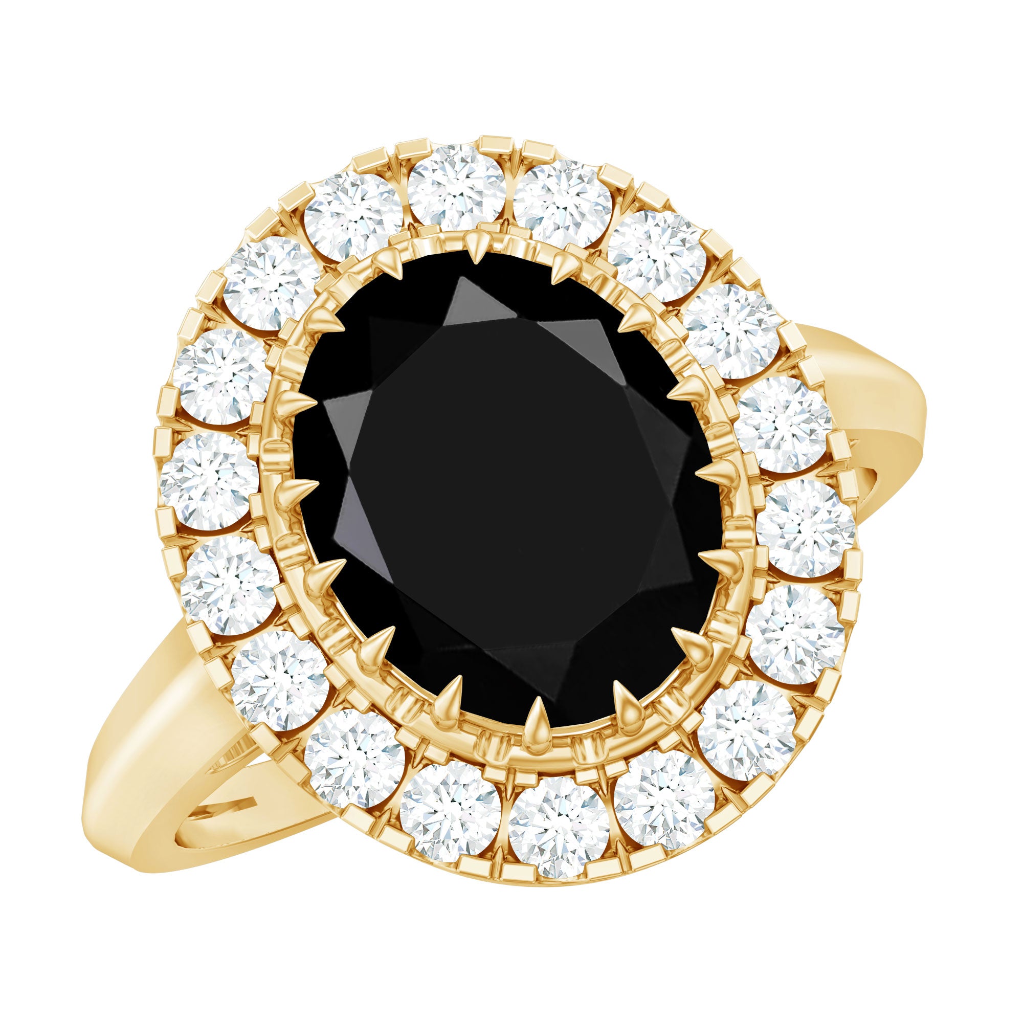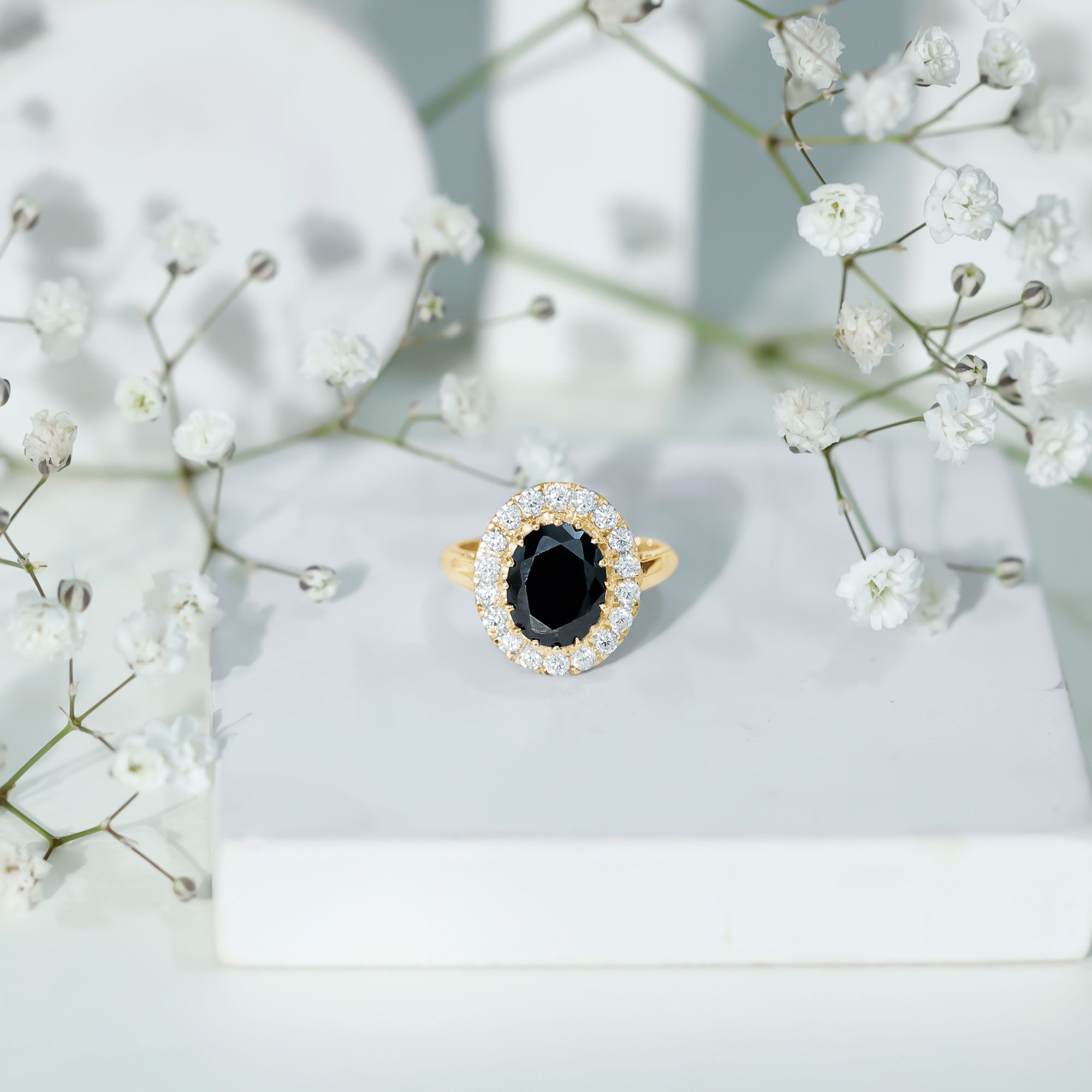 Gorgeous and romantic, this Engagement Ring showcases an Oval Cut Lab Grown Black Diamond secured by Claw Setting and Round Moissanites studded as Halo. . The Vintage Inspired Ring is also a wonderful gift for her. Whether it be an Anniversary Gift, Birthday Gift, or Valentines Day Gift.