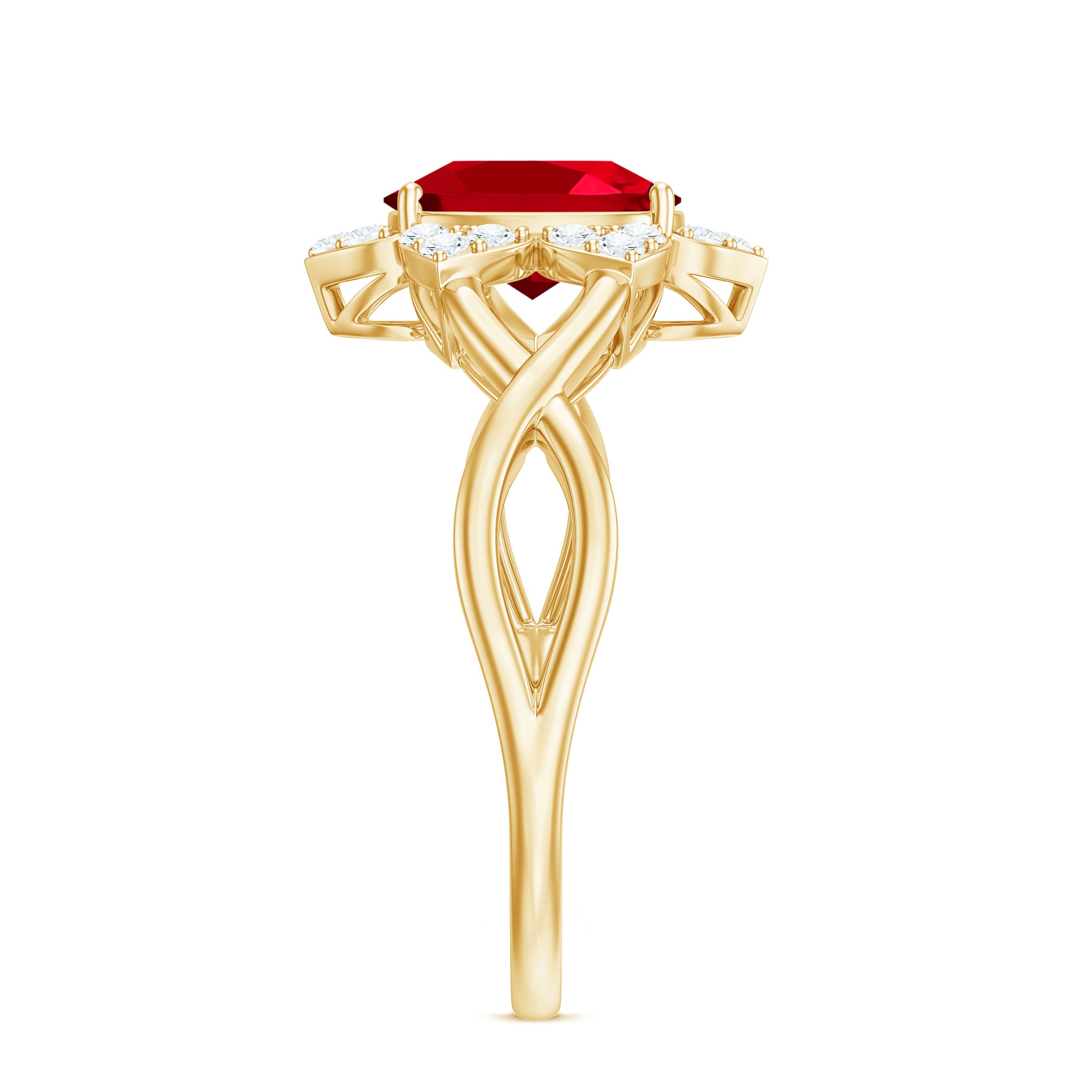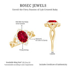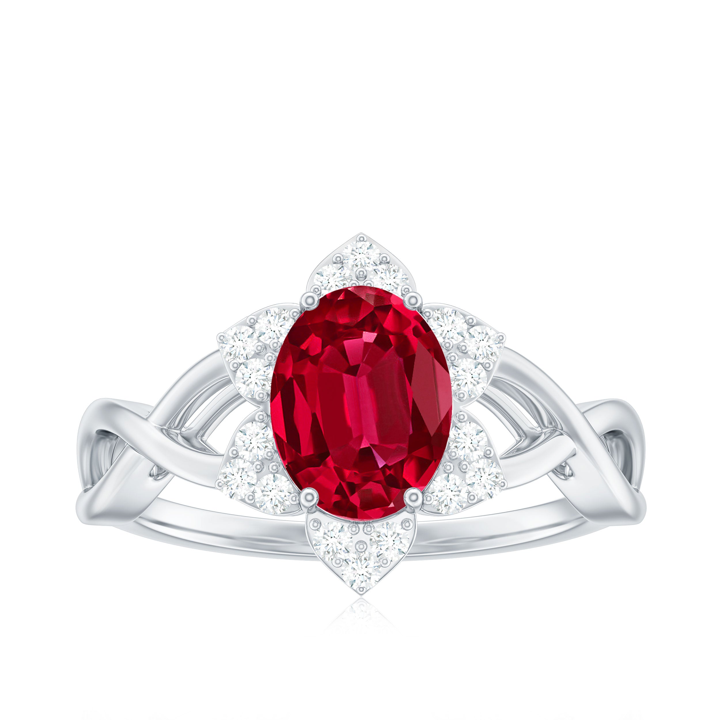 Celebrate romance with this Floral Ring. The Oval Shape Lab Created Ruby blooms at the center, embraced by a delicate Crossover design. Shimmering Diamond gemstones form a halo, enhancing its allure. This Lab Grown Ruby Ring captures the beauty of loves journey, making it a cherished symbol of devotion and elegance.