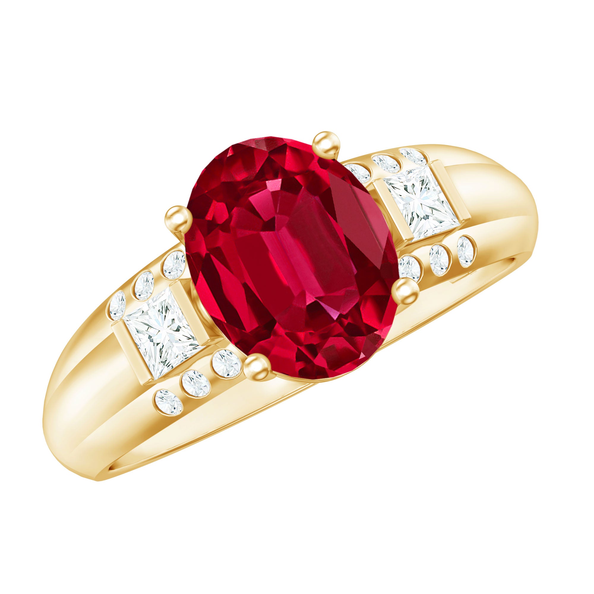 This Lab Created Ruby Engagement Ring is an excellent choice to make her feel cherished and unique. This ring features an 8X10 MM Oval shape Lab Grown Ruby is set at the center in Prong Setting with Princess Cut and Round Shape Diamonds on both sides of the center stone. This Oval Engagement Ring exudes a luxurious and classic shine which makes it perfect for the special day. This Statement Ring beholds a classic shine of AAAA Quality Lab Grown Ruby and HI-SI Quality Diamonds. Get her this Solitaire Engagement Ring and witness a priceless expression.
