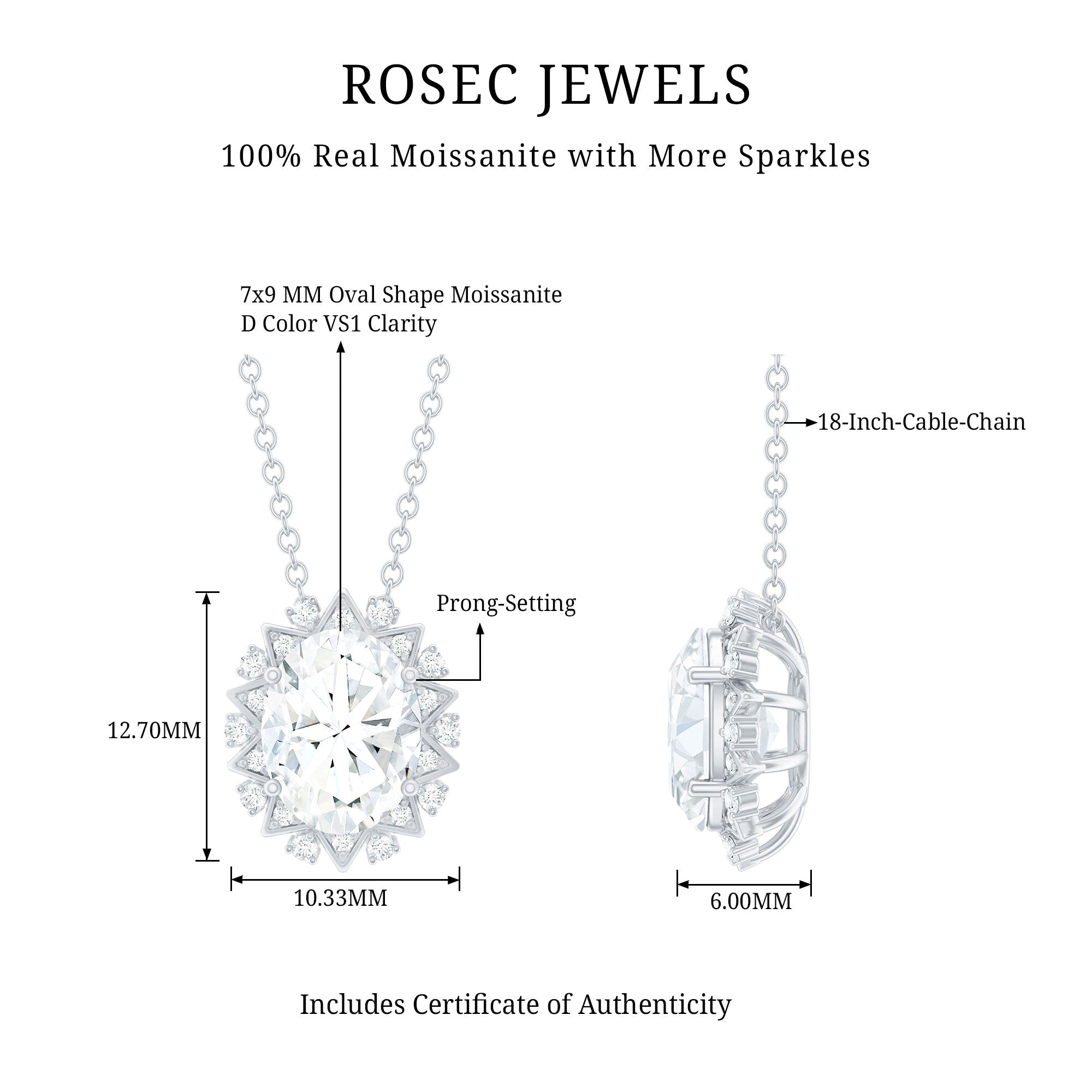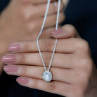 Enhance your bridal look with this stunning Moissanite Pendant Necklace. Crafted from 14K white gold plated silver, this exquisite piece showcases a 7X9 MM oval Moissanite encircled by a zigzag design and a halo adorned with round Moissanites. Featuring D Color VS1 Clarity stones and a brilliantly polished finish, this Oval Cut Pendant gracefully hangs from a cable chain secured with a lobster clasp, which allows you to adjust the length according to your preference. Wear this Wedding Necklace for Bride with assurance and let it dazzle, captivating everyone around you. Elevate any outfit with this unique accessory. It also makes a perfect sparkling gift for mother of bride. Grab all eyes with this breathtaking Oval Moissanite Necklace that elevates style in just a blink. Redefine classic elegance by highlighting timeless sophistication with this pendant, a remarkable jewelry piece that radiates sparkle and flair.