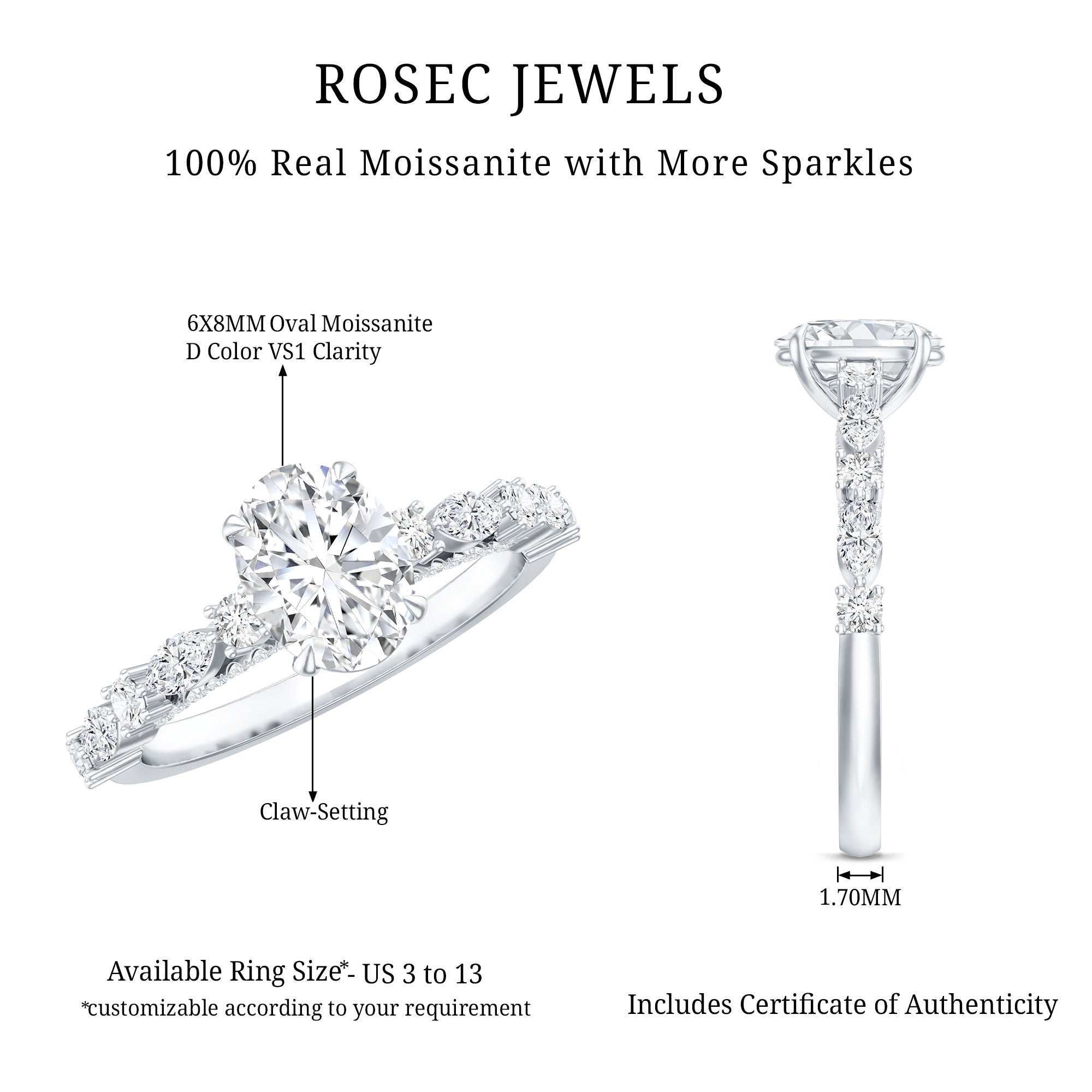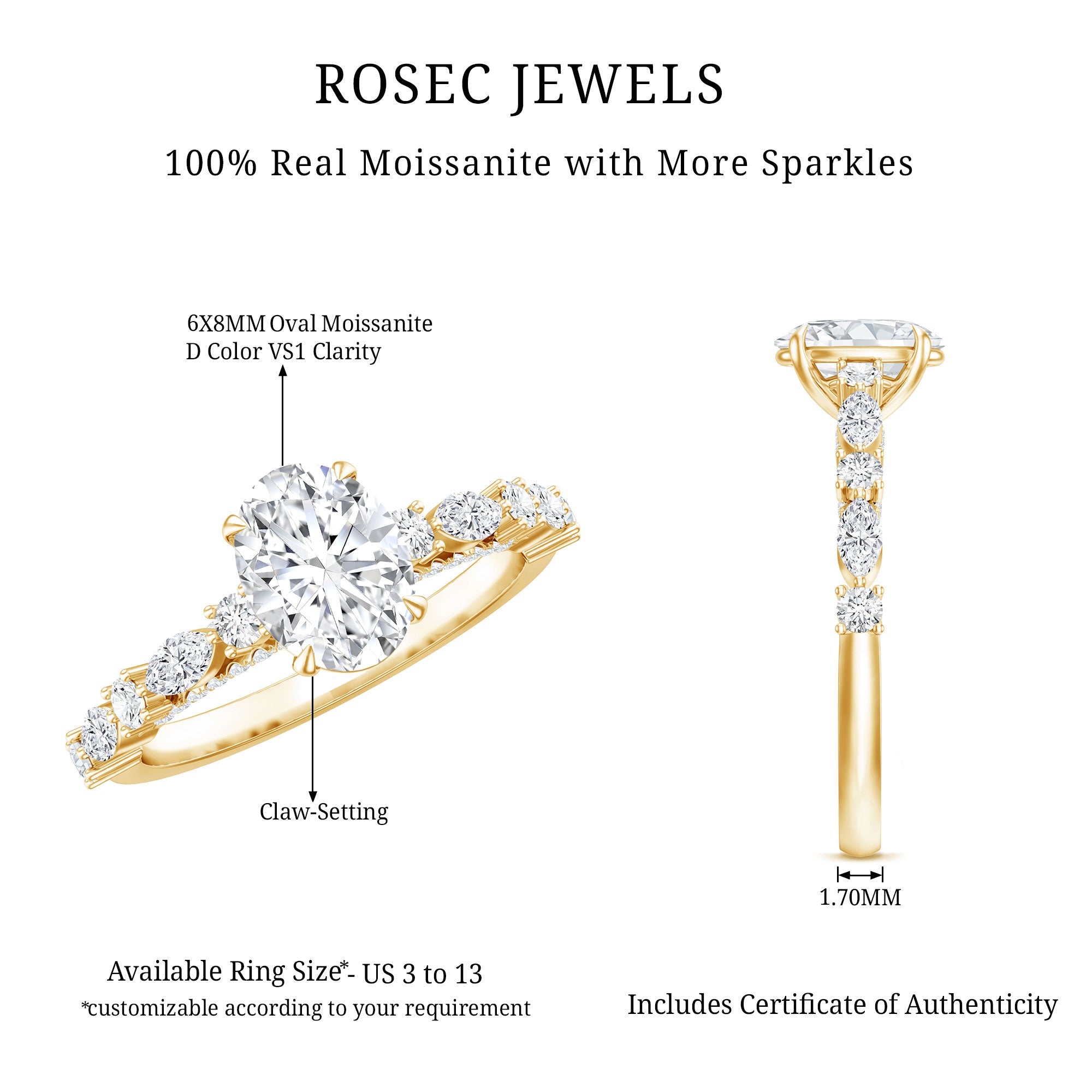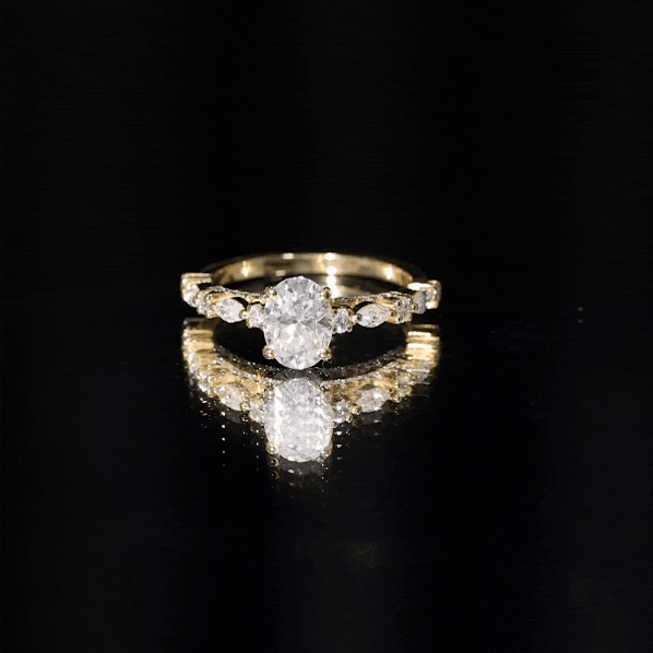 A beautiful promise of love comes alive in this Solitaire Moissanite Engagement Ring, created to reflect elegance and meaning in one stunning design. It is embellished with a 6X8 MM oval shaped moissanite, held securely in claw setting that allows it to sparkle with unmatched brilliance. The band is decorated with alternating marquise and round cut moissanite stones on each side, adding a delicate shimmer that complements the center gem perfectly. Hidden beneath the main stone is a fine row of round cut moissanites, offering a soft glow and a thoughtful touch that makes the Oval Shaped Engagement Ring even more special. This small detail adds charm, creating a piece that feels unique and personal. The smooth band ensures a comfortable fit, allowing it to be worn daily while keeping its beauty intact. Each moissanite is carefully chosen for its D color and VS1 clarity, offering the appearance of fine diamonds while being an ethical and lasting choice. The overall look is graceful yet simple, perfect for someone who values understated luxury. Designed with care and crafted for love, this 1 Carat Moissanite Ring captures the essence of devotion and harmony. It is a symbol of connection, meant to be cherished for a lifetime.