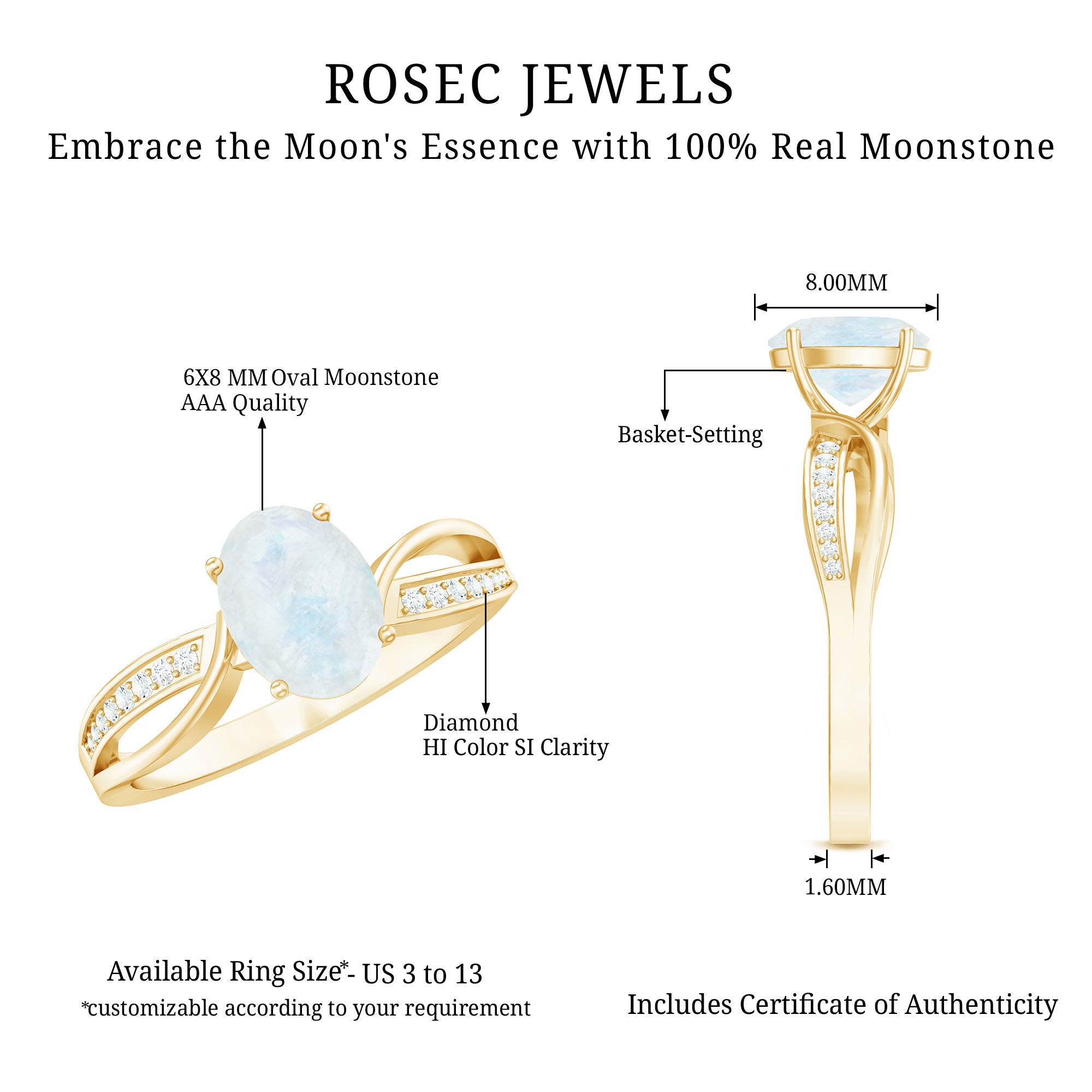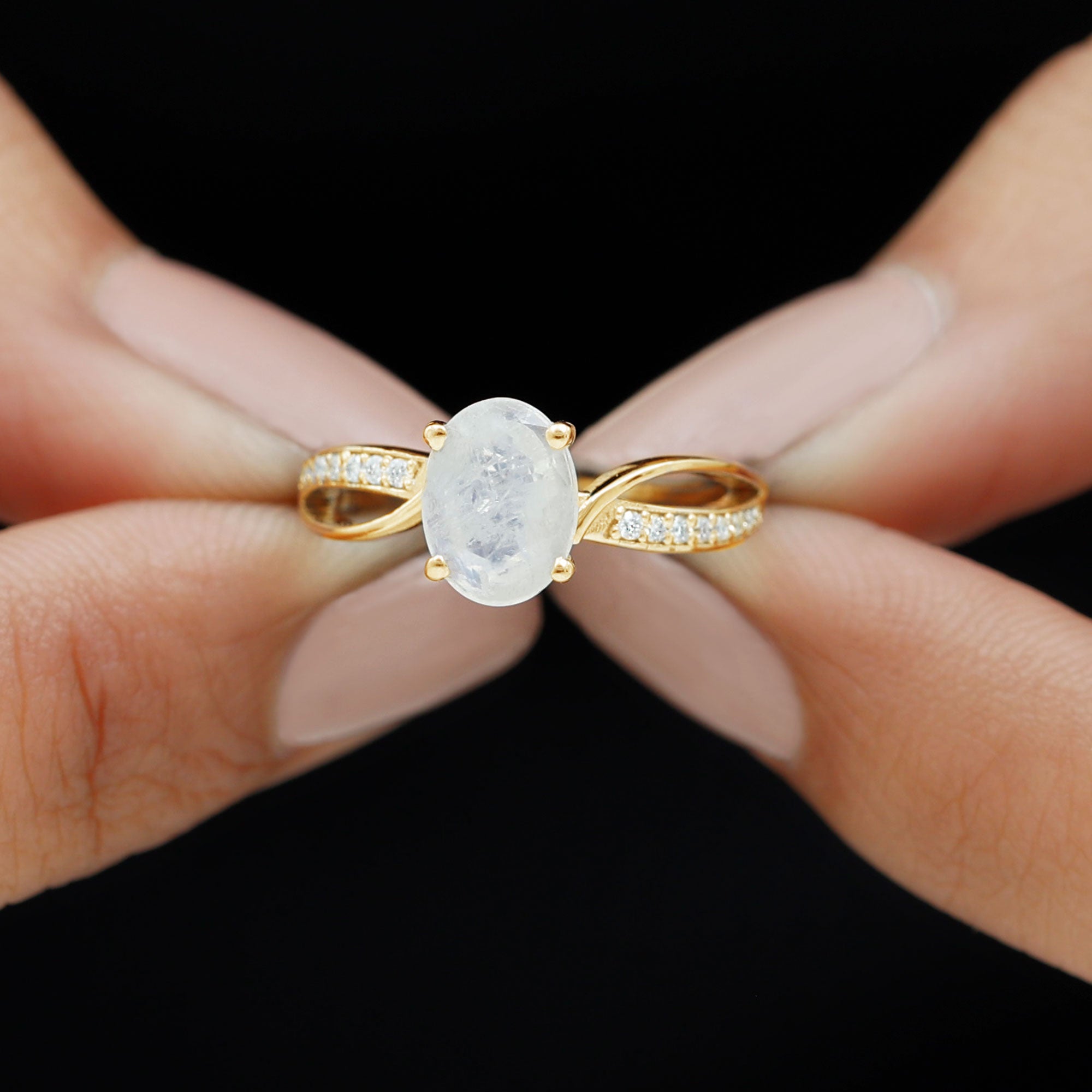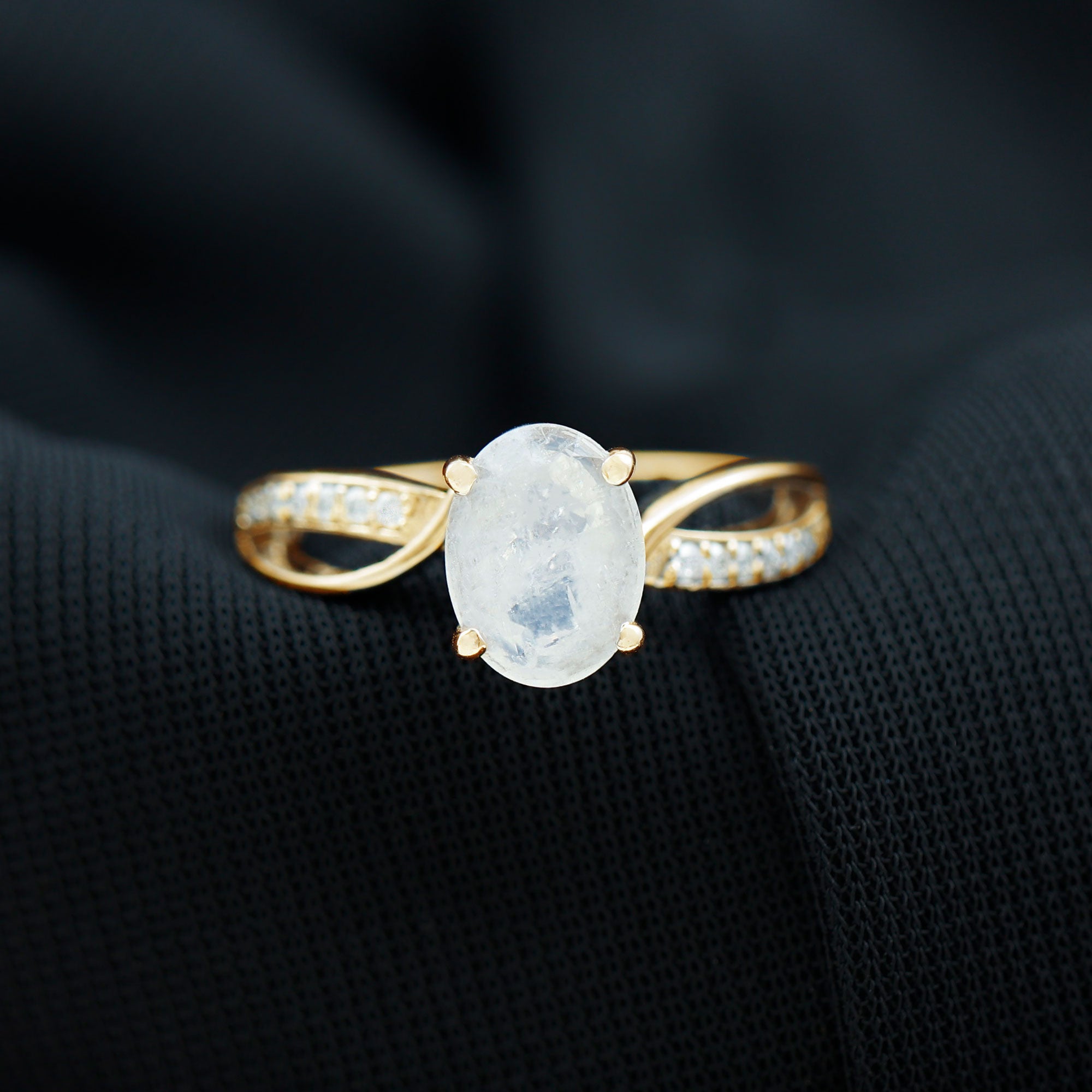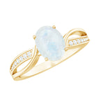 Capture your partners heart anew with the captivating Natural Solitaire Engagement Ring. This ring features an oval-cut Moonstone delicately cradled in a basket-setting. The remarkable split shank is adorned with round-cut Diamond gemstones, adding to its allure and beauty.