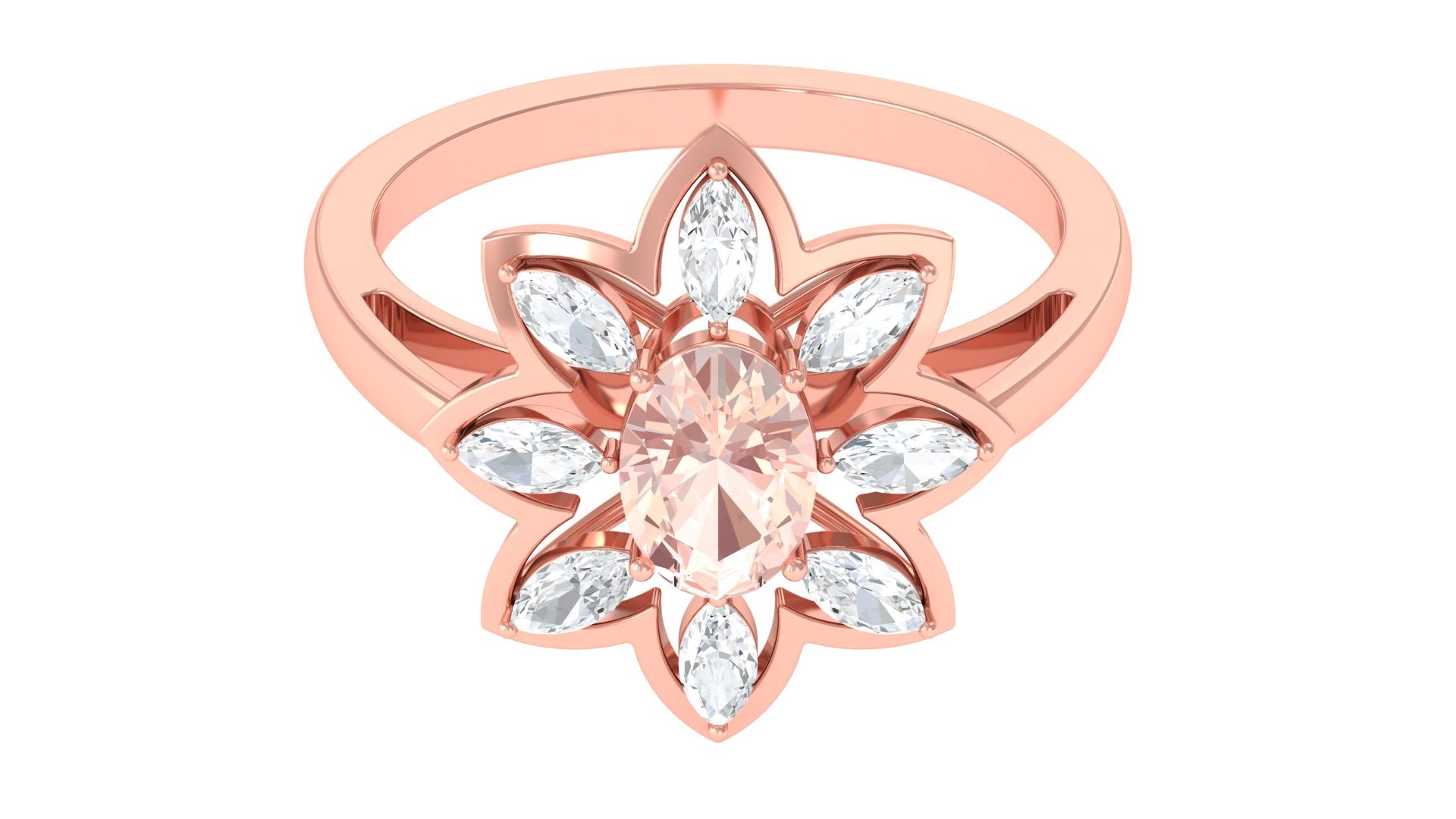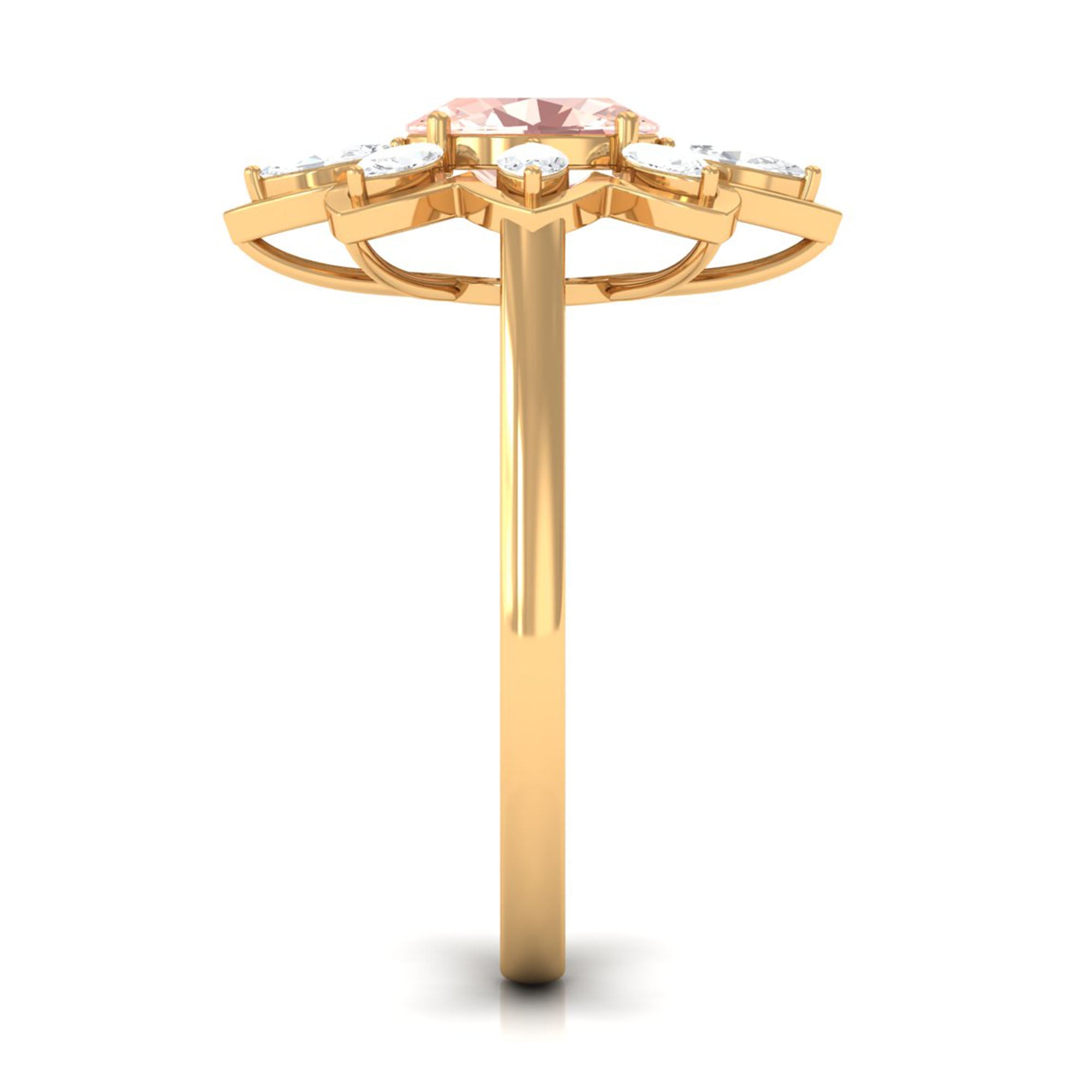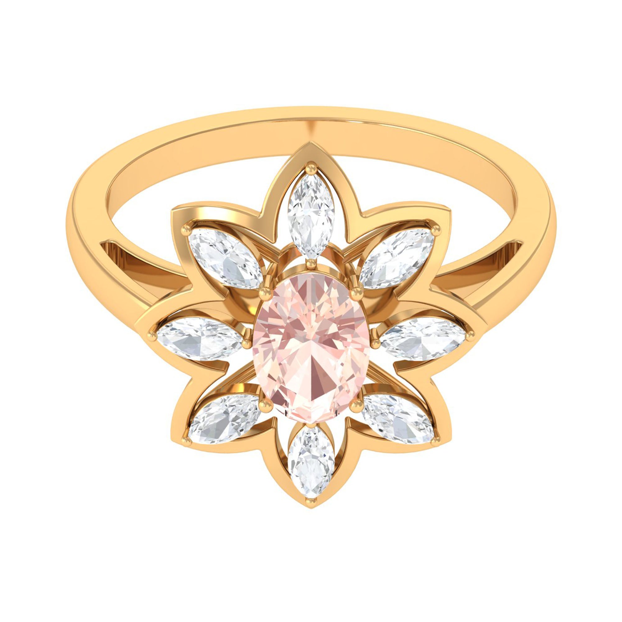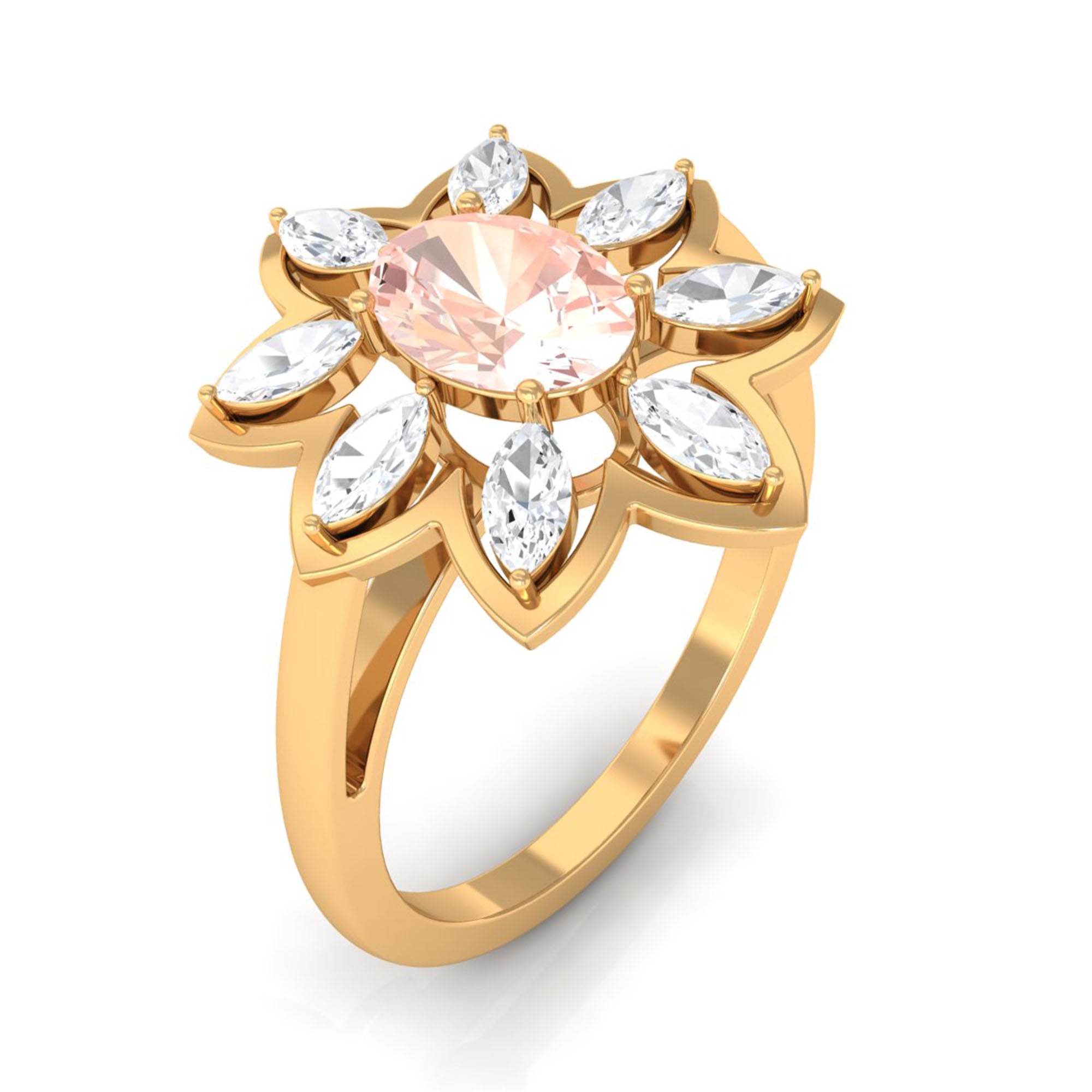 Give happiness with this alluring and adorable Flower Cocktail Ring for your lady love. This Cocktail Ring is embellished with Oval Cut Morganite in a prong setting surrounded by Marquise Cut Moissanite in a 2 prong setting. This Stunning Flower Ring is crafted in Gold Metal. A perfect present for your lady love to make her feel extra special.