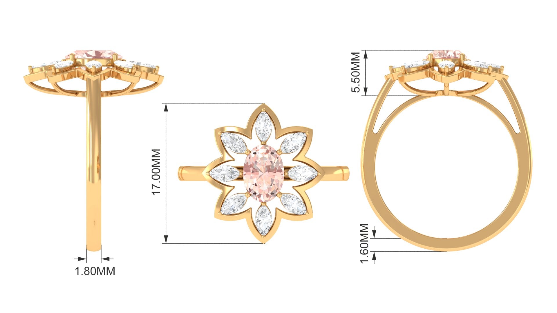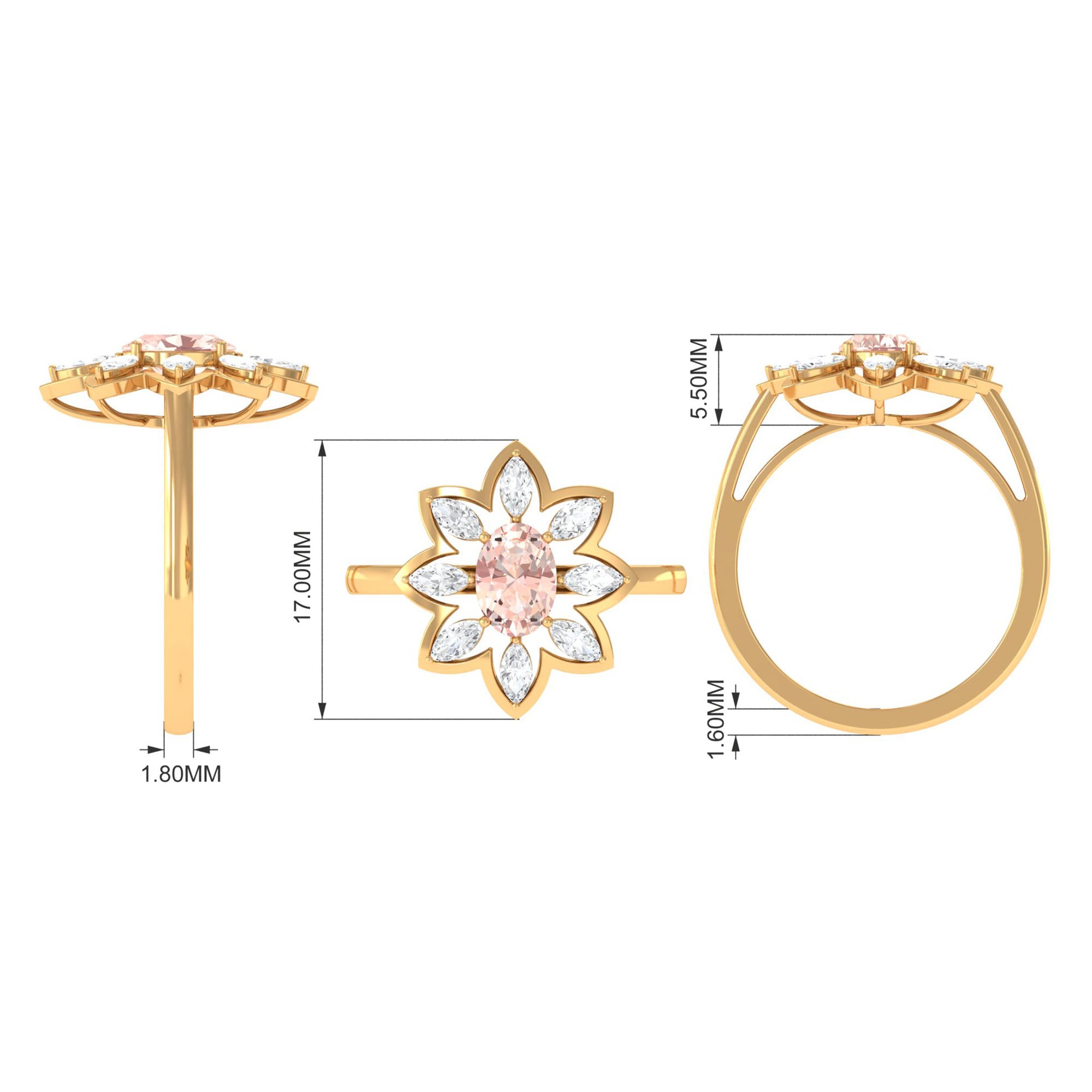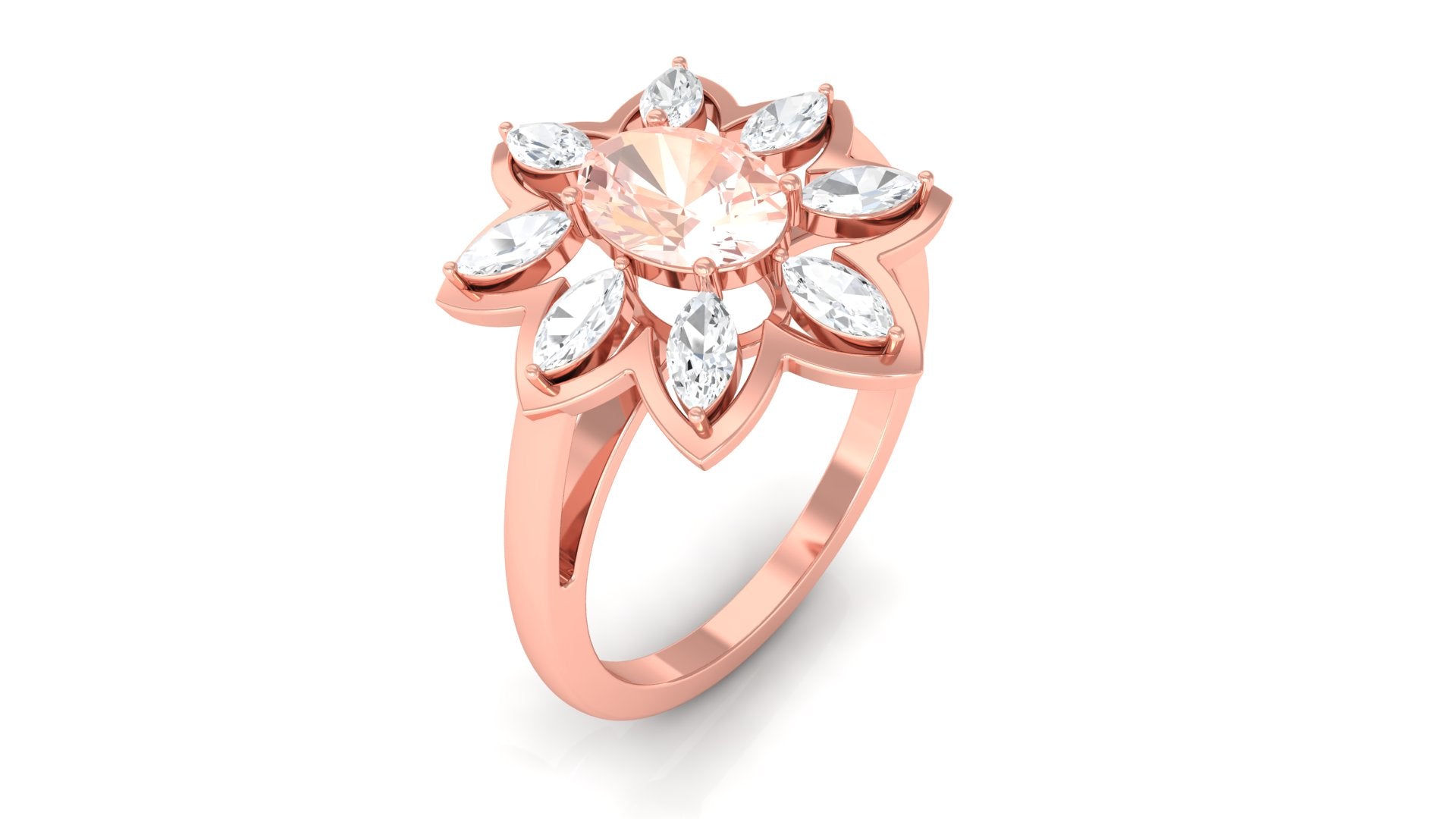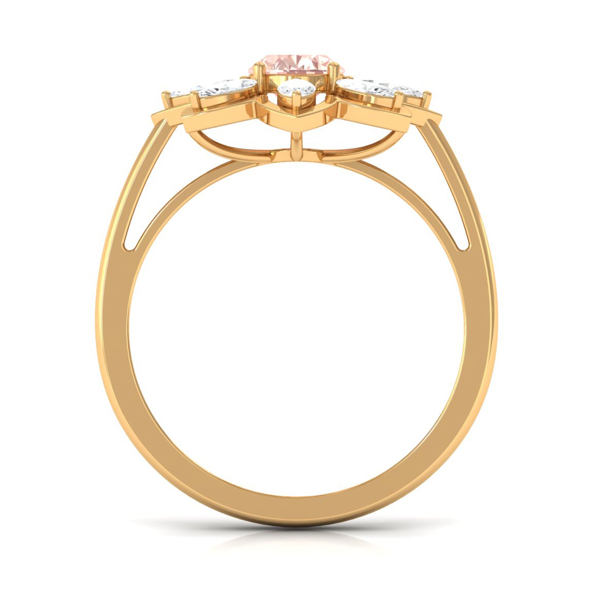 Give happiness with this alluring and adorable Flower Cocktail Ring for your lady love. This Cocktail Ring is embellished with Oval Cut Morganite in a prong setting surrounded by Marquise Cut Moissanite in a 2 prong setting. This Stunning Flower Ring is crafted in Gold Metal. A perfect present for your lady love to make her feel extra special.