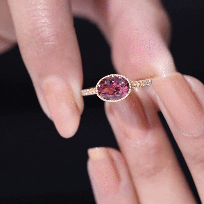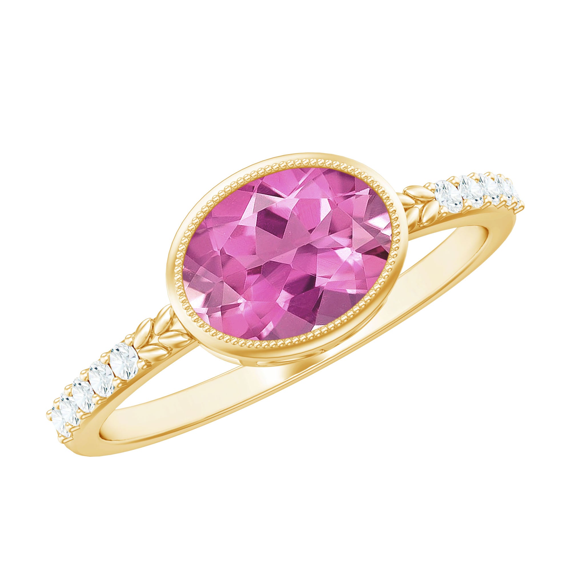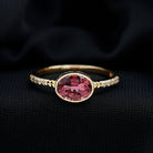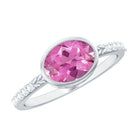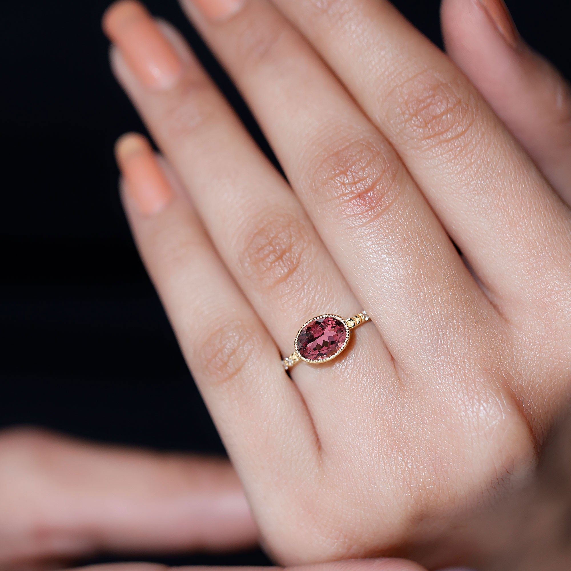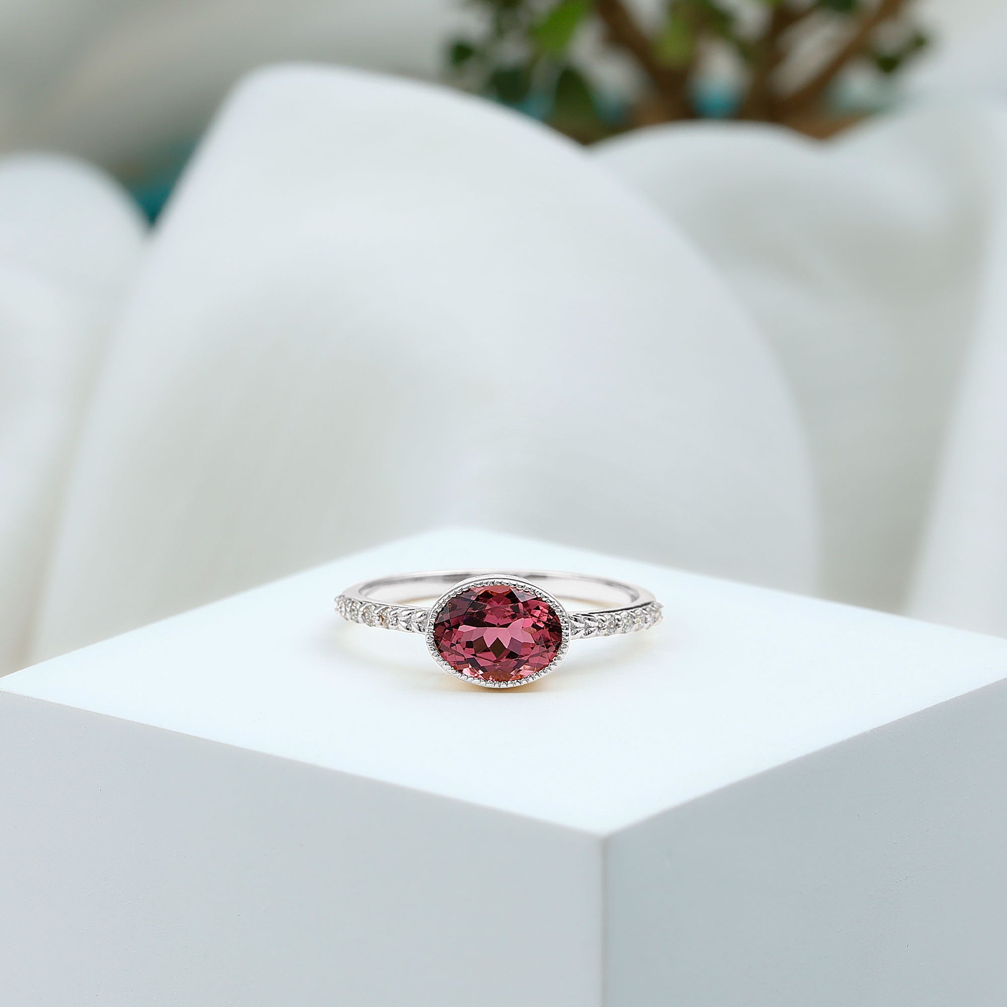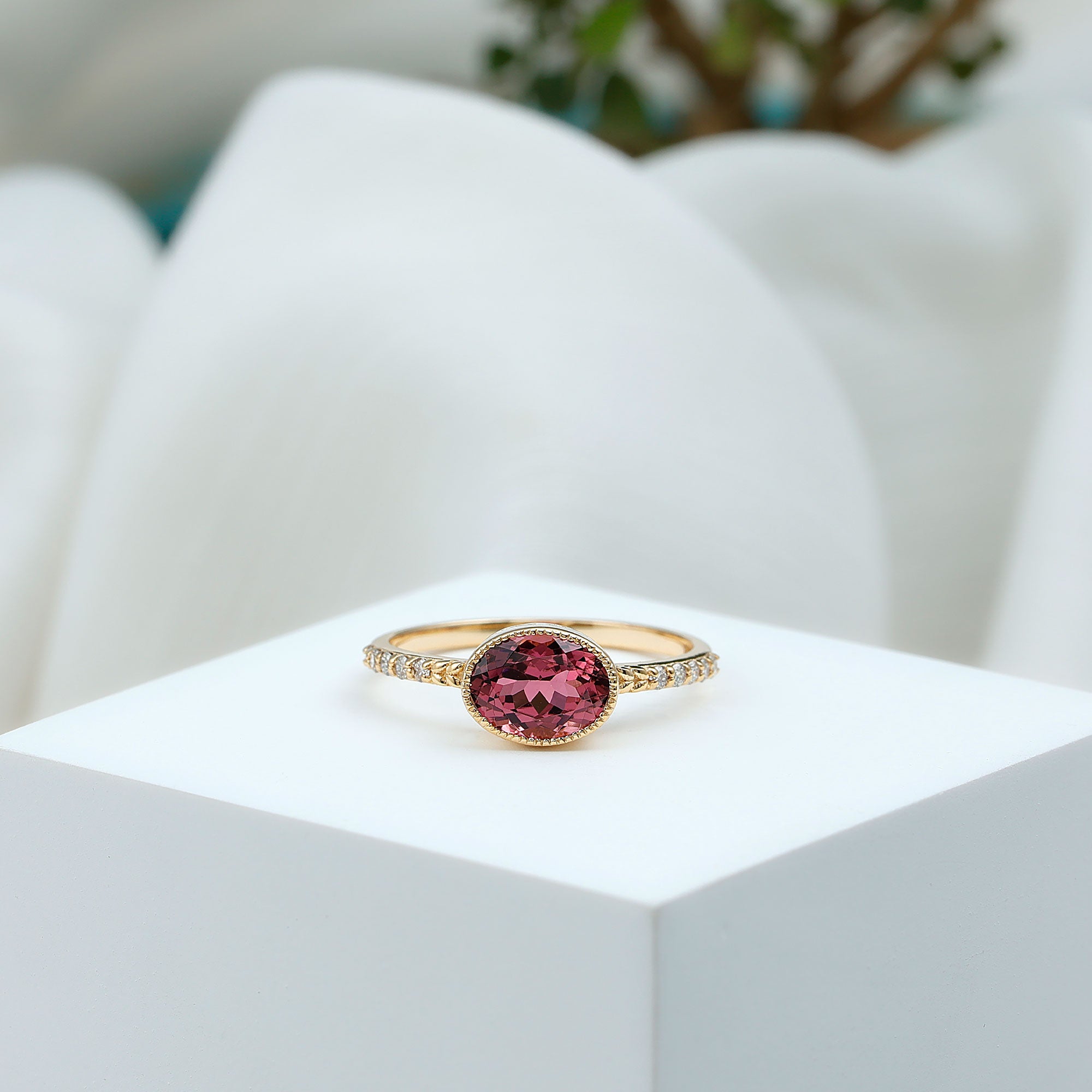 Elevate your love story with this Solitaire Engagement Ring, embellished with a 6X8 MM Oval shape Pink Tourmaline gemstone set horizontally in Bezel Setting with shimmering Diamond Side Stones. Meticulously crafted, it serves as a radiant reminder of cherished moments and the enduring promise that unites two hearts.