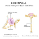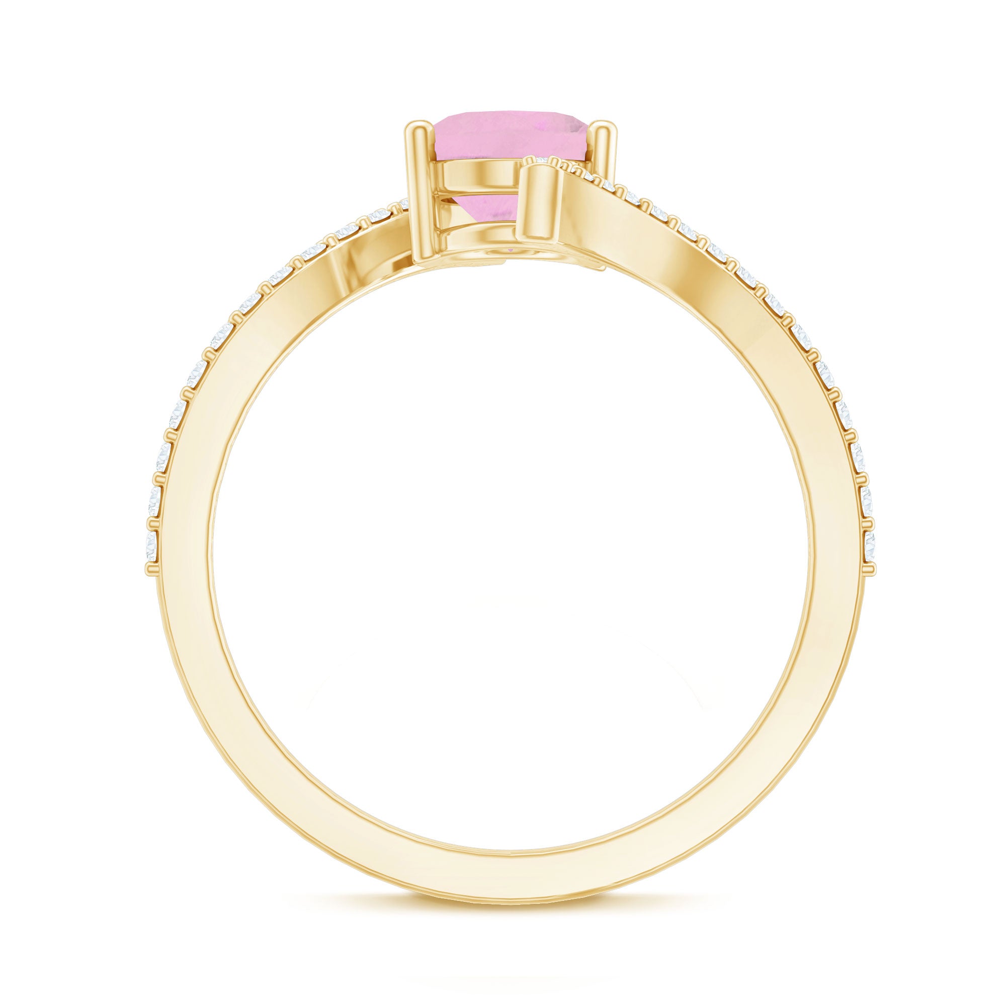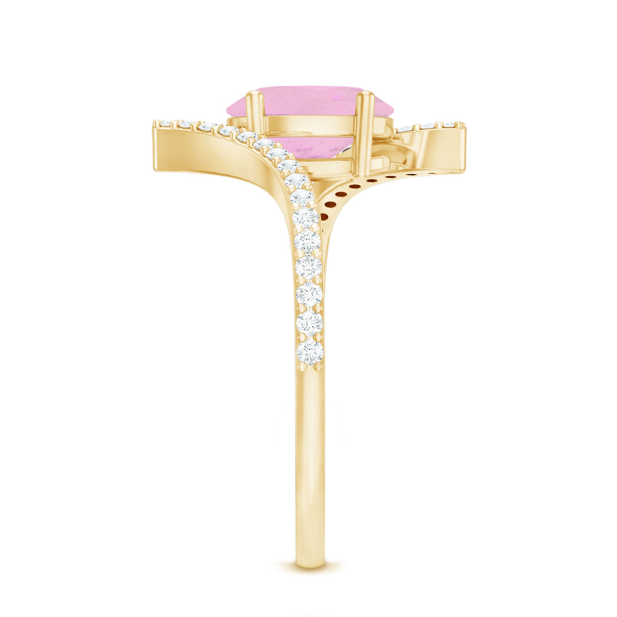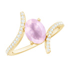The beautiful oval-cut Rose Quartz in a prong setting is the centerpiece of this gold engagement ring. The bypass shank is adorned with sparkling pave-set Diamond that enhances the stunning pink gemstone.