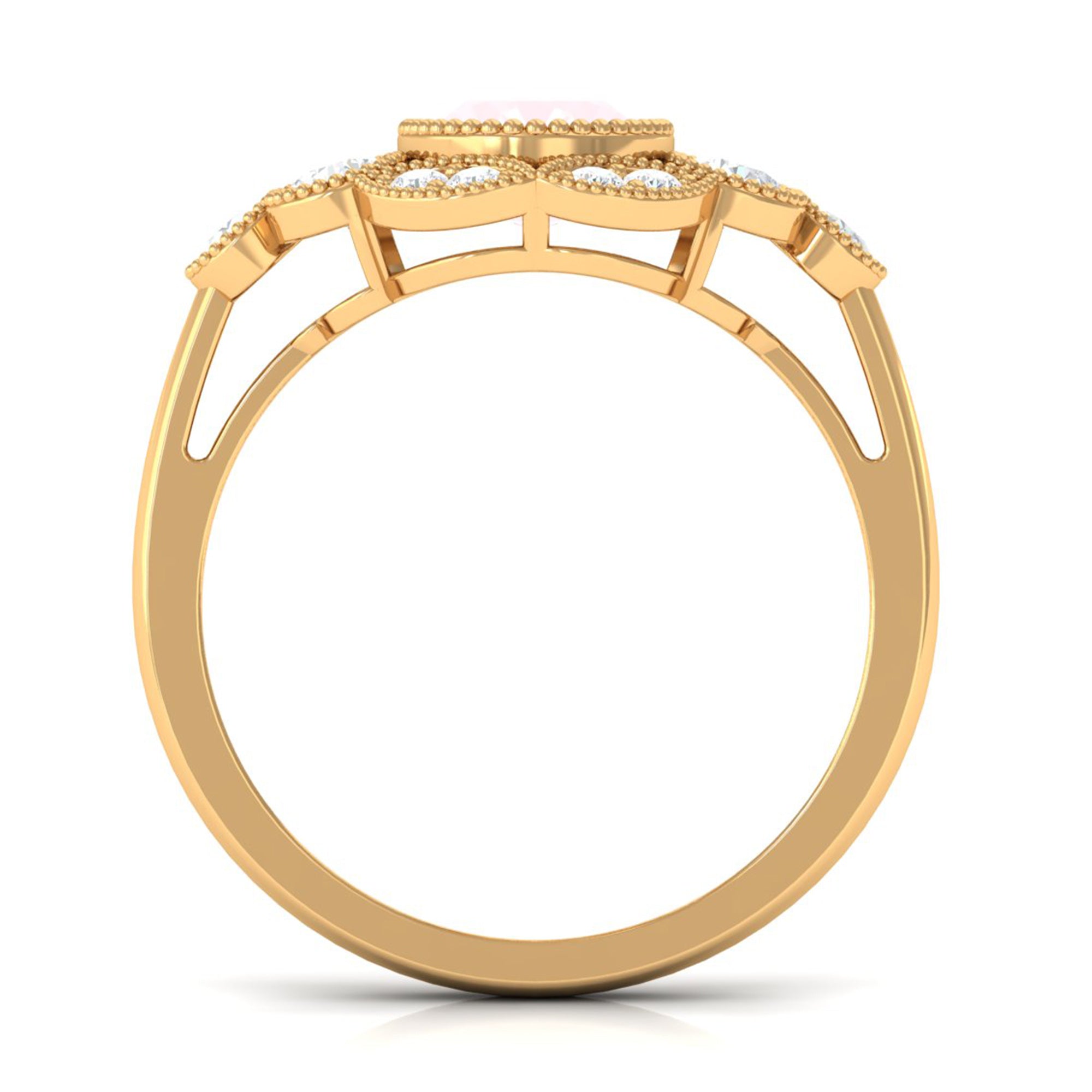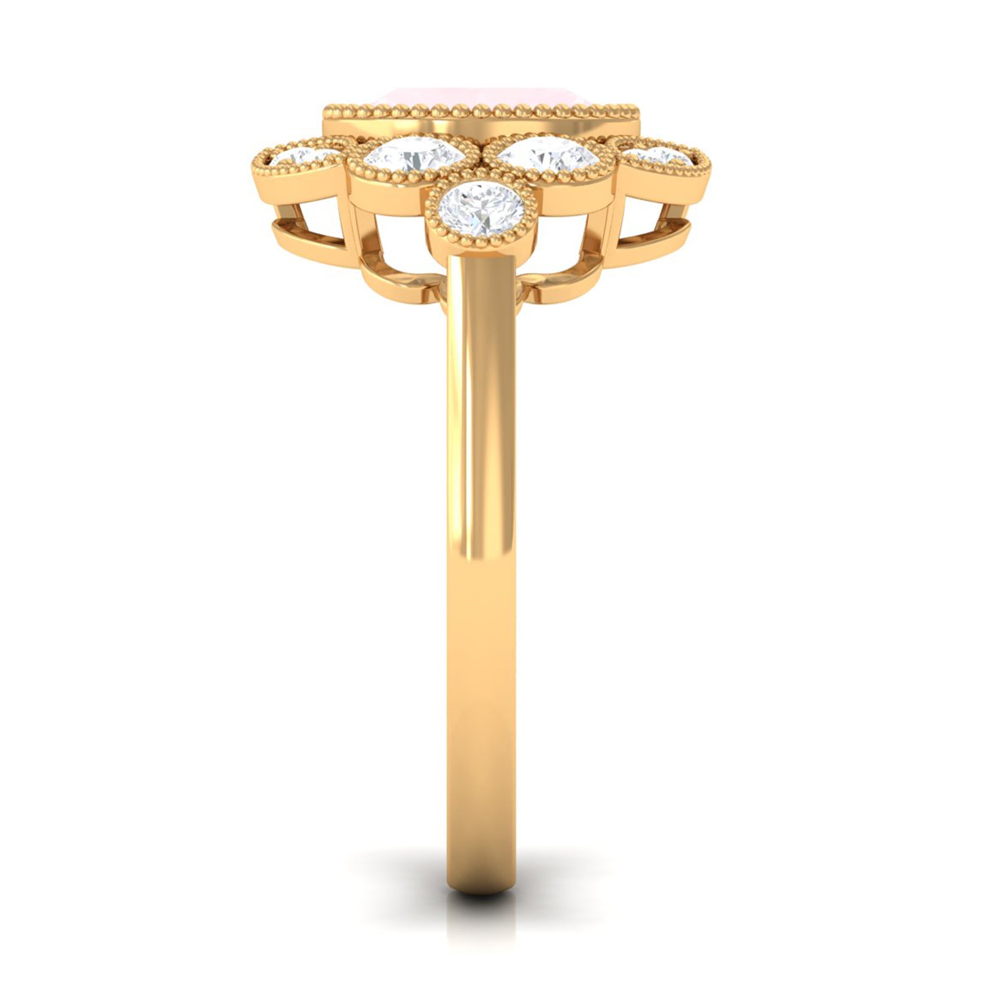Make a grand and unforgettable statement of your love with this breathtaking Statement Engagement Ring. Featuring a dazzling Oval Cut Rose Quartz at the center, surrounded by a halo of shimmering Round Moissanite stones, this ring is an enchanting piece of fine jewelry that will leave your lady overwhelmed. The Gold Beaded Details of the ring add a touch of elegance and sophistication, making it even more exquisite and beautiful. Give this extraordinary Oval Rose Quartz Ring to your special someone and let her know just how much she means to you.