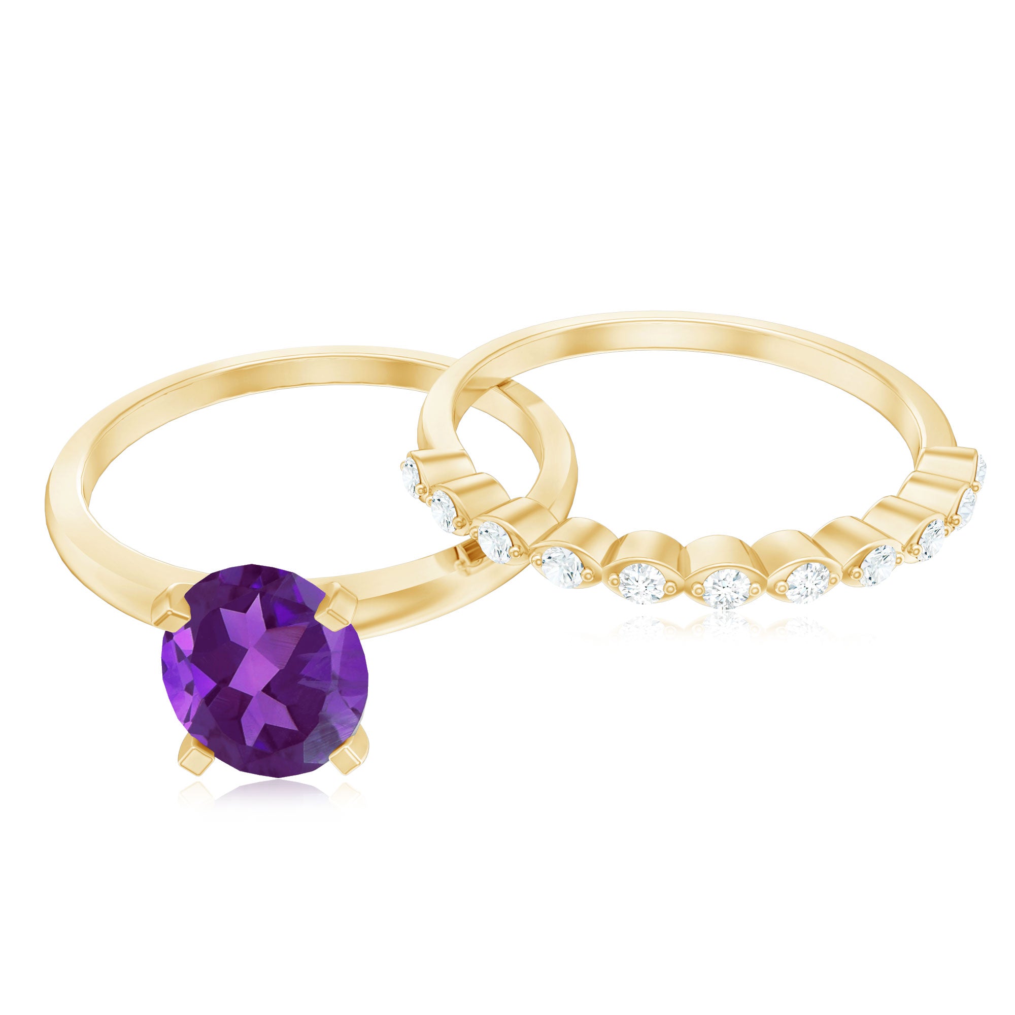 This simple and stunning Solitaire Ring Set is embellished with 6X8 MM Oval Cut Amethyst secured in 4 Prong Setting while more dainty Round Diamond studded on the enhancer ring. The fascinating Amethyst Ring Set makes a wonderful Birthday Gift or an Anniversary Gift for your Wife.