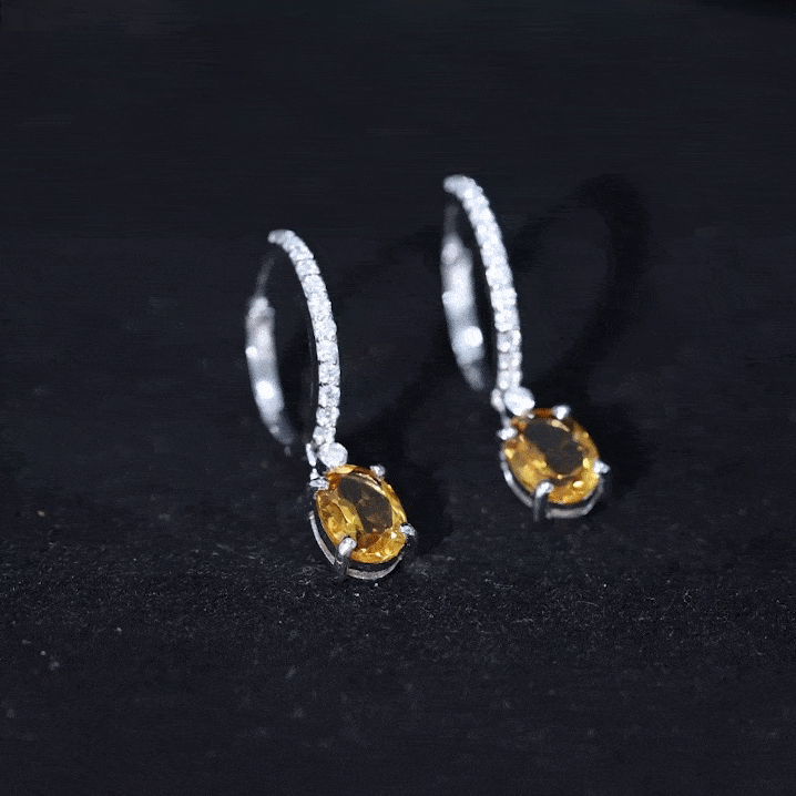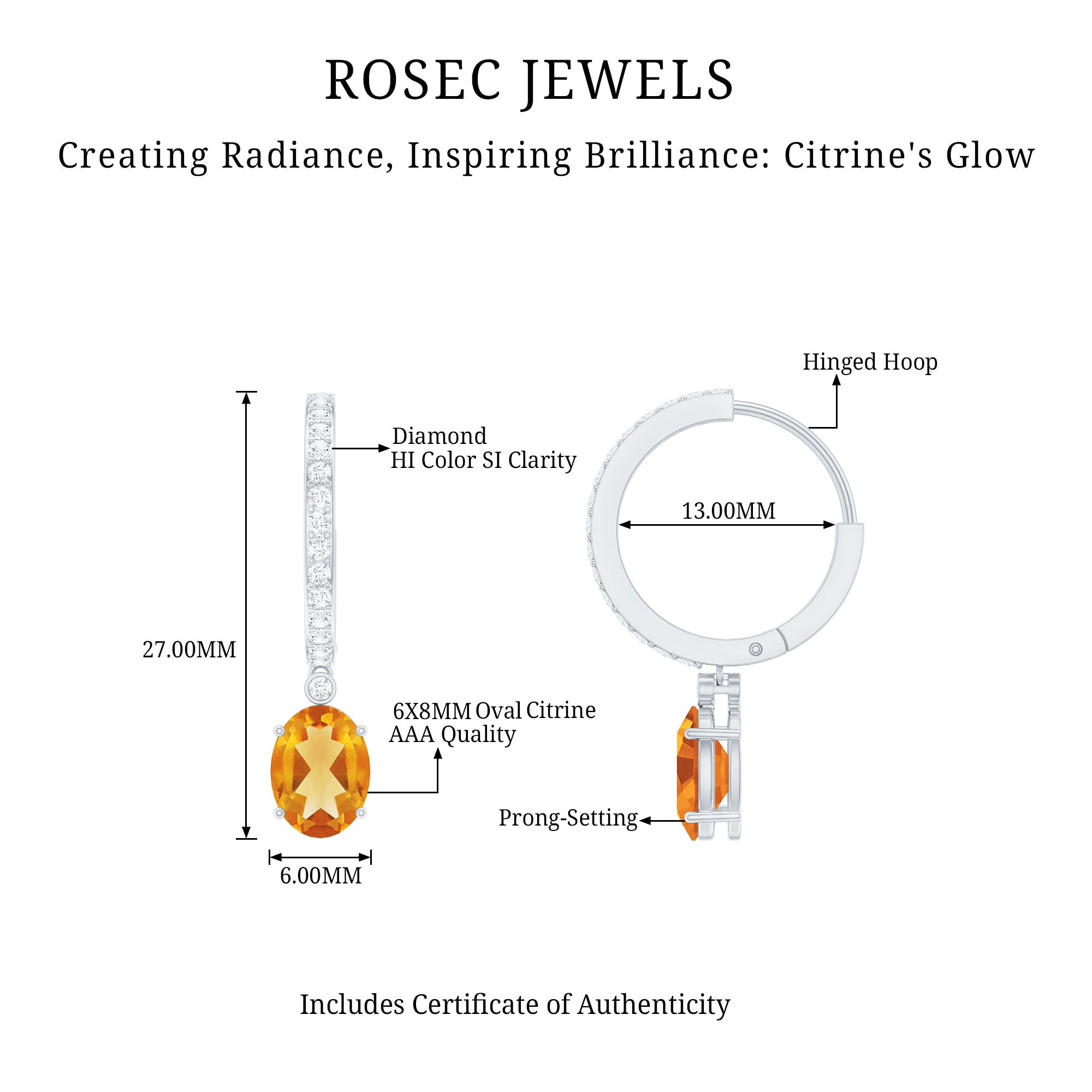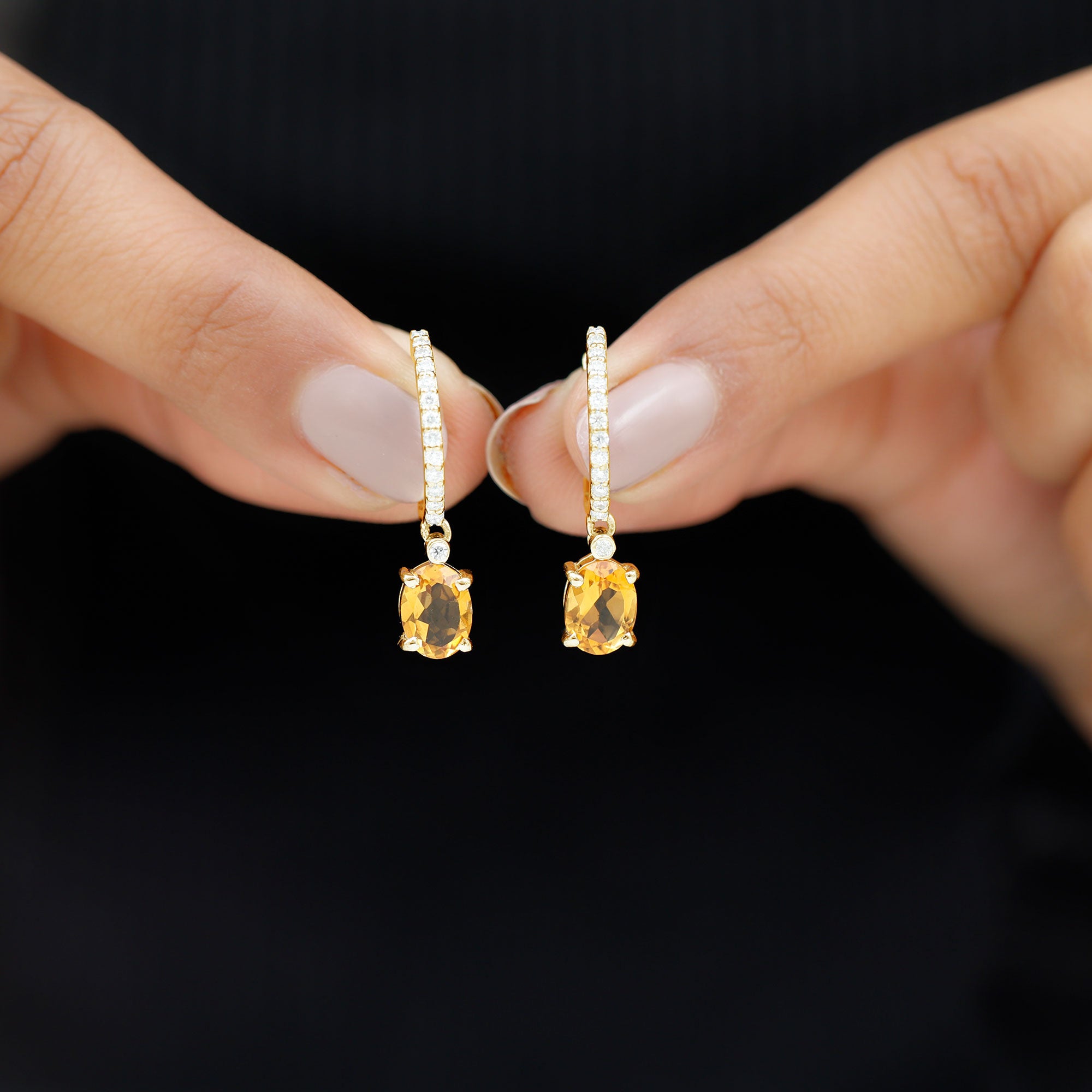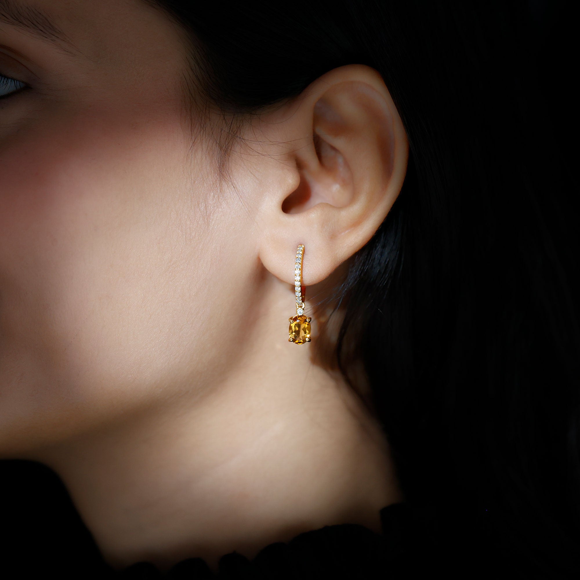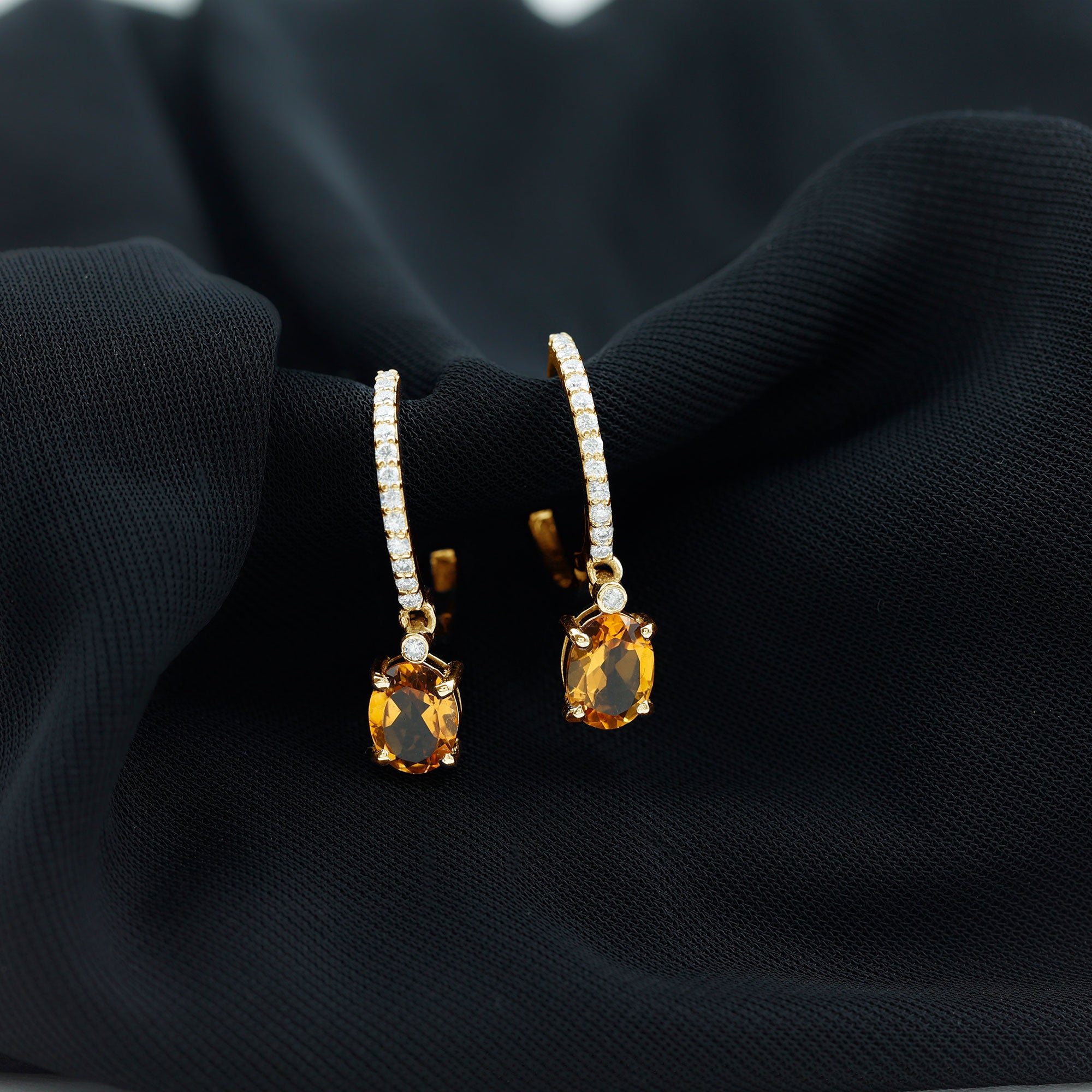 Radiate warmth and elegance with these November Birthstone Drop Earrings. These exquisite earrings capture the essence of 6X8 MM Oval Shape Citrine gemstone set in Prong Setting suspended from a Diamond Hinged Hoop. As the brightening hues of Citrine harmonize with the shimmering Diamond gemstones, these earrings celebrates your unique birth month with timeless style and charm. Elevate your look and spirit with this radiant pair.