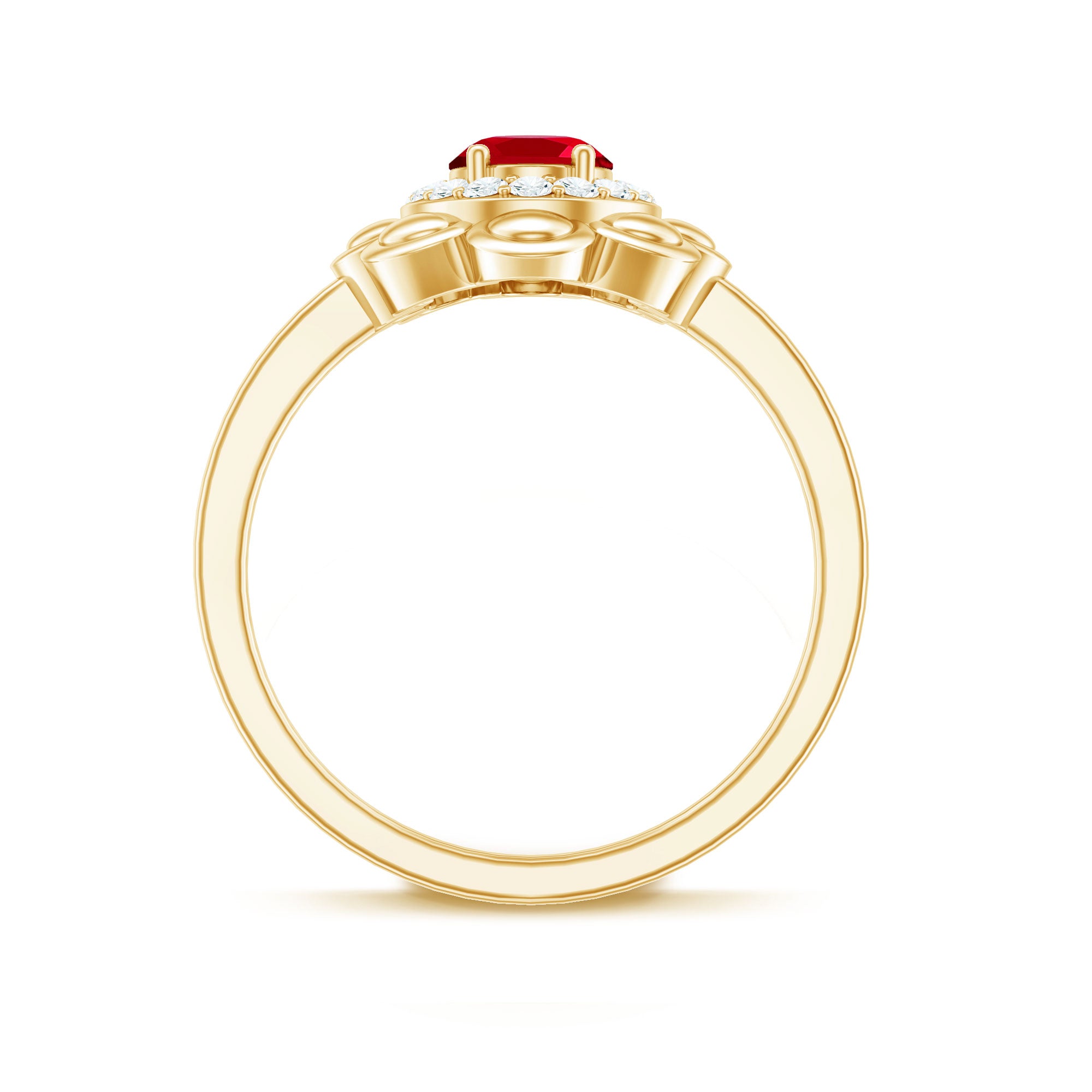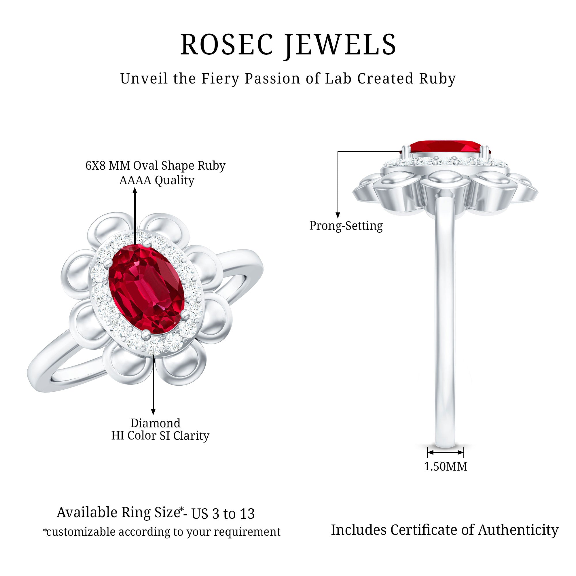 This breathtaking Floral Ring features a 6X8 MM Oval Shape Created Ruby, framed by a delicate floral motif halo of sparkling Diamond gemstones. This enchanting Created Ruby Ring is a symbol of your blooming love, a promise of forever captured in an exquisite design that sparkles with every glance.