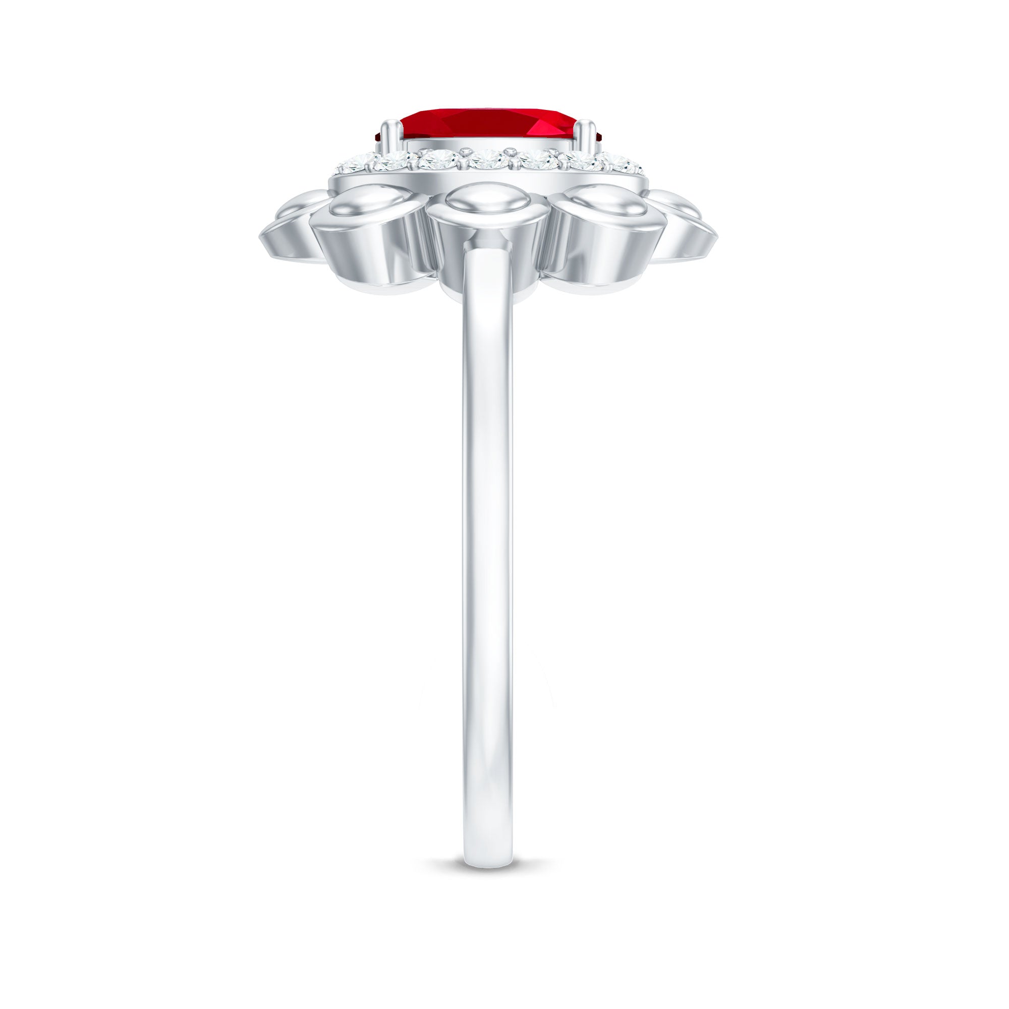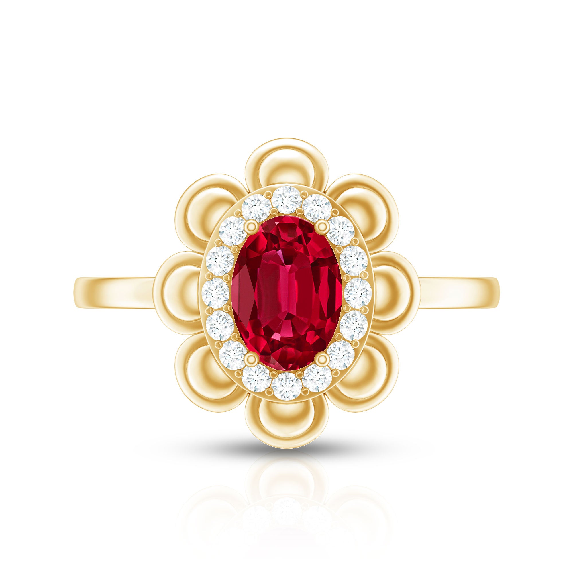 Oval Shape Lab Grown Ruby Floral Ring with Diamond Halo