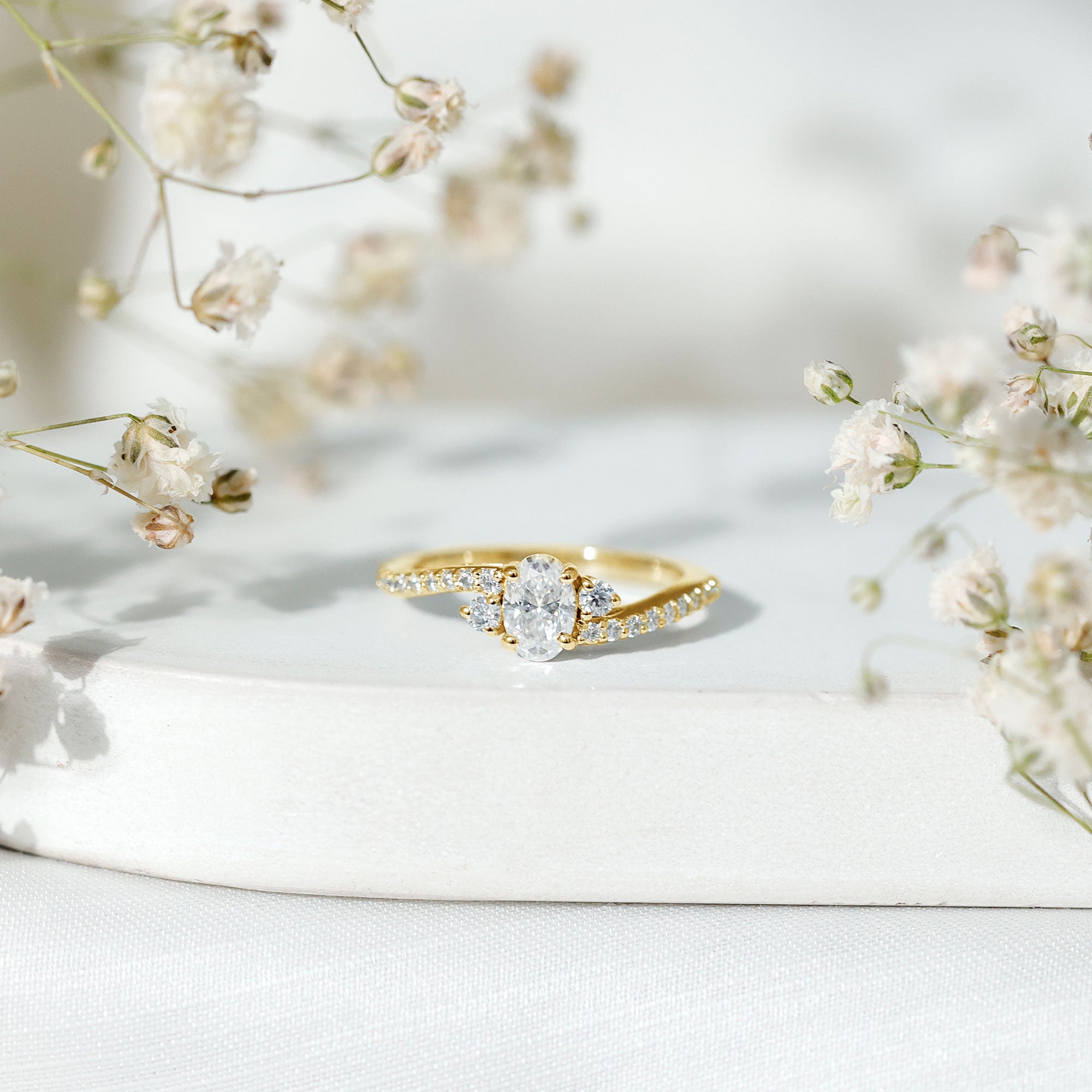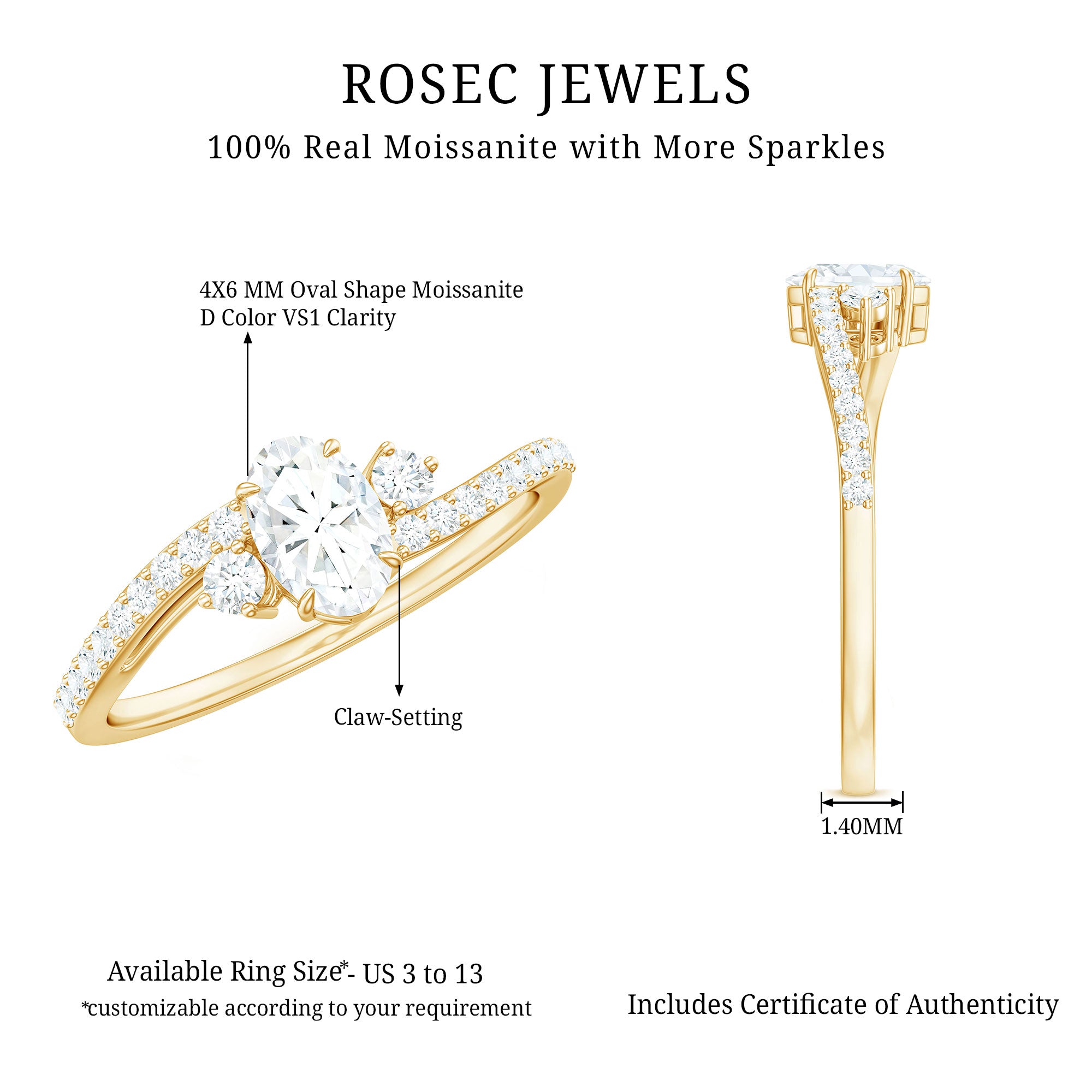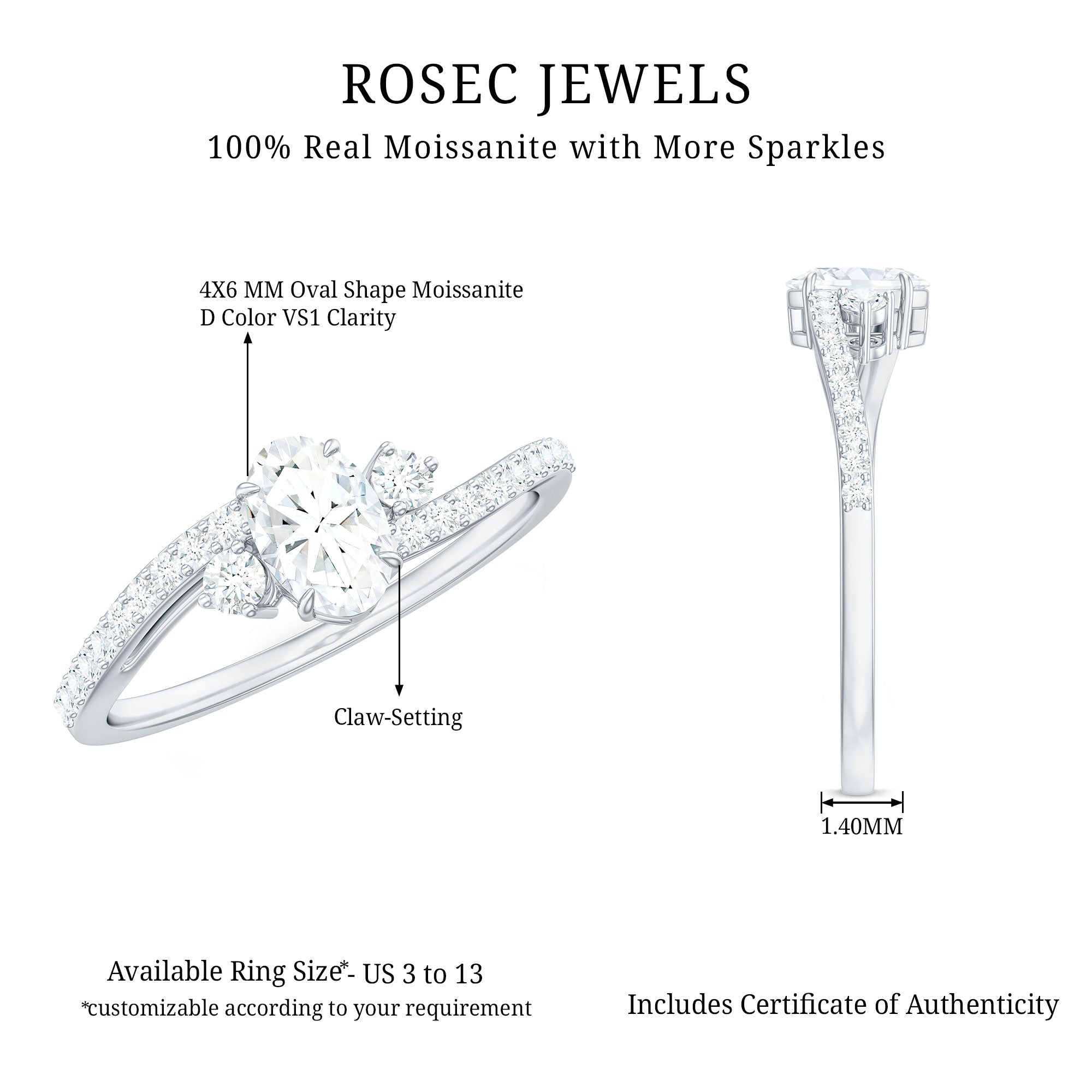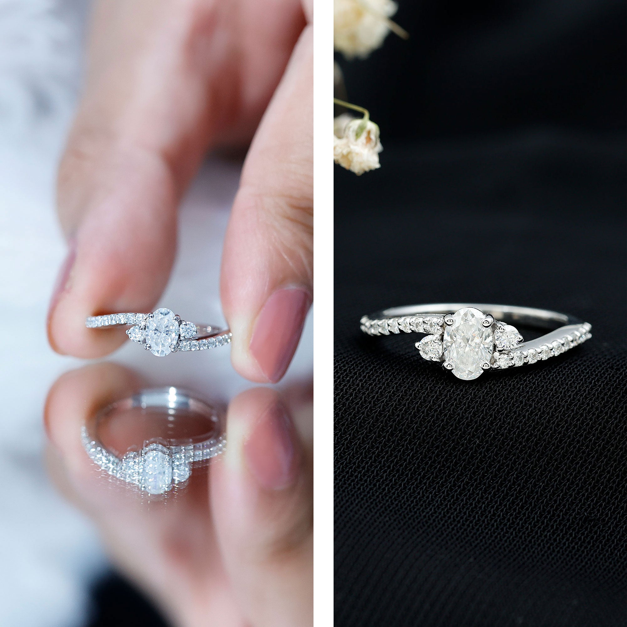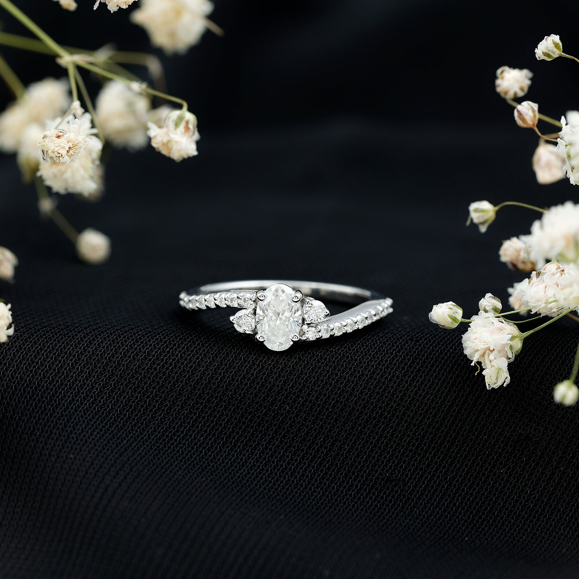 Embrace elegance with the Oval Shape Moissanite Bypass Engagement Ring featuring exquisite side stones. A captivating symbol of your forever love.