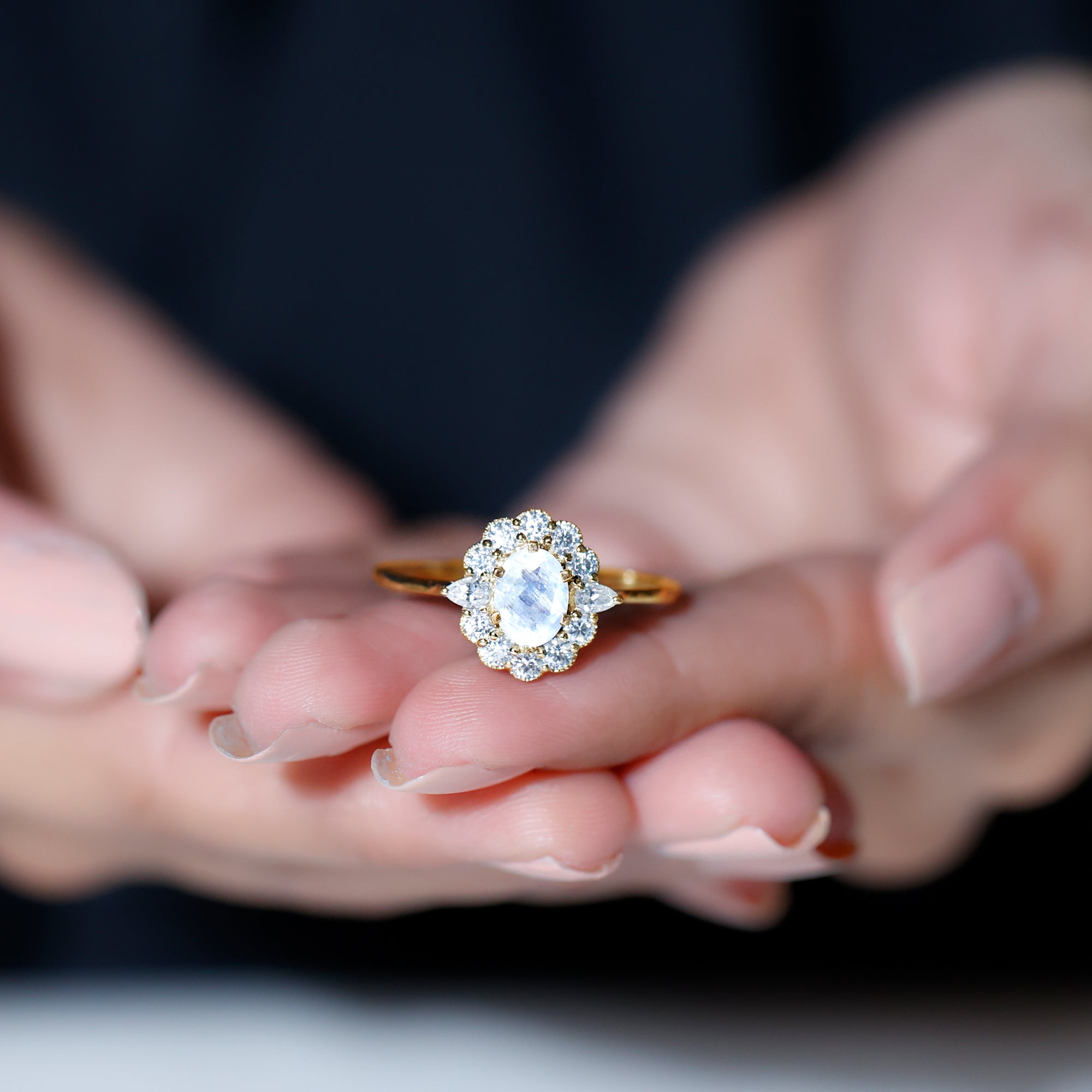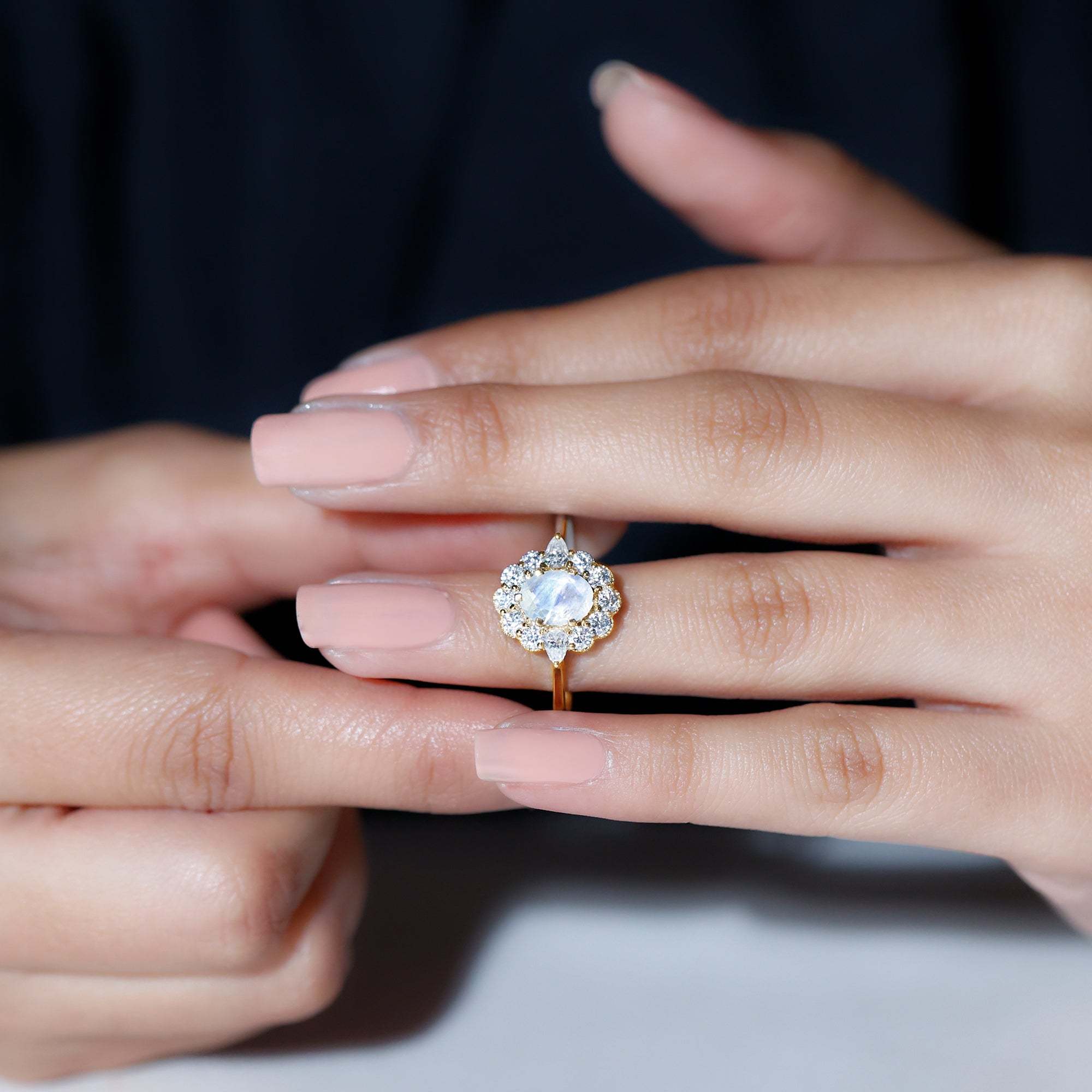 Embrace her bridal ensemble with our Statement Ring, adorned with oval-shaped moonstone in the center wrapped in a halo frame of moissanite exuding a radiant sparkle and brilliance. The exquisite placement of these gemstones embraced by the milgrain design around it makes this Moonstone Ring brilliant. Get this Halo Ring to illuminate your special moments and make them unforgettable.