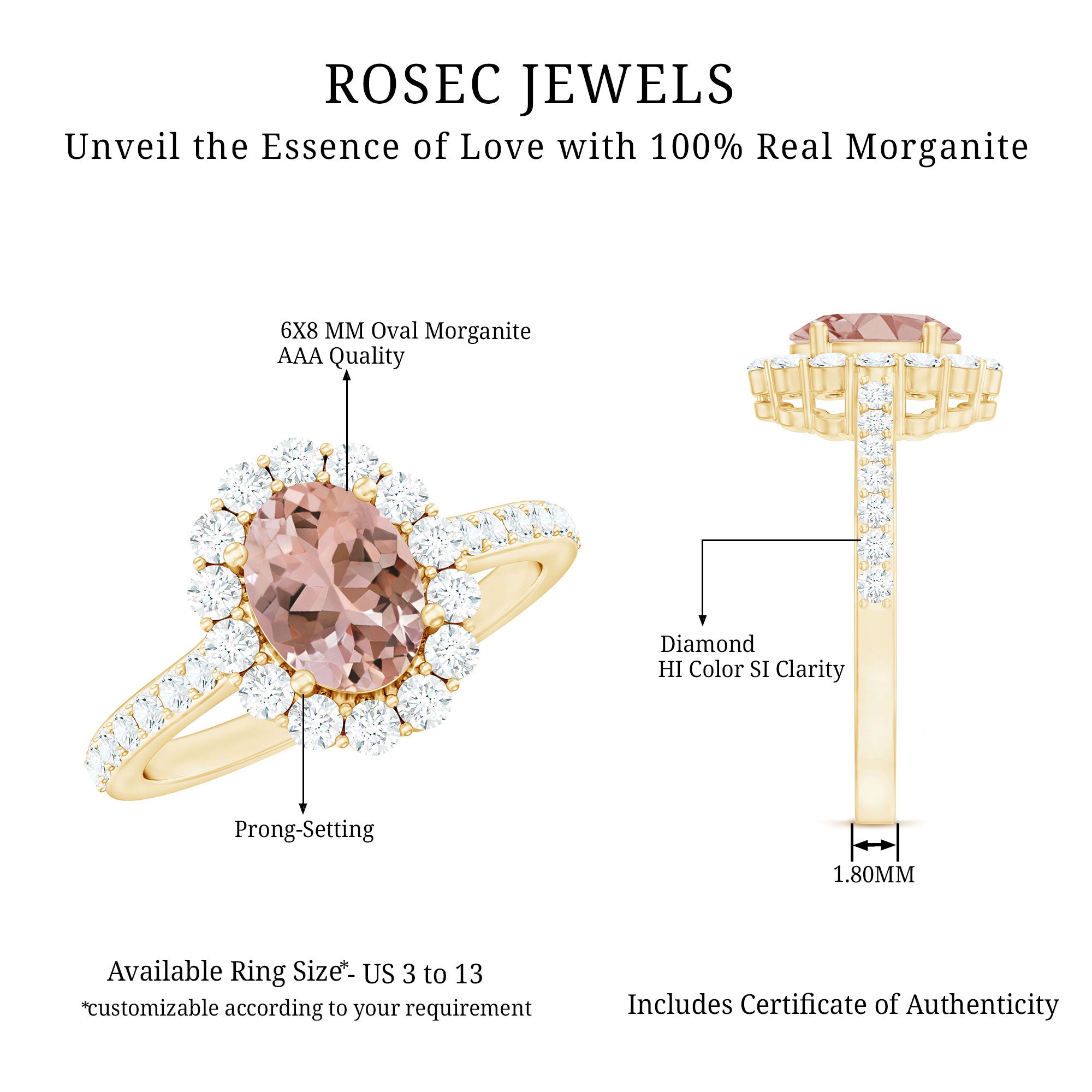 Make a statement with our unique Engagement Ring, featuring a stunning 6X8 MM Oval Shape Morganite set in Prong Setting that takes the center stage, highlighted by Diamond Halo and Side Stones. This Engagement Ring is the perfect way to add a touch of elegance and sophistication to any special occasion.